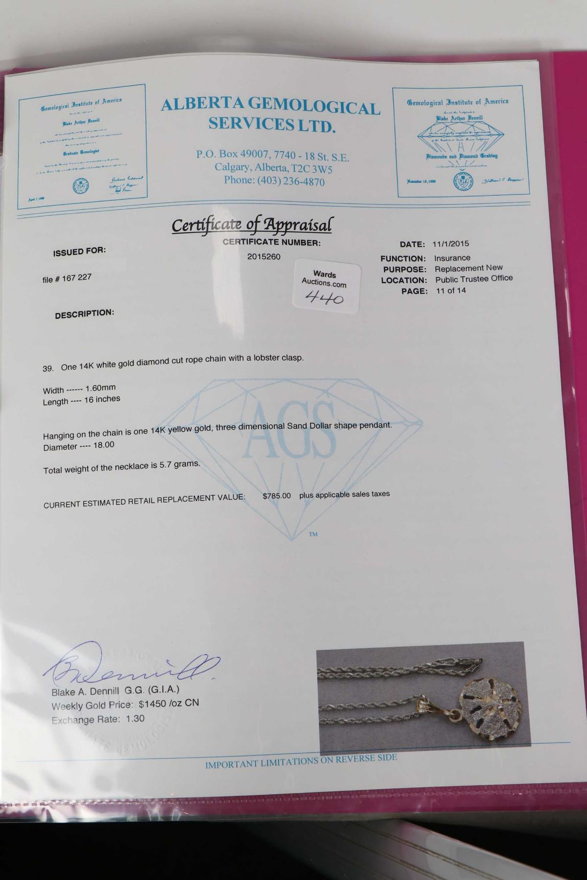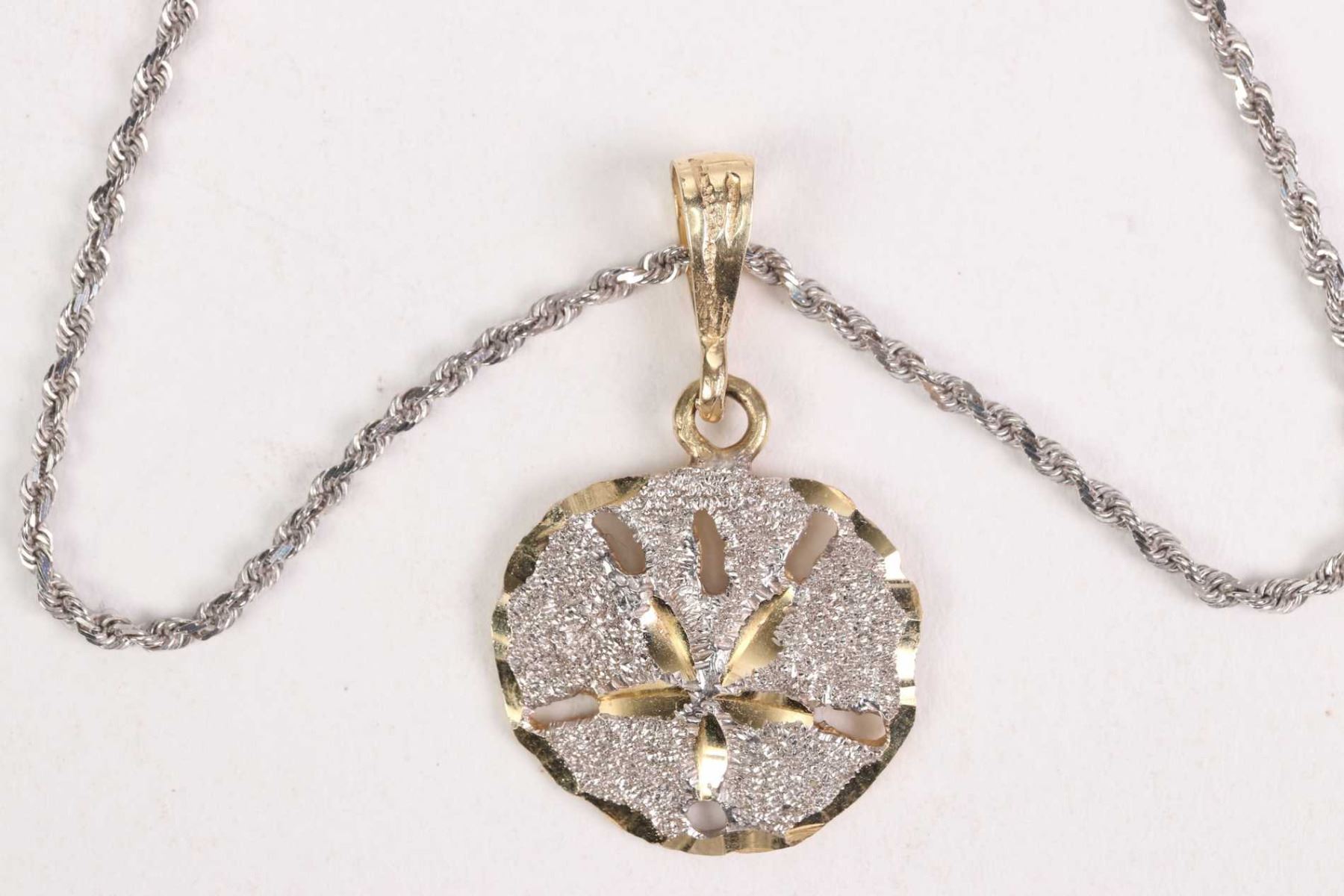 14kt white gold 16" rope chain and a 14kt hewllog gold three dimensional sand dollar pendant. Retail replacment value $ 785.00