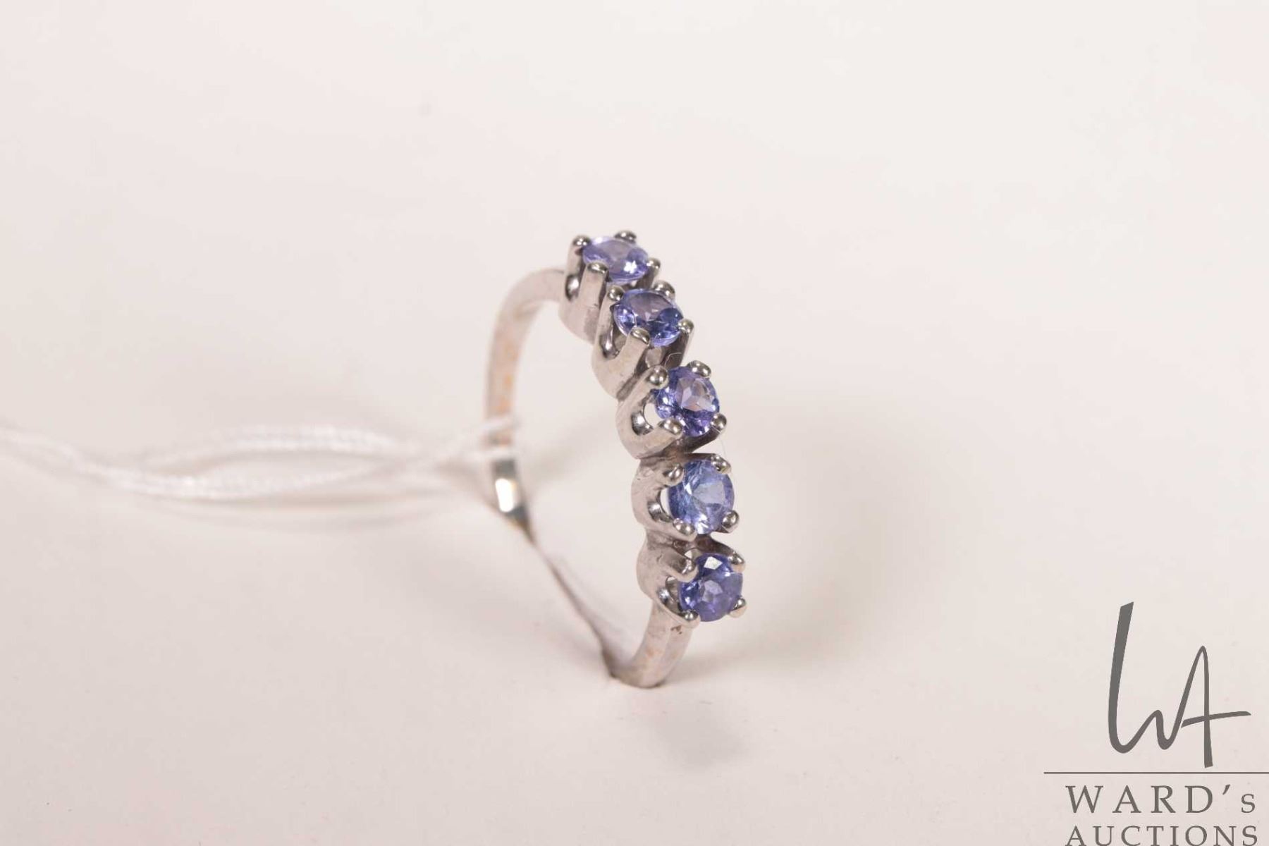 14kt white gold ring set with five tanzanite gemstones, size 10.25