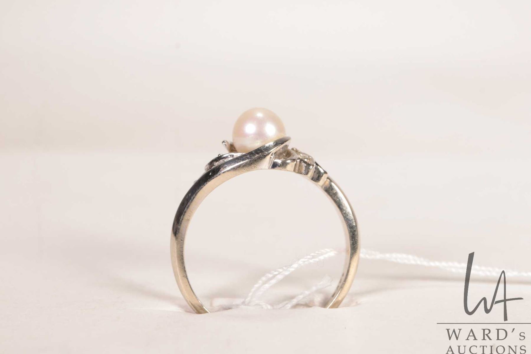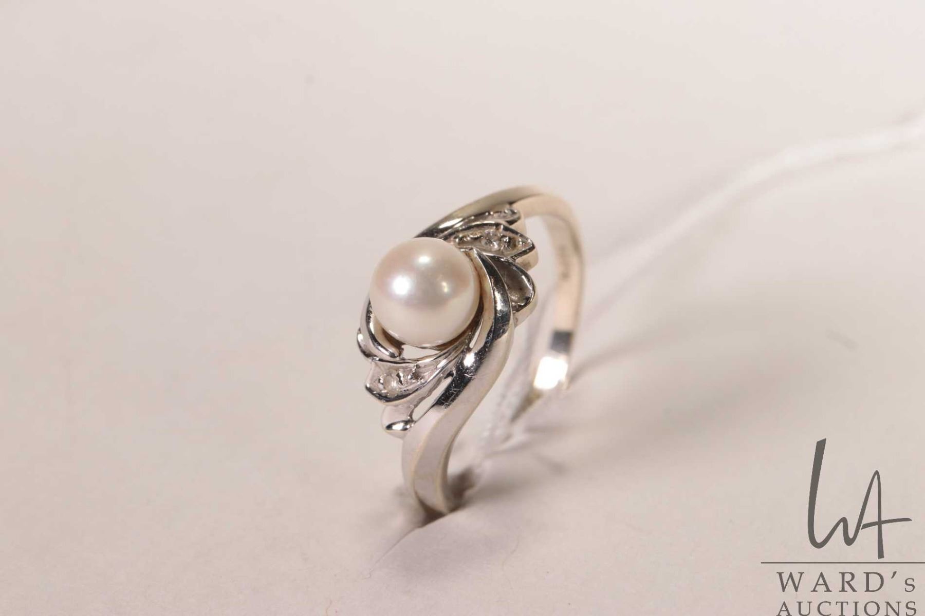 14kt white gold ring set with genuine pearls and small accent diamonds, size 8