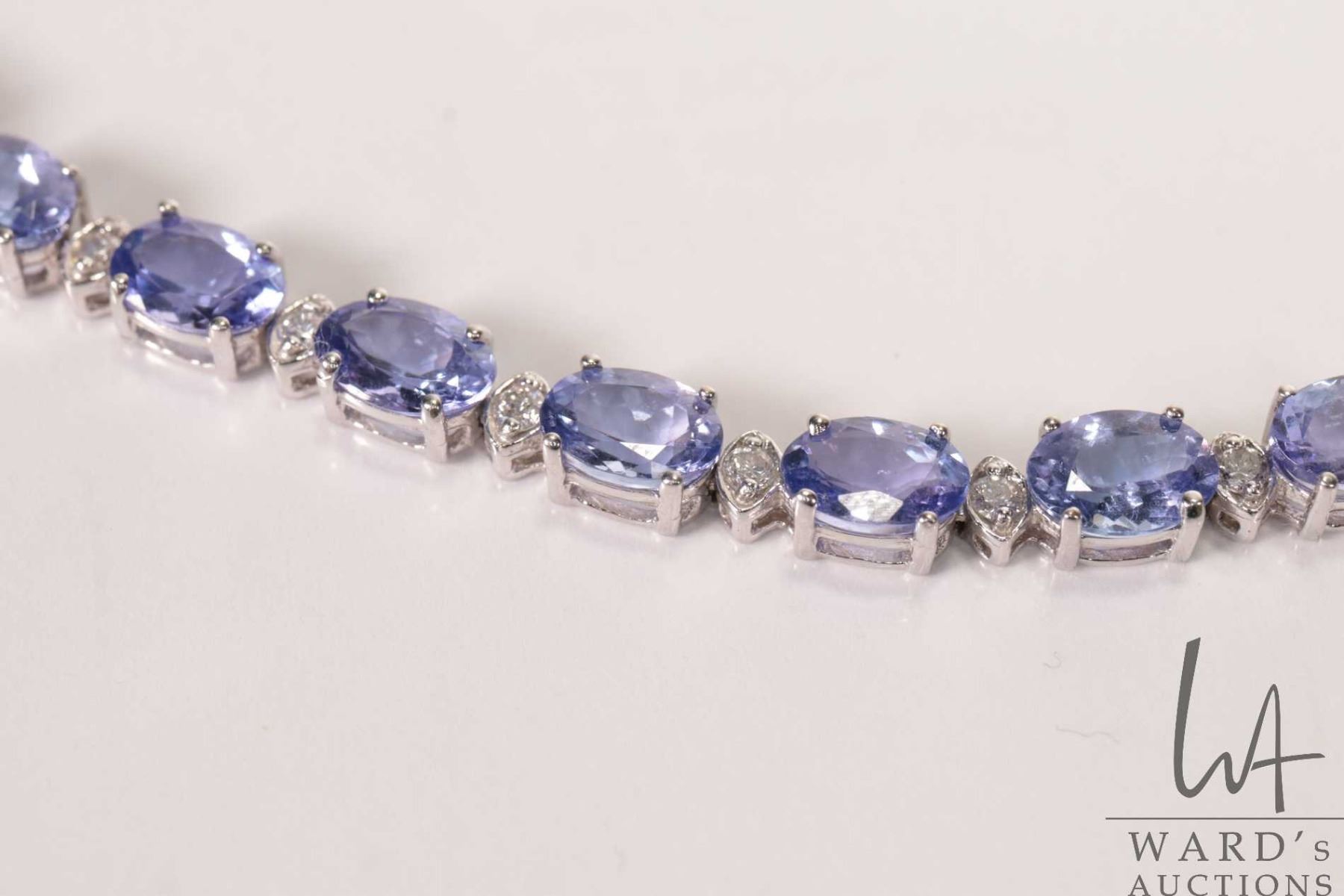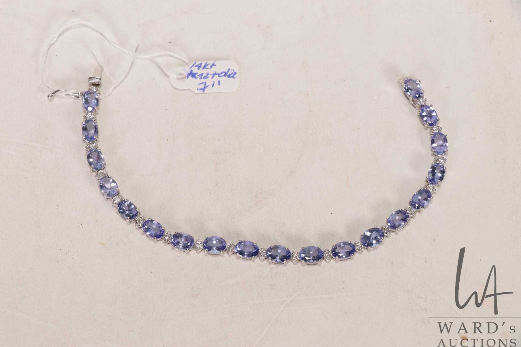 14kt white gold, tanzanite and diamond bracelet. Set with 13.25 cts of oval mixed cut tanzanite gems