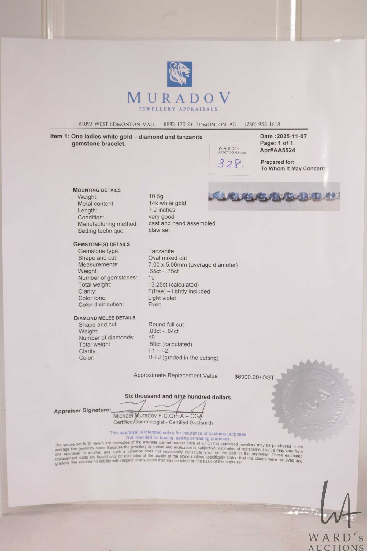 14kt white gold, tanzanite and diamond bracelet. Set with 13.25 cts of oval mixed cut tanzanite gemstone and .60ct of round full cut diamonds. Retail replacement value $6,900.00