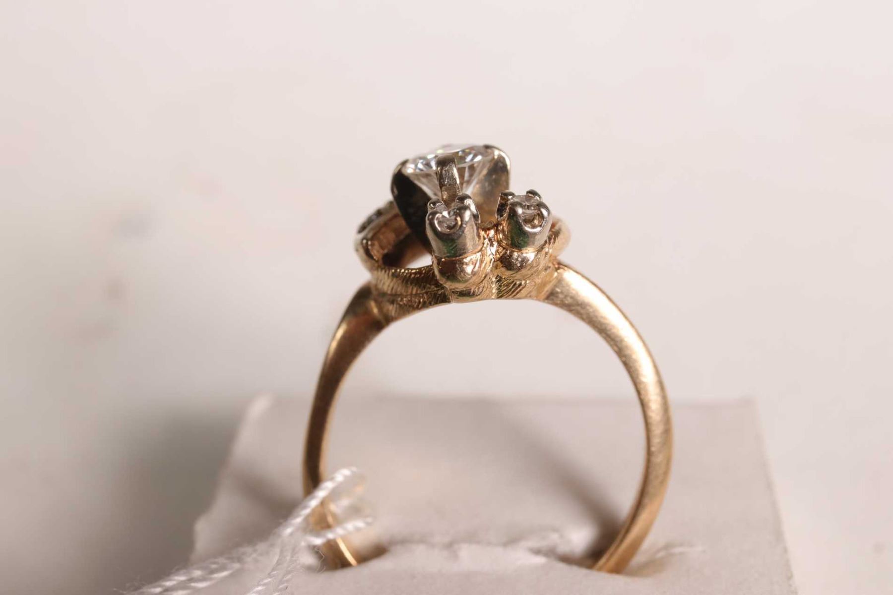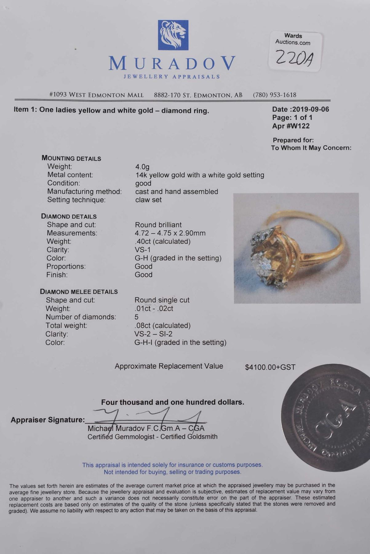 14kt yellow and white gold diamond ring set with .40ct brilliant white round center diamond and .08cts of accent diamonds. Retail replacement $4,100.00