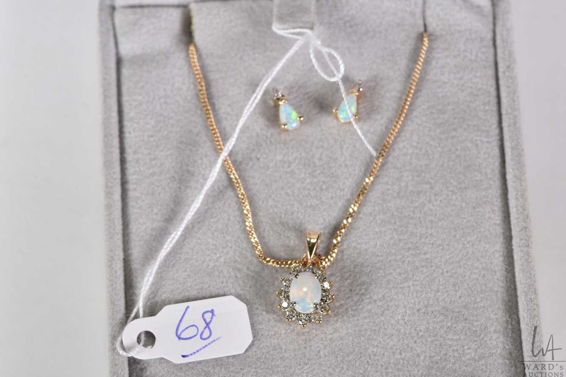 14kt yellow and white gold opal and diamond pendant set with .45ct oval cabochon white opal gemstone and .18ct of white round full cut diamonds. Retail replacement value $1,600.00 plus a pair of co-ordinating 14kt yellow gold, opal and diamond earrings which have not been appraised