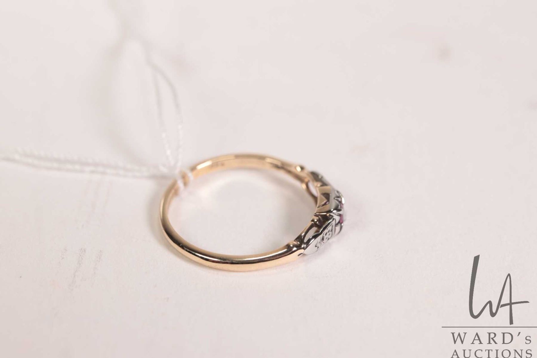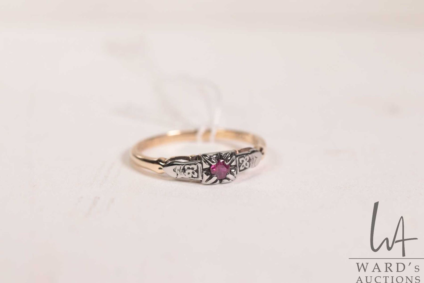 14kt yellow and white gold ring set with synthetic ruby gemstone, 1.6 grams, size 6.25