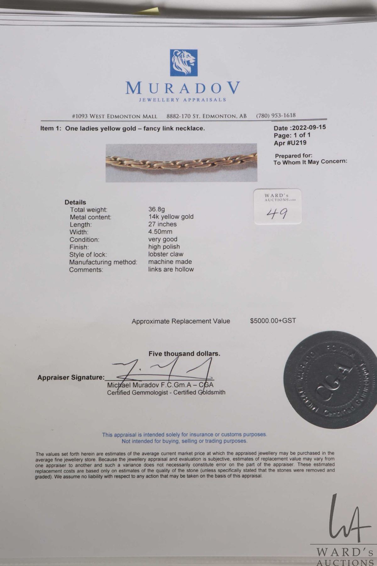 14kt yellow gold fancy link necklace, 27" in length. Retail replacement value $5,000.00