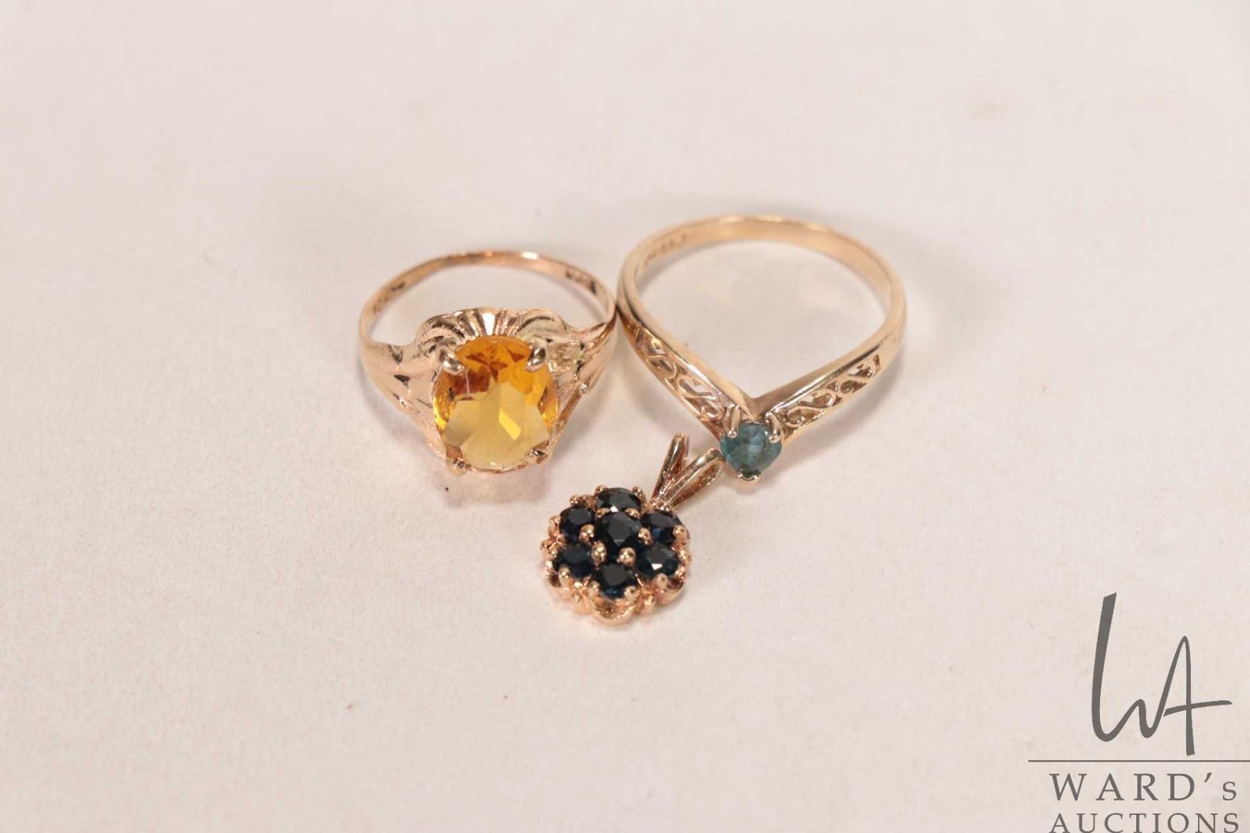14kt yellow gold pendant set with blue sapphires and two gemstone set 10kt yellow gold rings