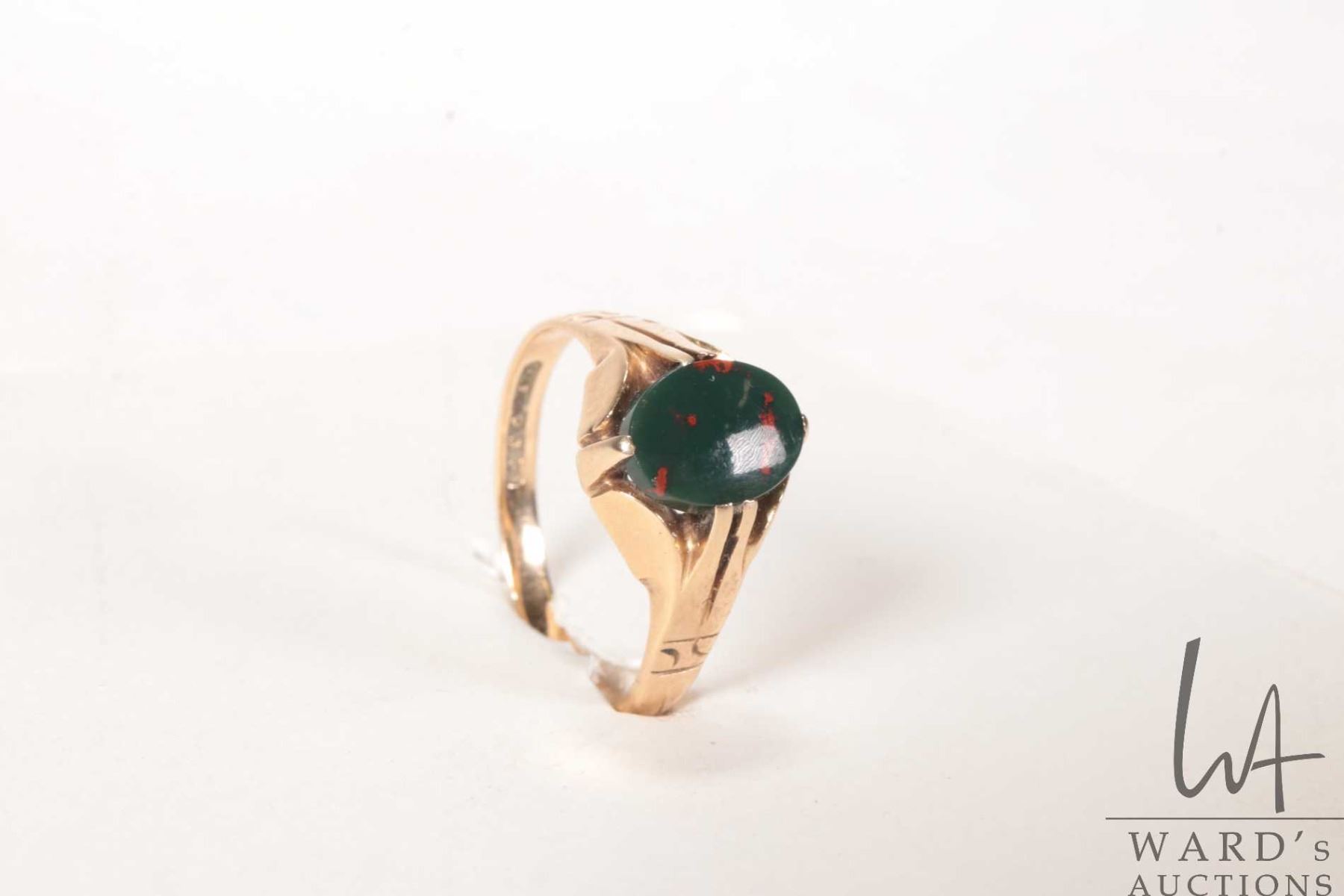 14kt yellow gold ring set with center bloodstone gemstone, size 7.25