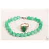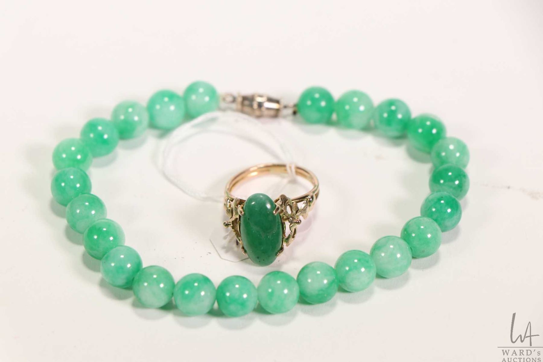 14kt yellow gold ring set with jade cabochon oval and a green jadeite beaded bracelet