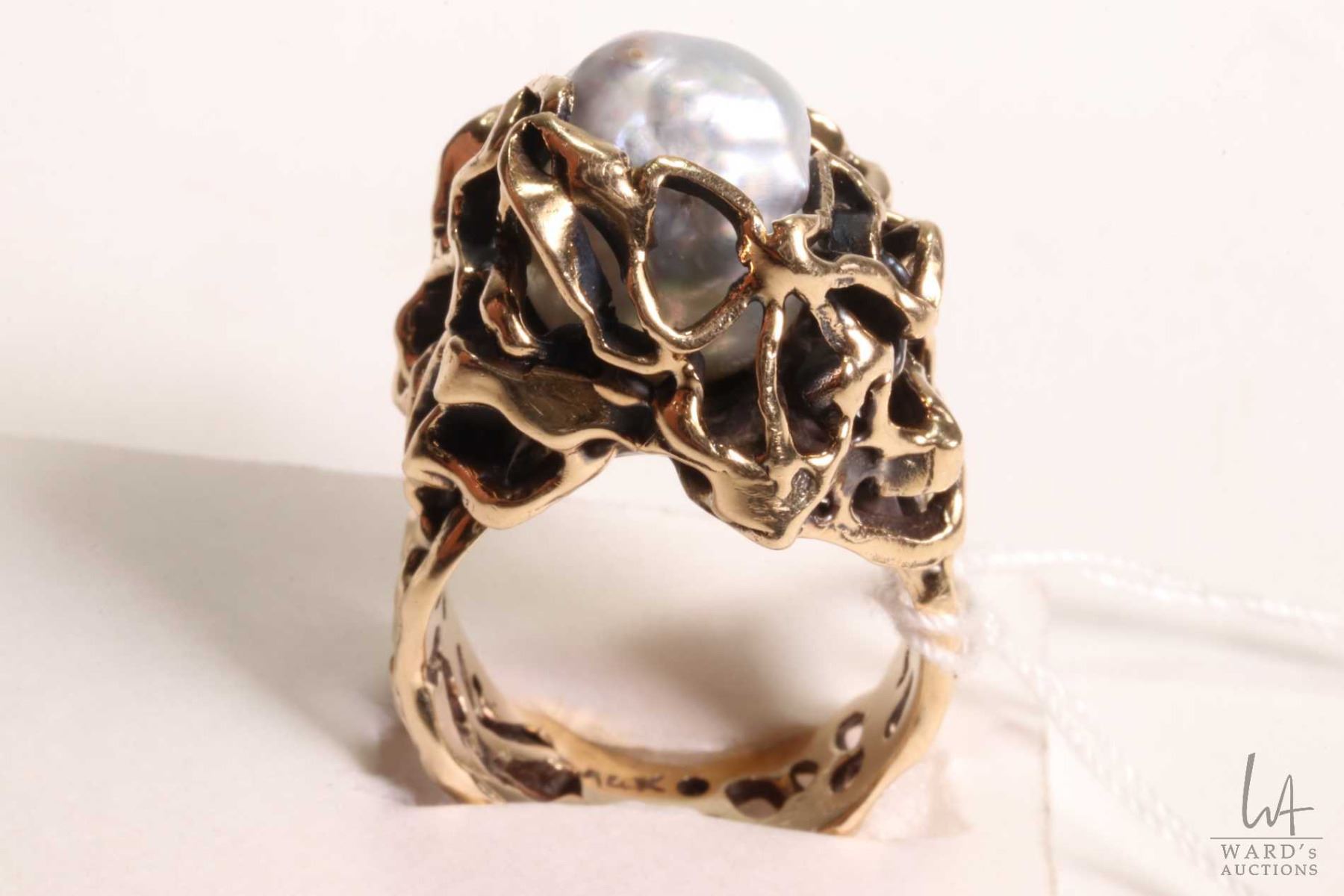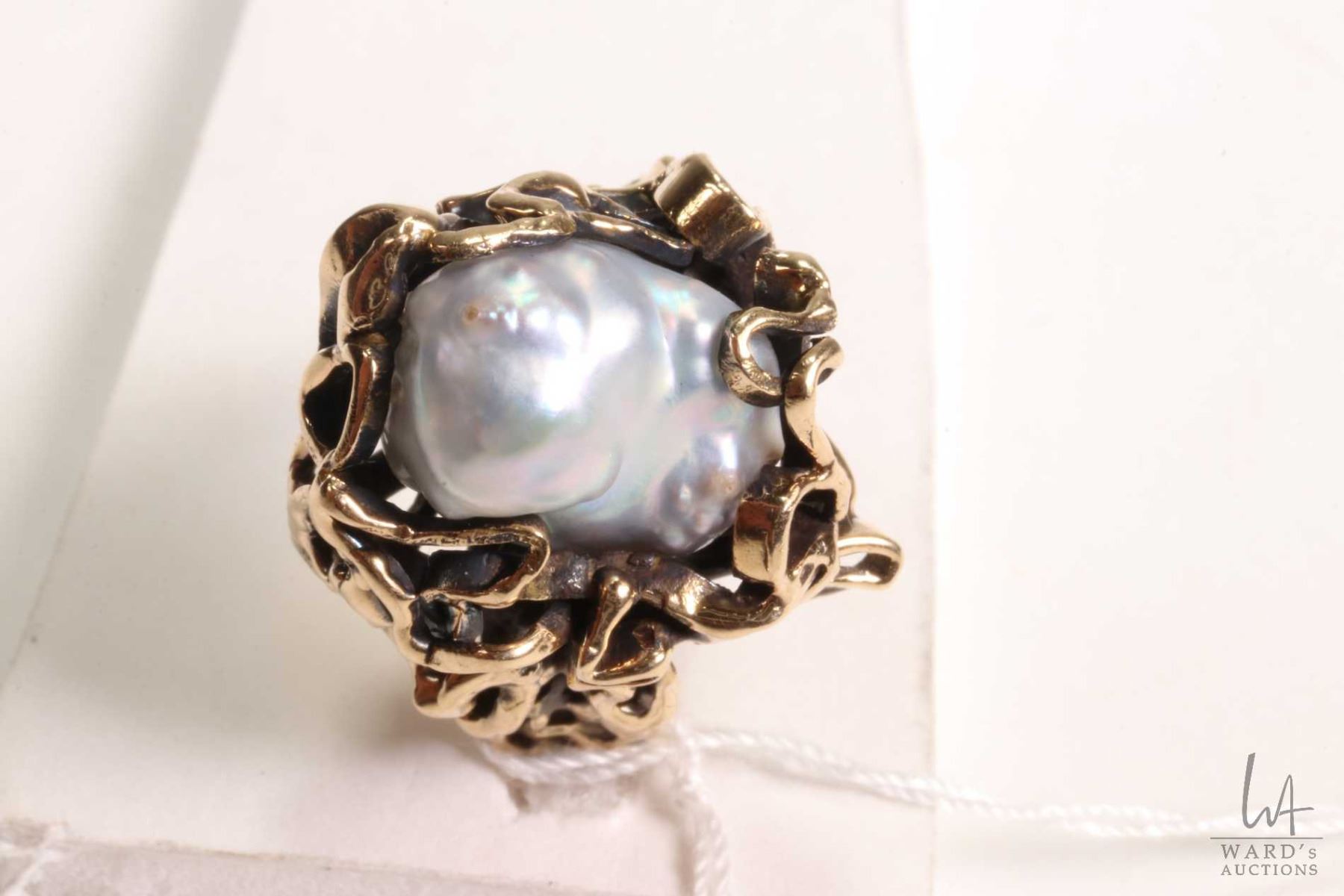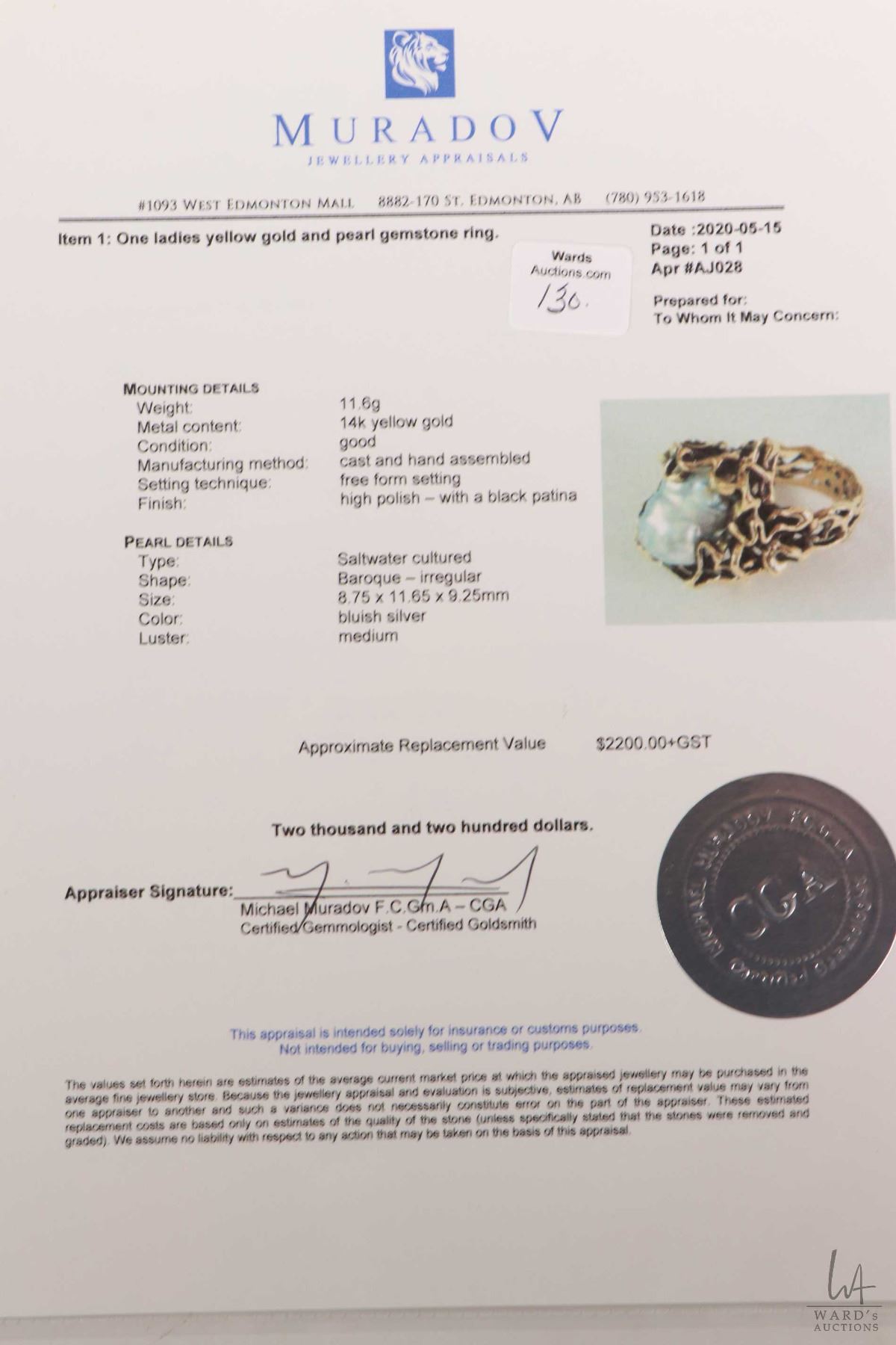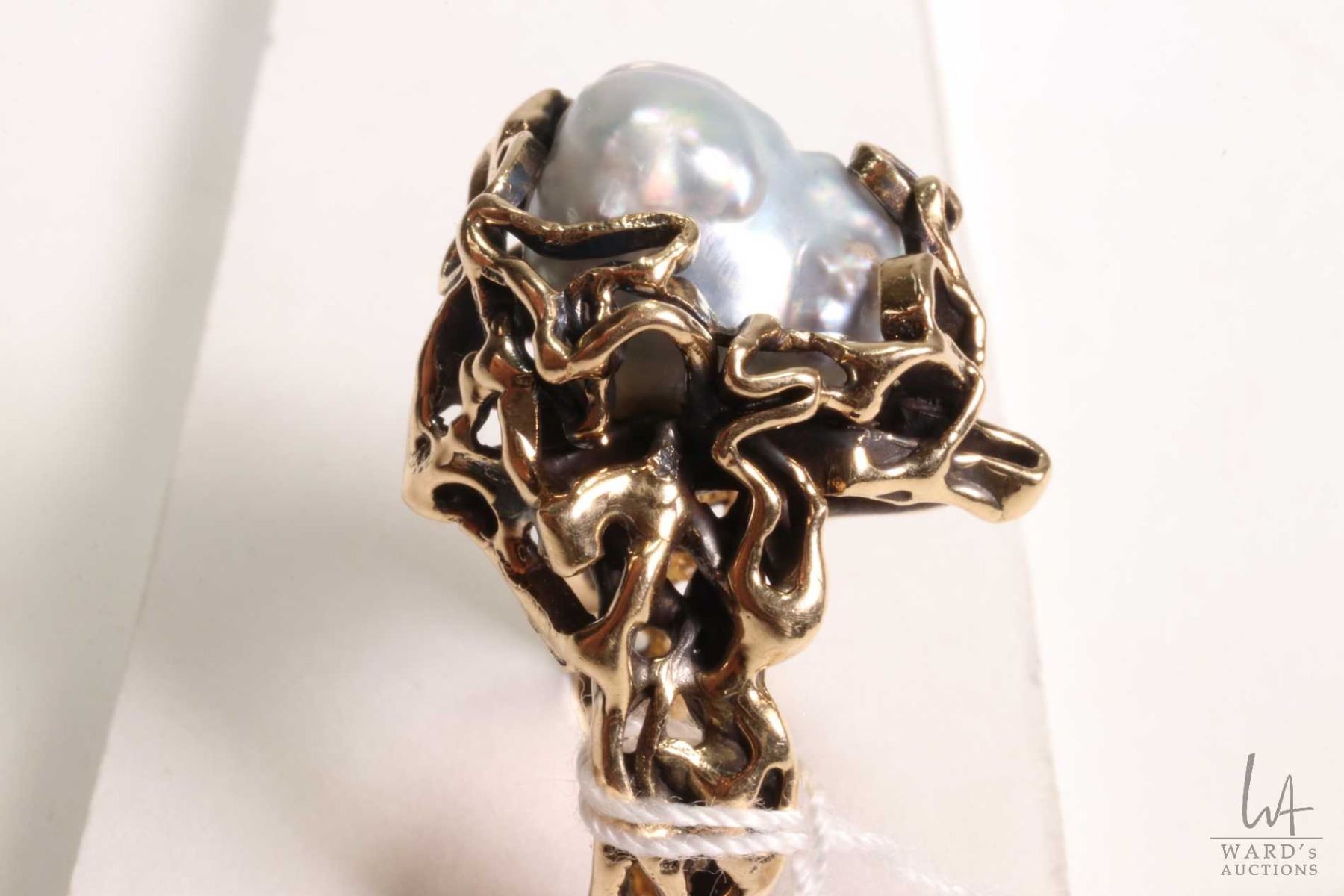 14kt yellow gold ring set with large bluish silver baroque-irregular saltwater cultured pearl 8.75 X 11.65 X 9.25 mm. Retail replacement value $2,200.00