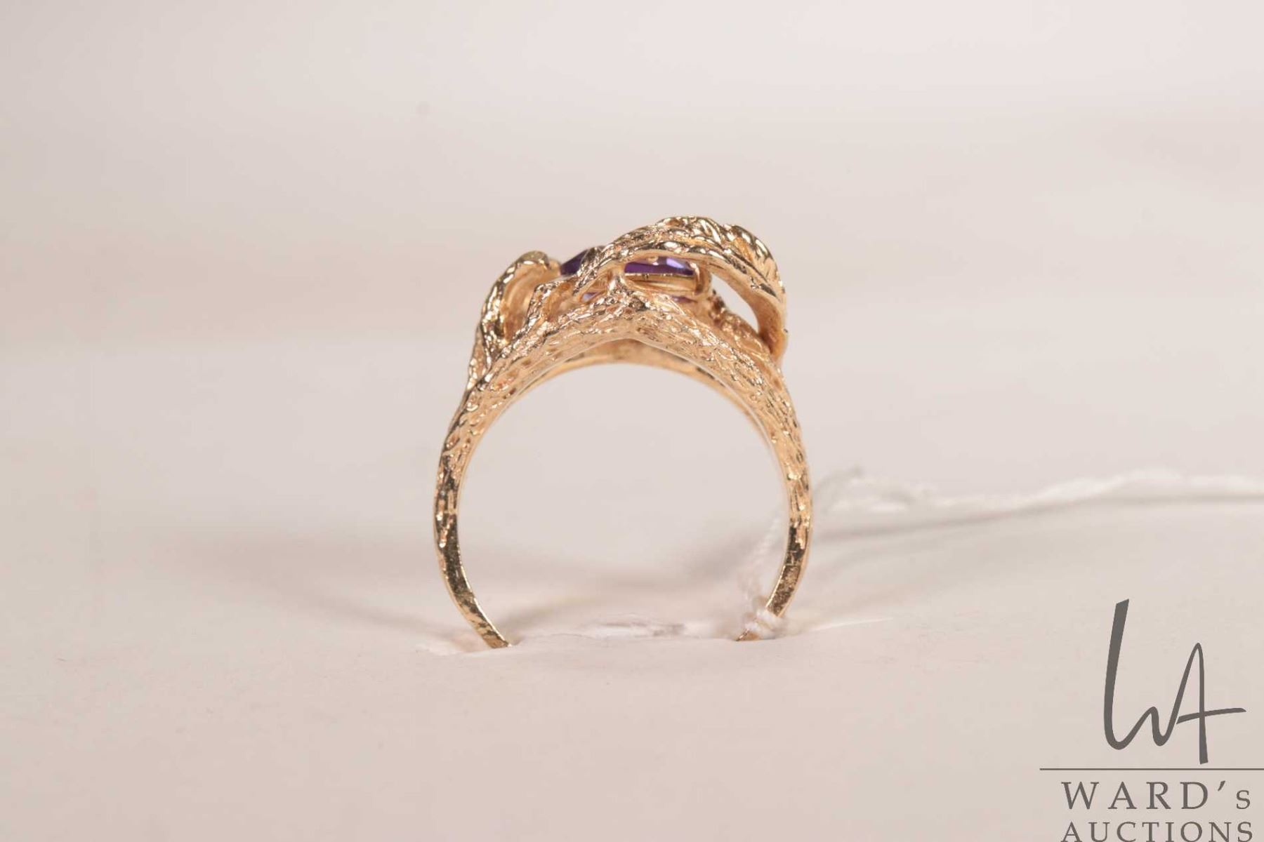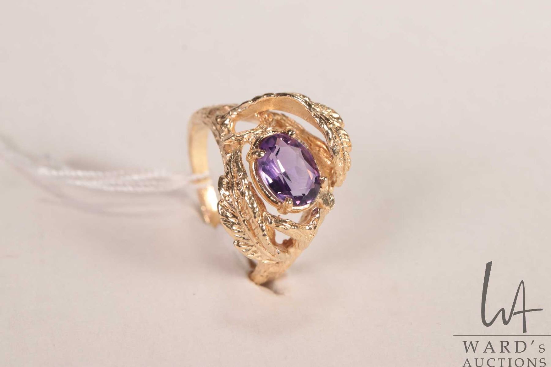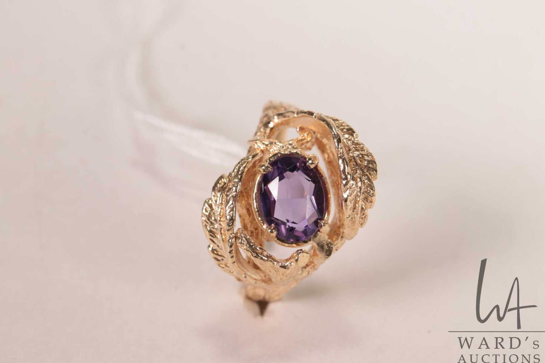 14kt yellow gold ring set with oval amethyst gemstone, size 7.25