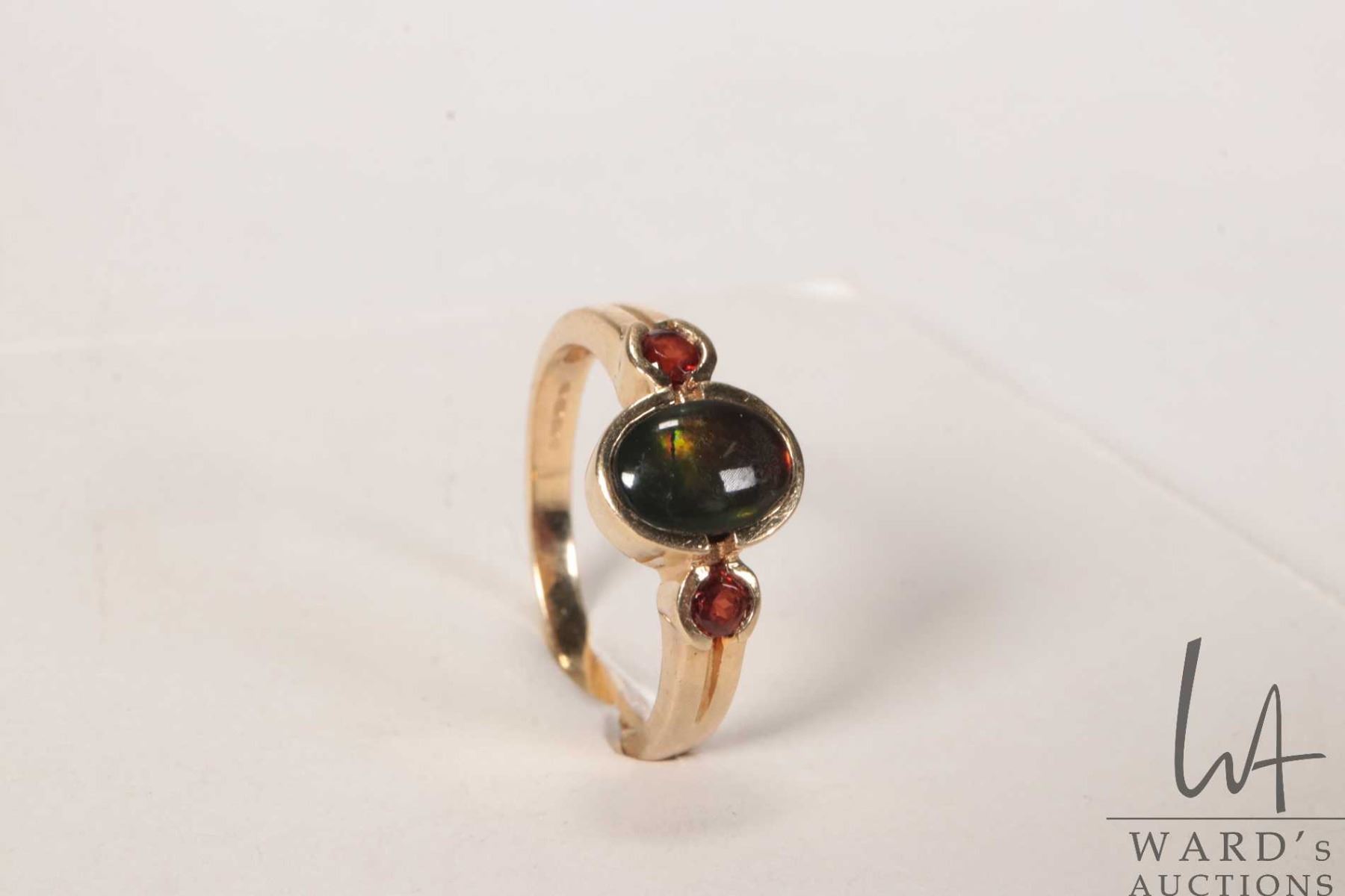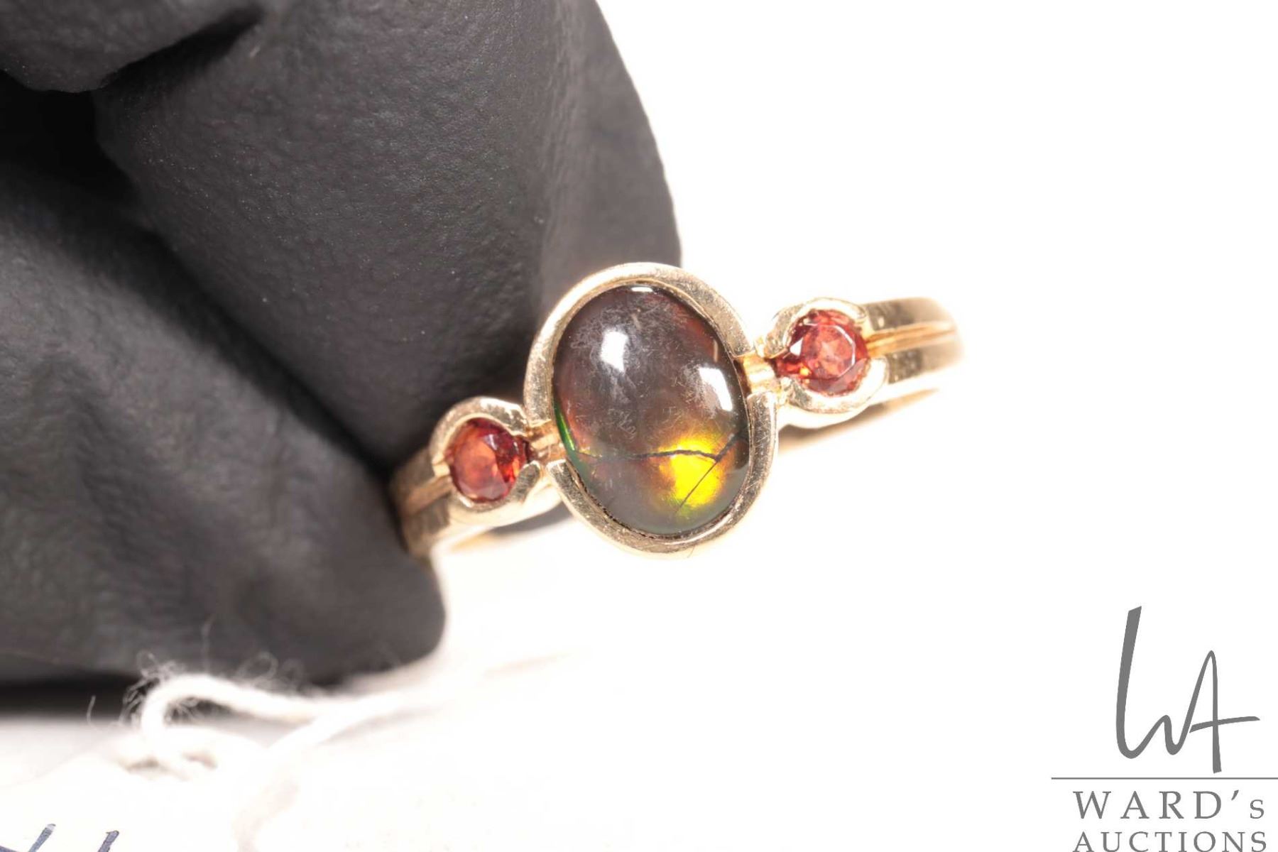 14kt yellow gold ring set with oval ammolite gemstone and garnet side stones, note: ammolite stone i