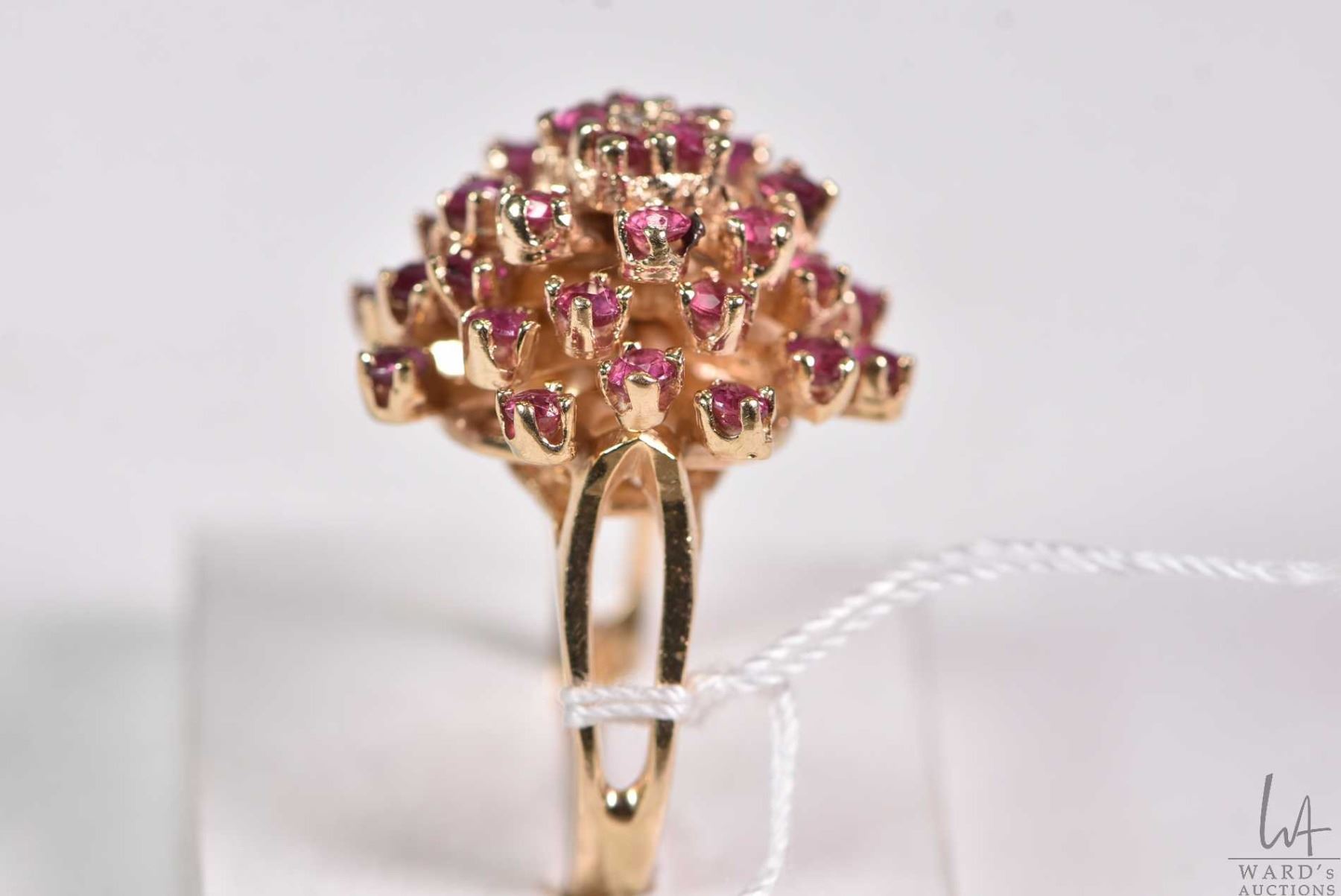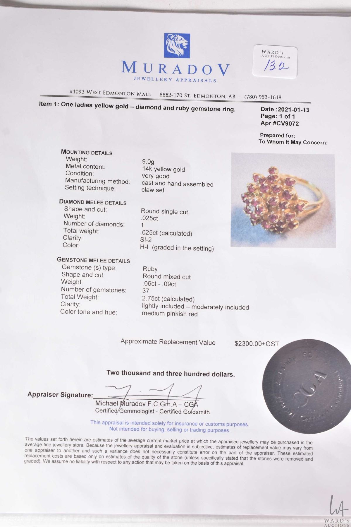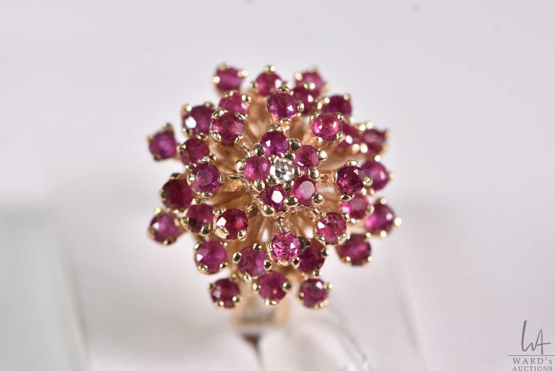 14kt yellow gold, ruby melee and diamond ring set wtih approximately 2.75ct of pink mixed cut round rubbies and center 0.056ct white diamond. Retail replacement value $2,300.00