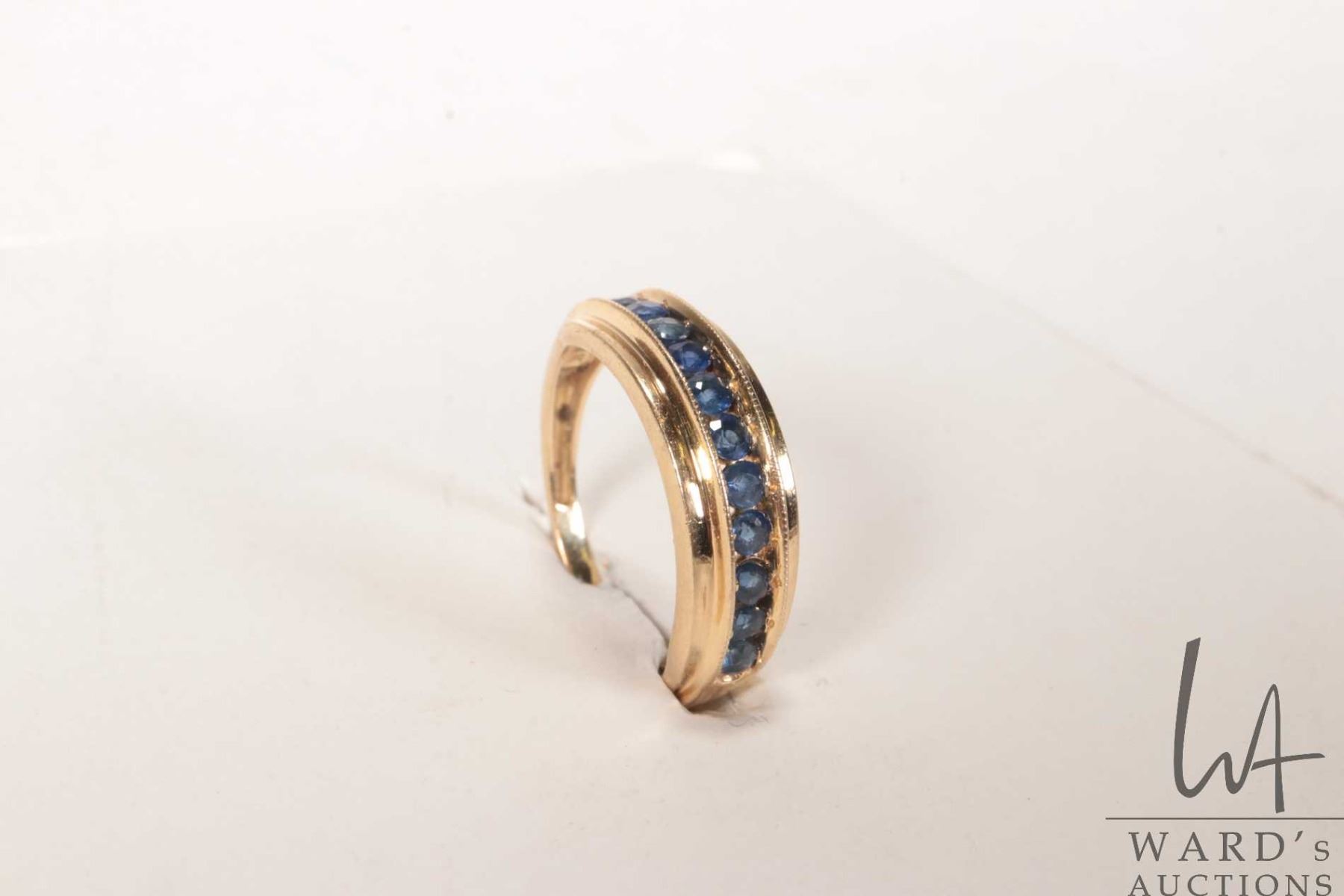 14kt yellow ring with channel set sapphire/ sapphire like gemstones, size 5