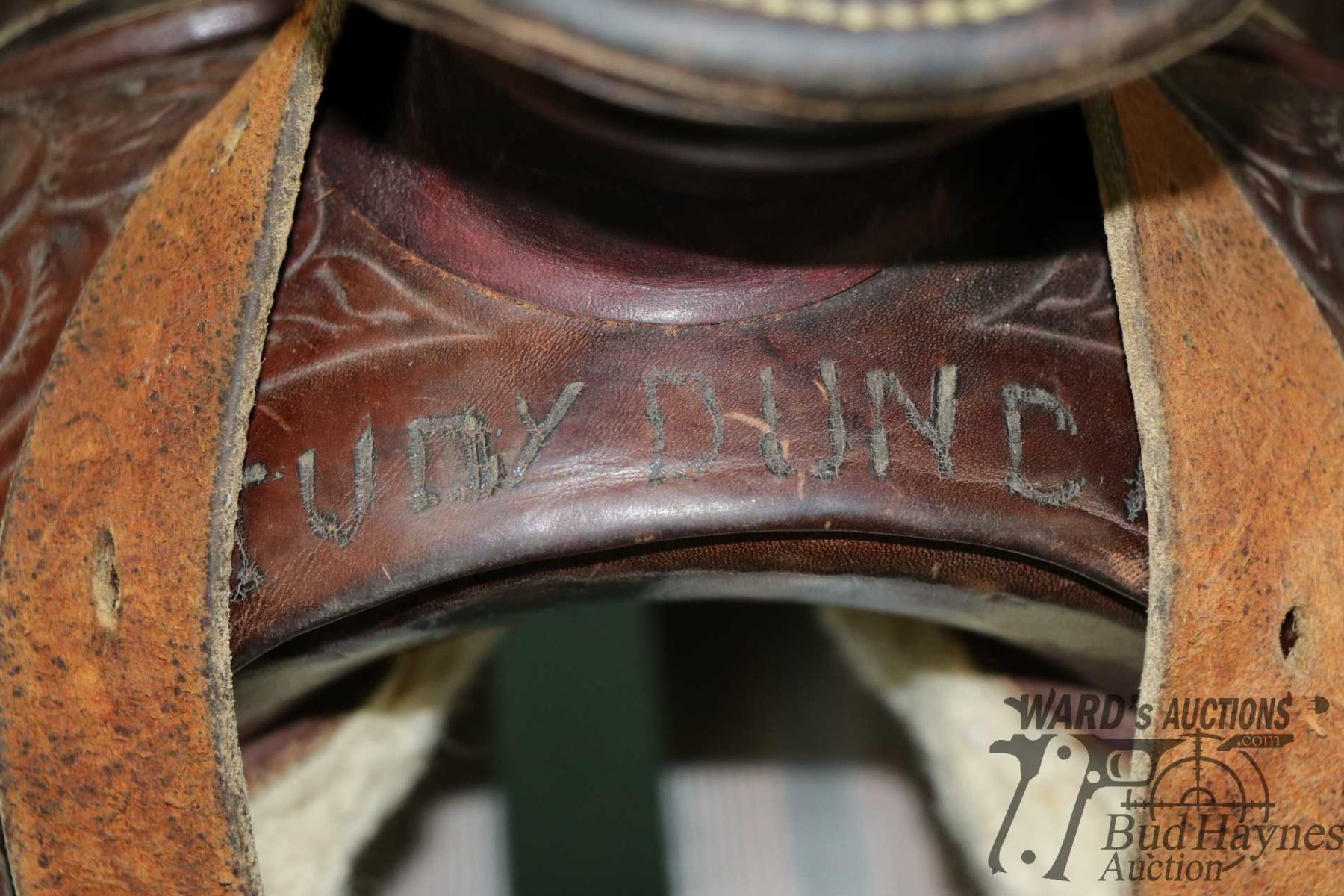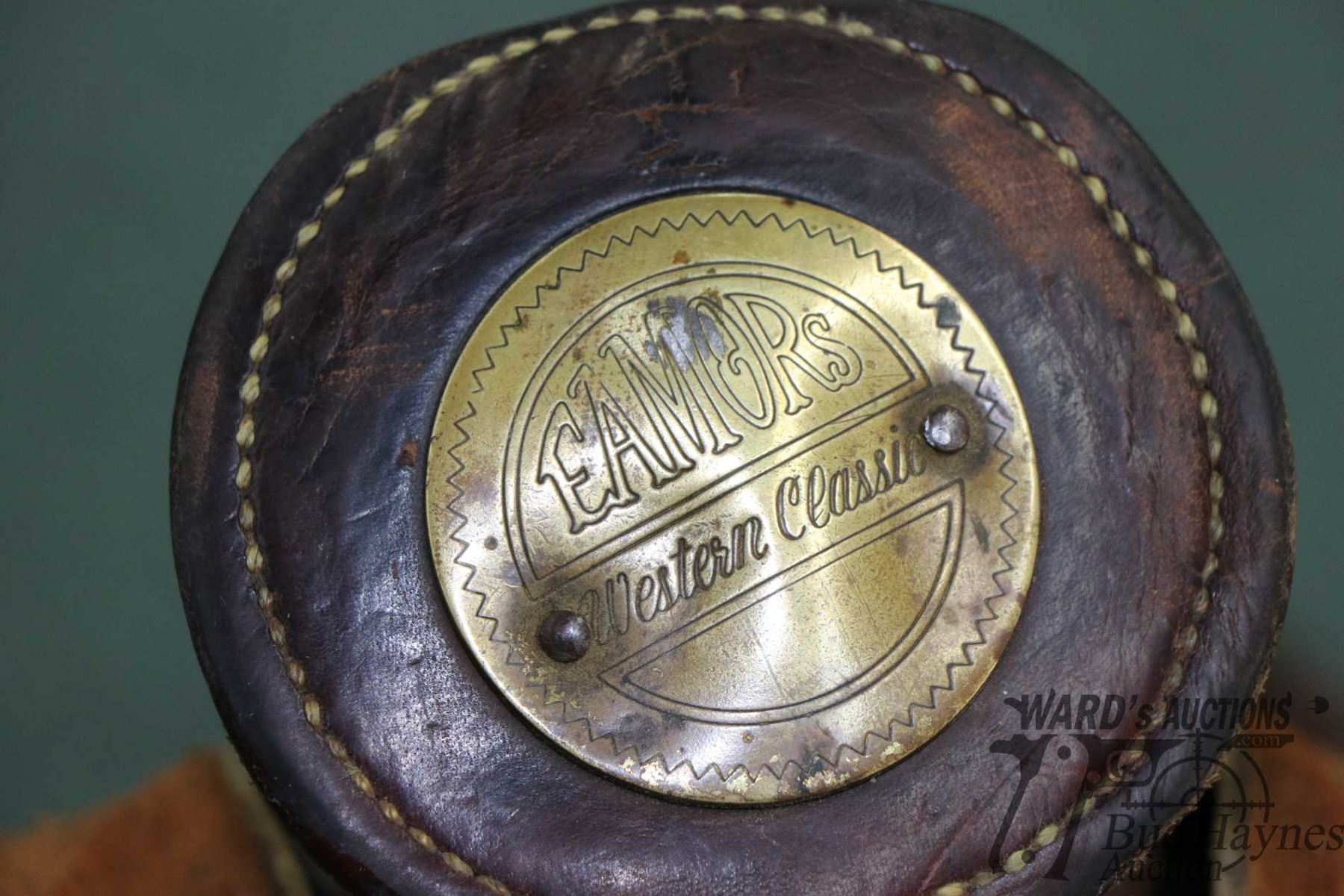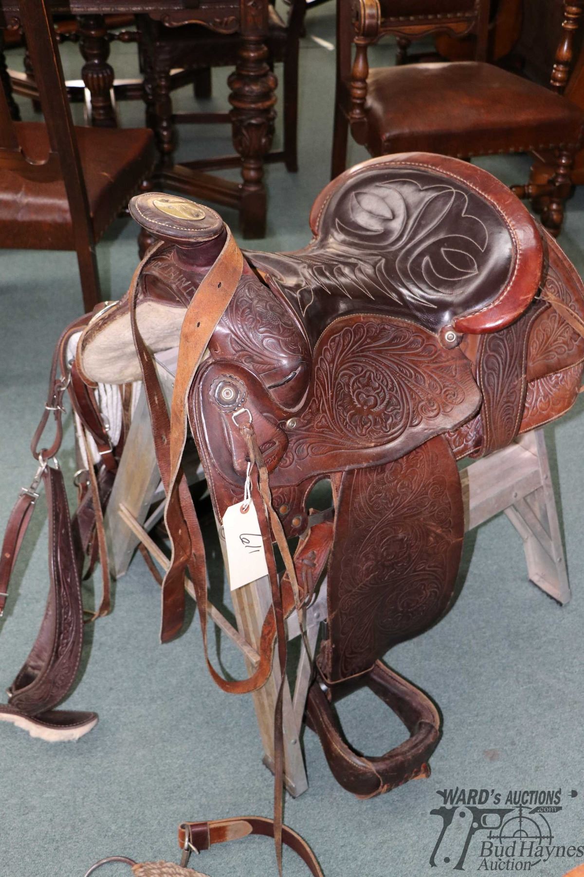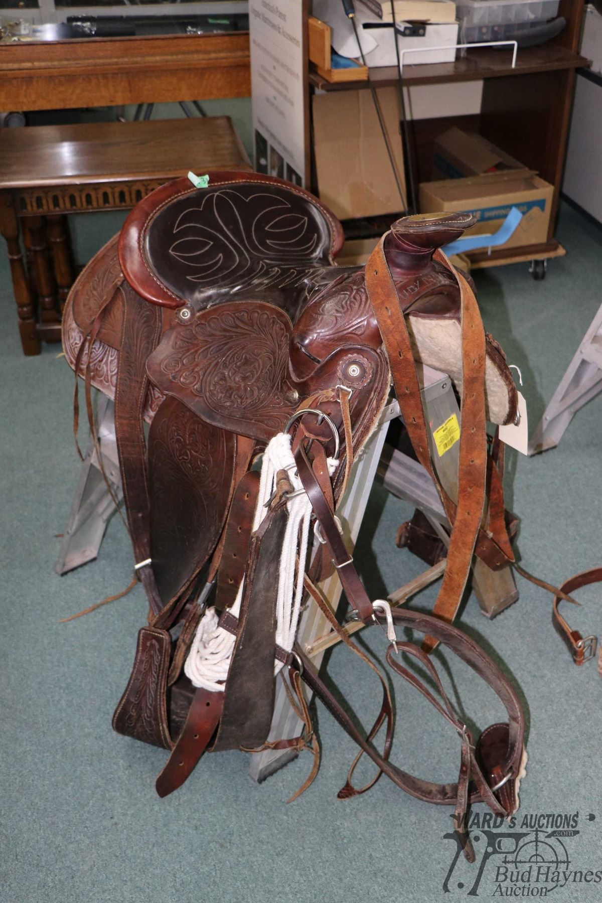 15" leather "Classic" saddle made by Eamor Western with scrollwork tooled leather skirt and dark leather stitched seat plus front and rear cinch and breast collar stamped with brass plate plus leather wrapped stirrups