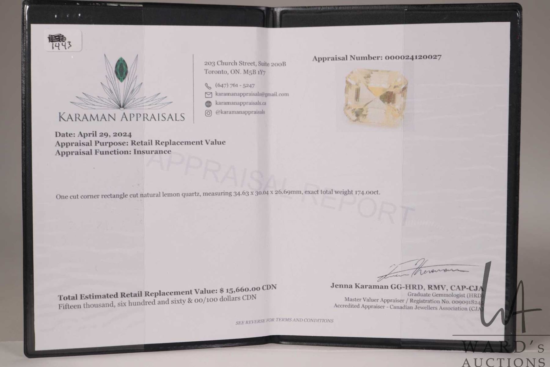 174 ct Certified Lemon LemonQuartz gemstone, Certificate provided by consignor