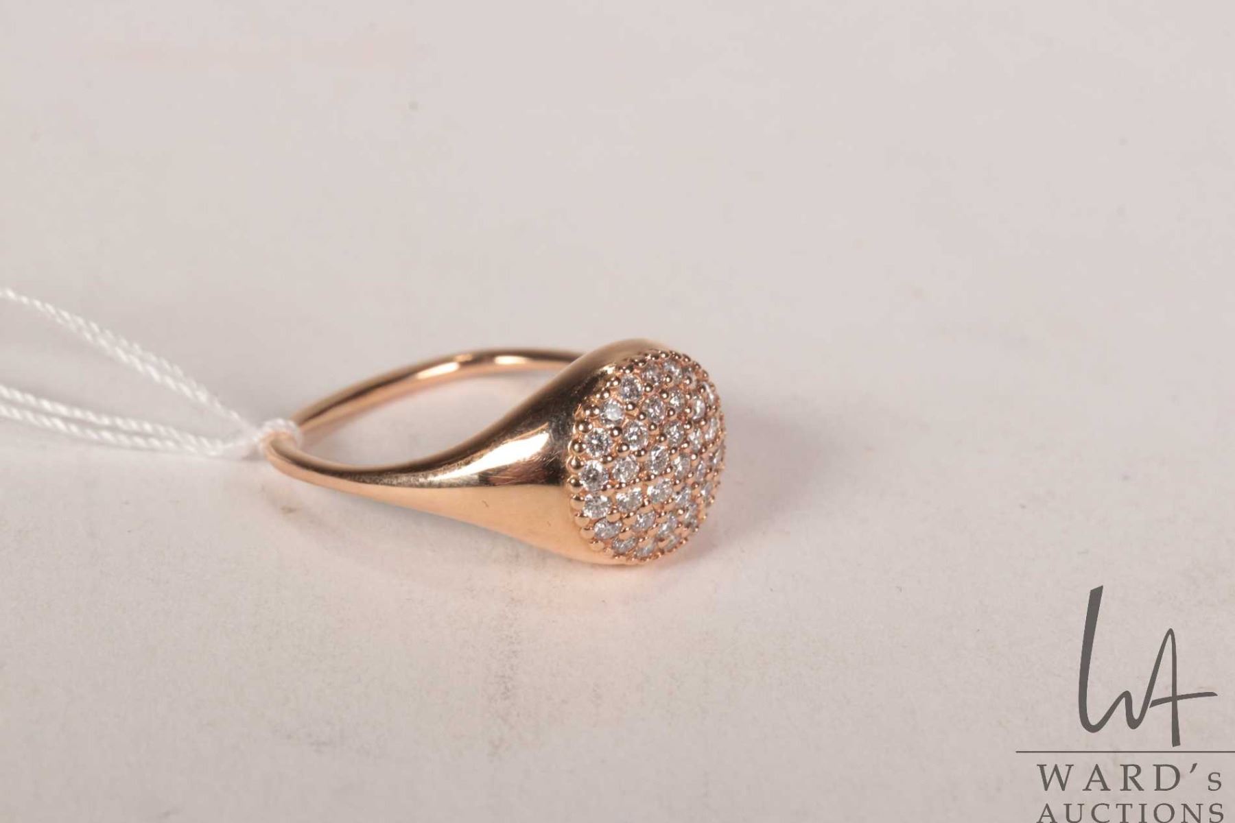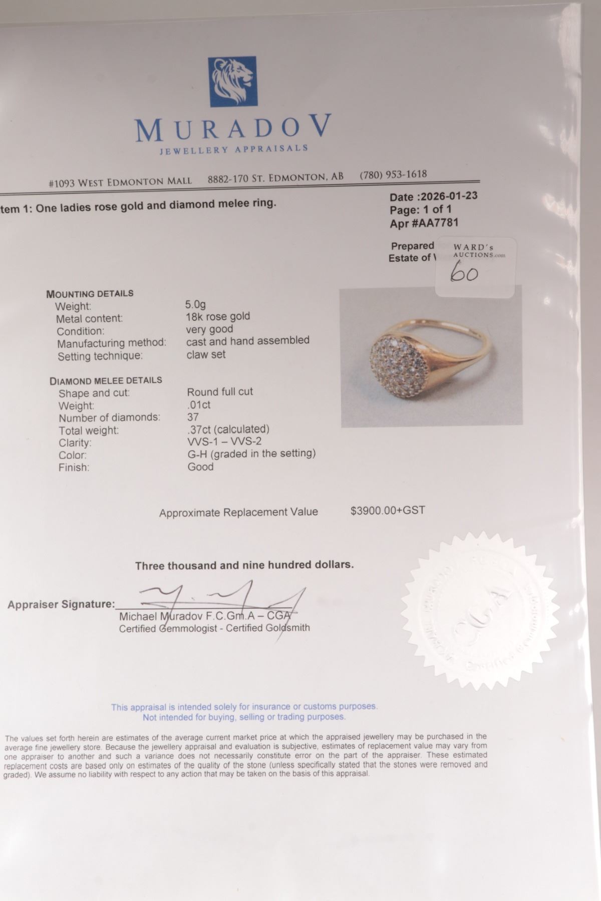 18kt rose gold and diamond ring set with .37cts of round full cut white diamonds. Retail replacement value $3,900.00, size 5