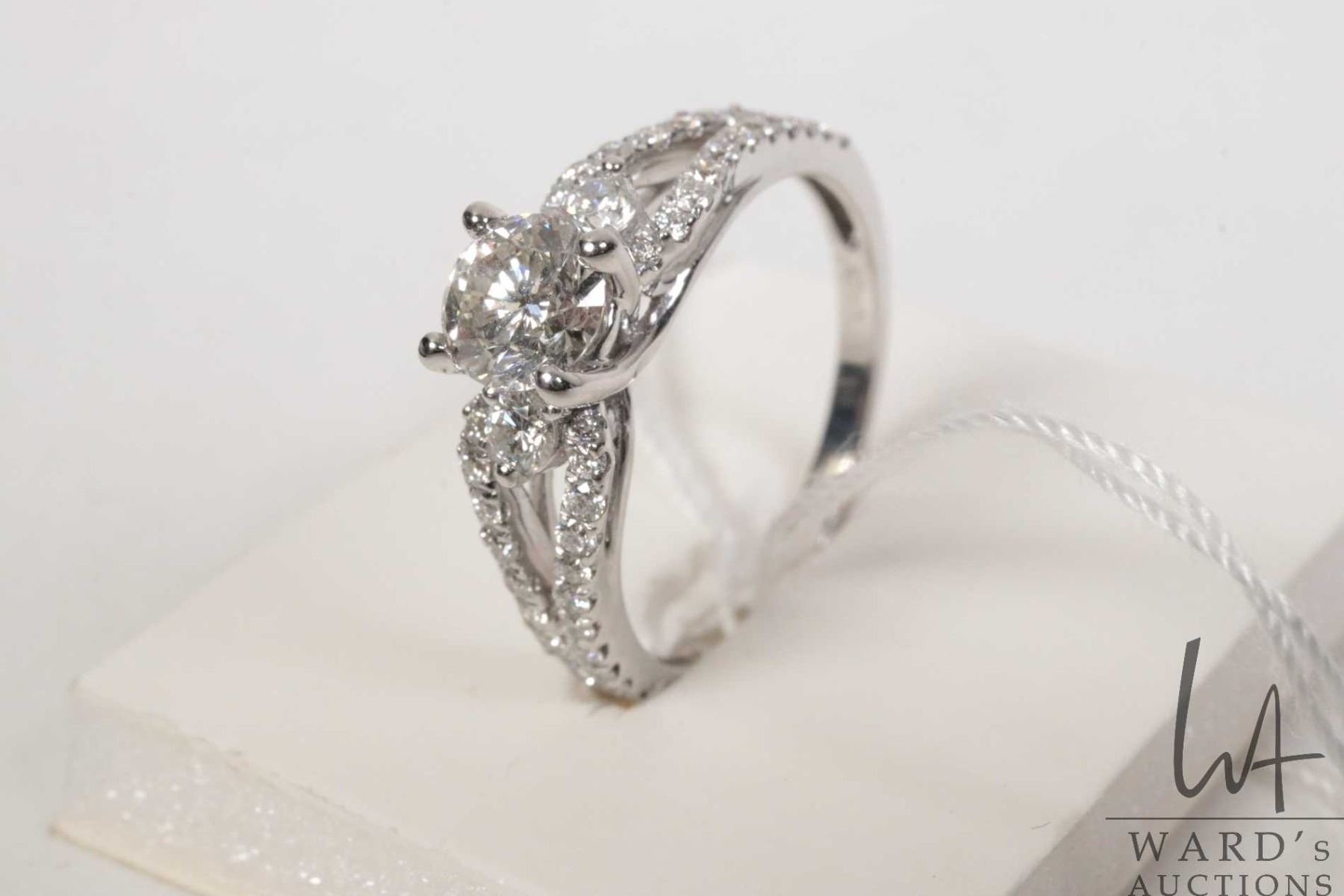 18kt white gold and Canadian diamond ring, set with .55 carat Canadian brilliant cut round diamond laser inscribed BMJ IGI 30105296C Maple Leaf, two 0.10ct round brilliant cut shoulder diamonds and 0.35 ct / 44 round brilliant cut white diamonds on band. Total diamond weight 1.00ct. Ring sized 5.5. Retail replacement value $7,000.00