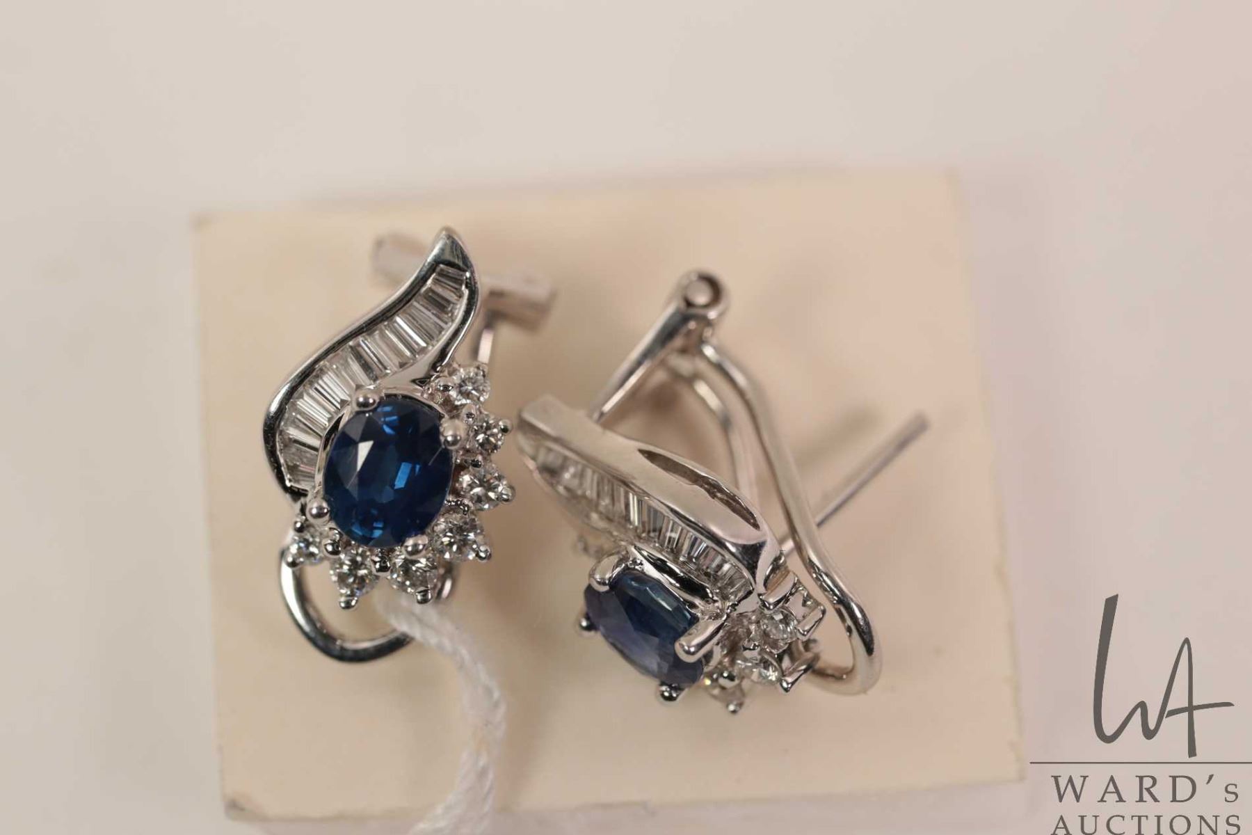 18kt white gold, diamond and sapphire gemstone earrings. Set with two .45ct oval mixed cut sapphire gemstones and .20ct round full cut and .23ct baguette diamonds. Total sapphire weight .90ct and .20ct round full cut and .23ct baguette cut. Retail replacement value $3,700.00