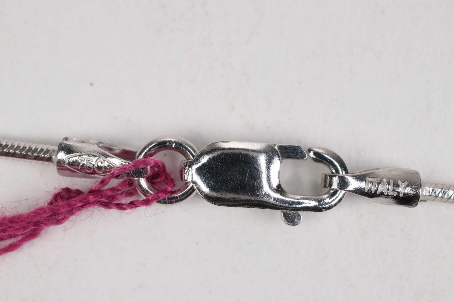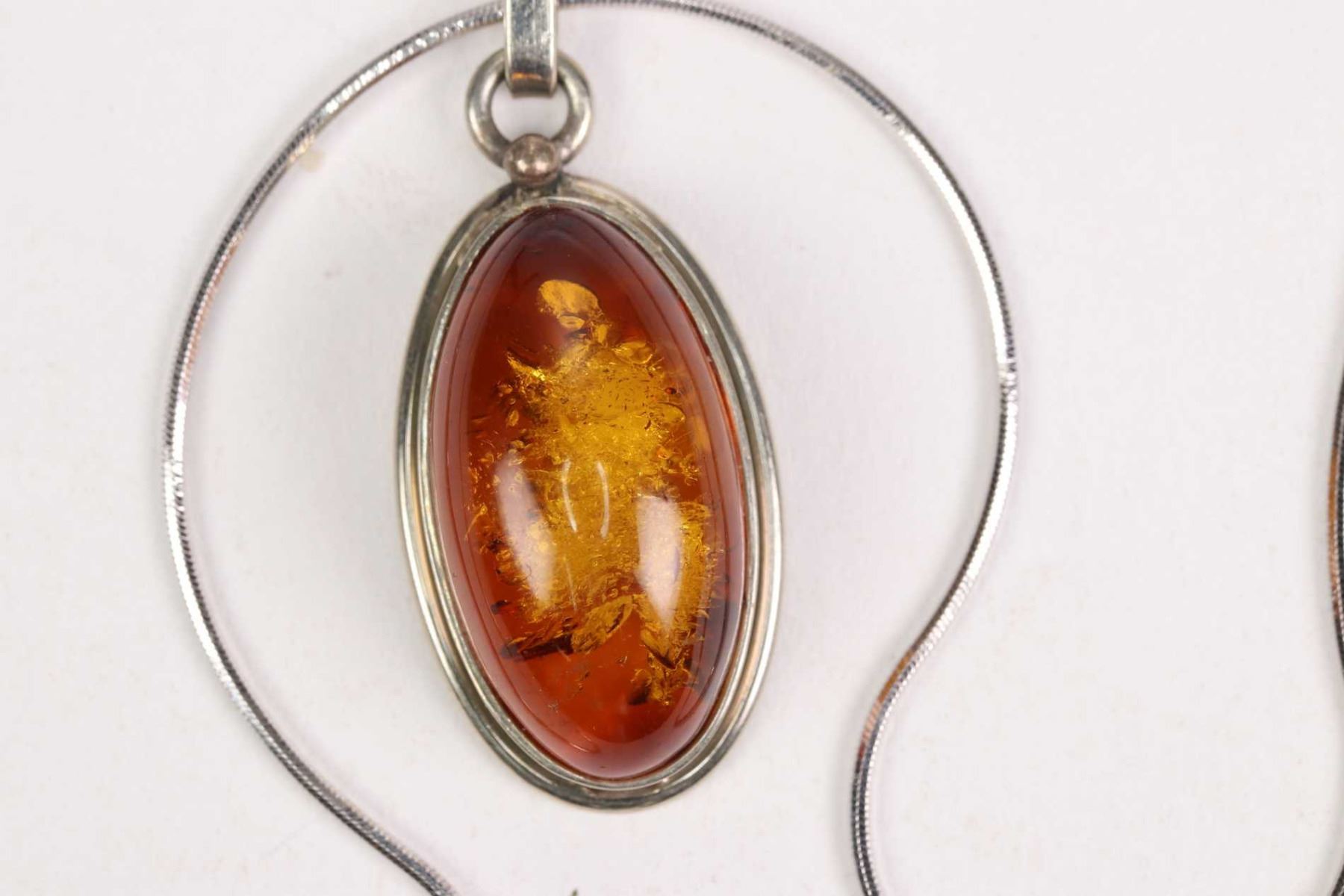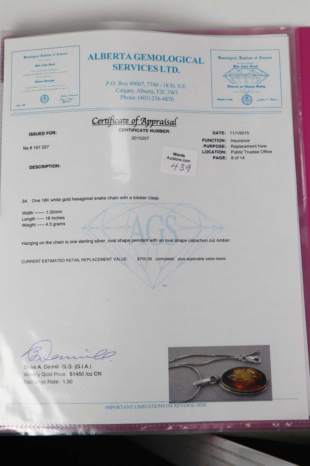 18kt white gold hexagonal snake 18" chain and a sterling silver, oval shaped cabochon amber pendant. Retail replacement value $750.00