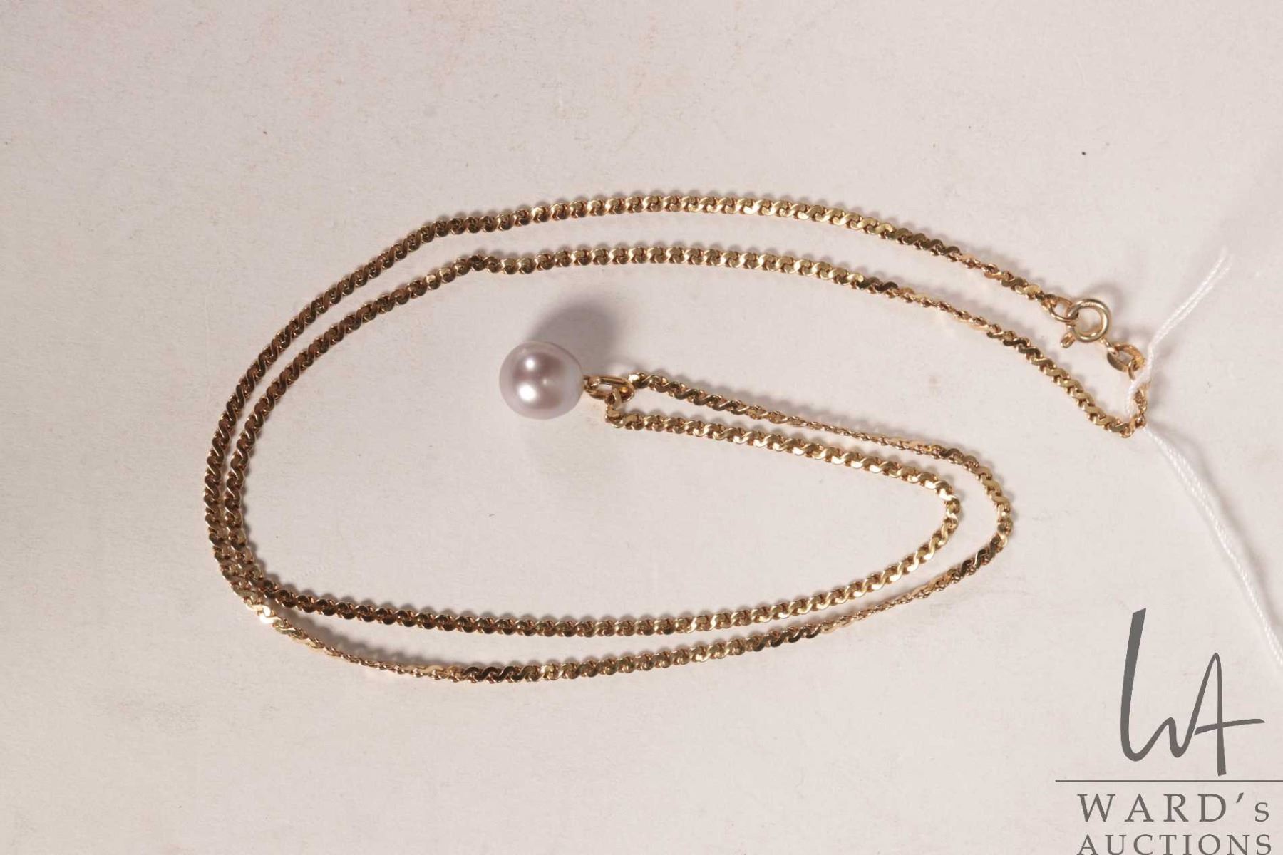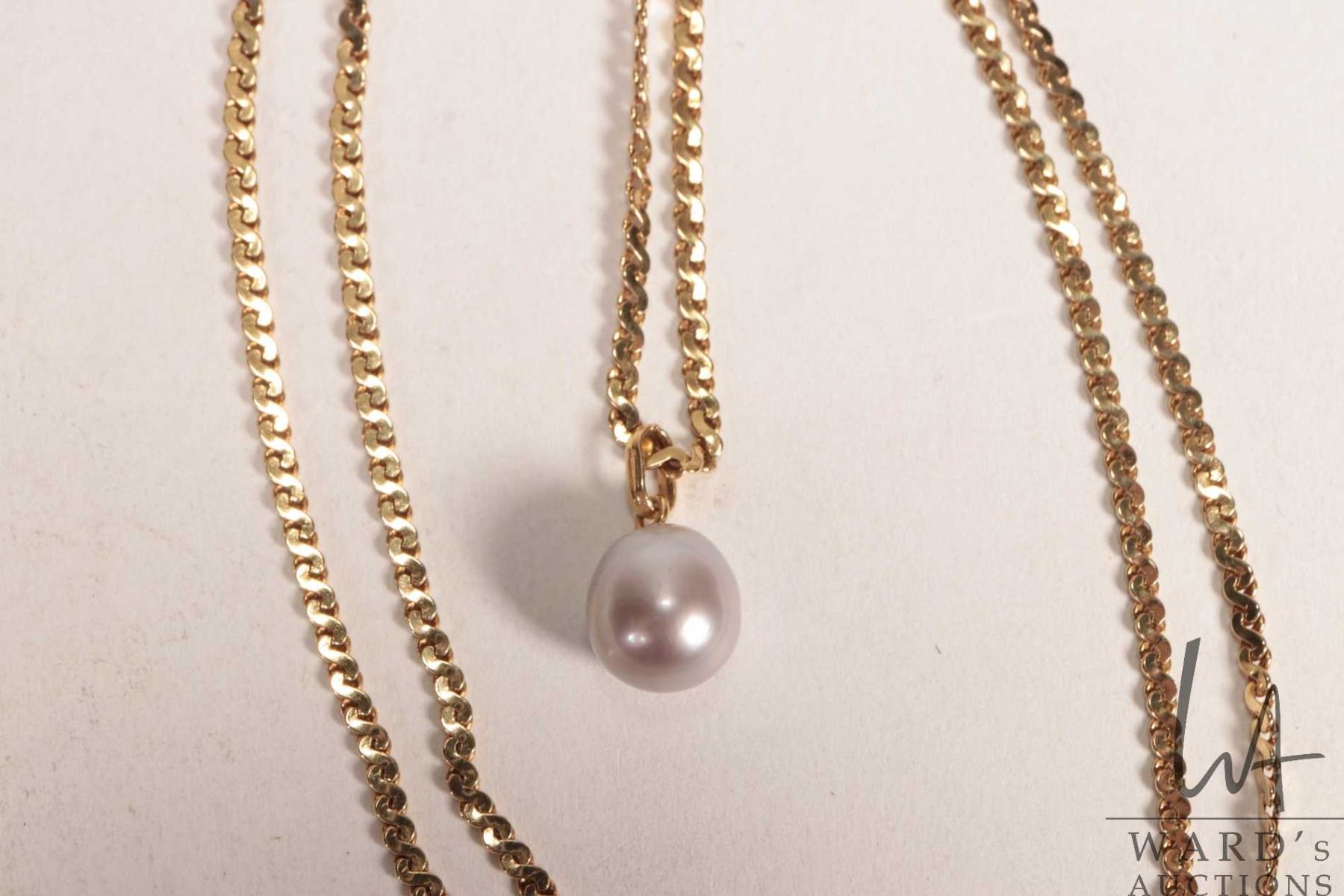 18kt yellow gold 24" neck chain with 18kt yellow gold and genuine pearl pendant, both pieces marked