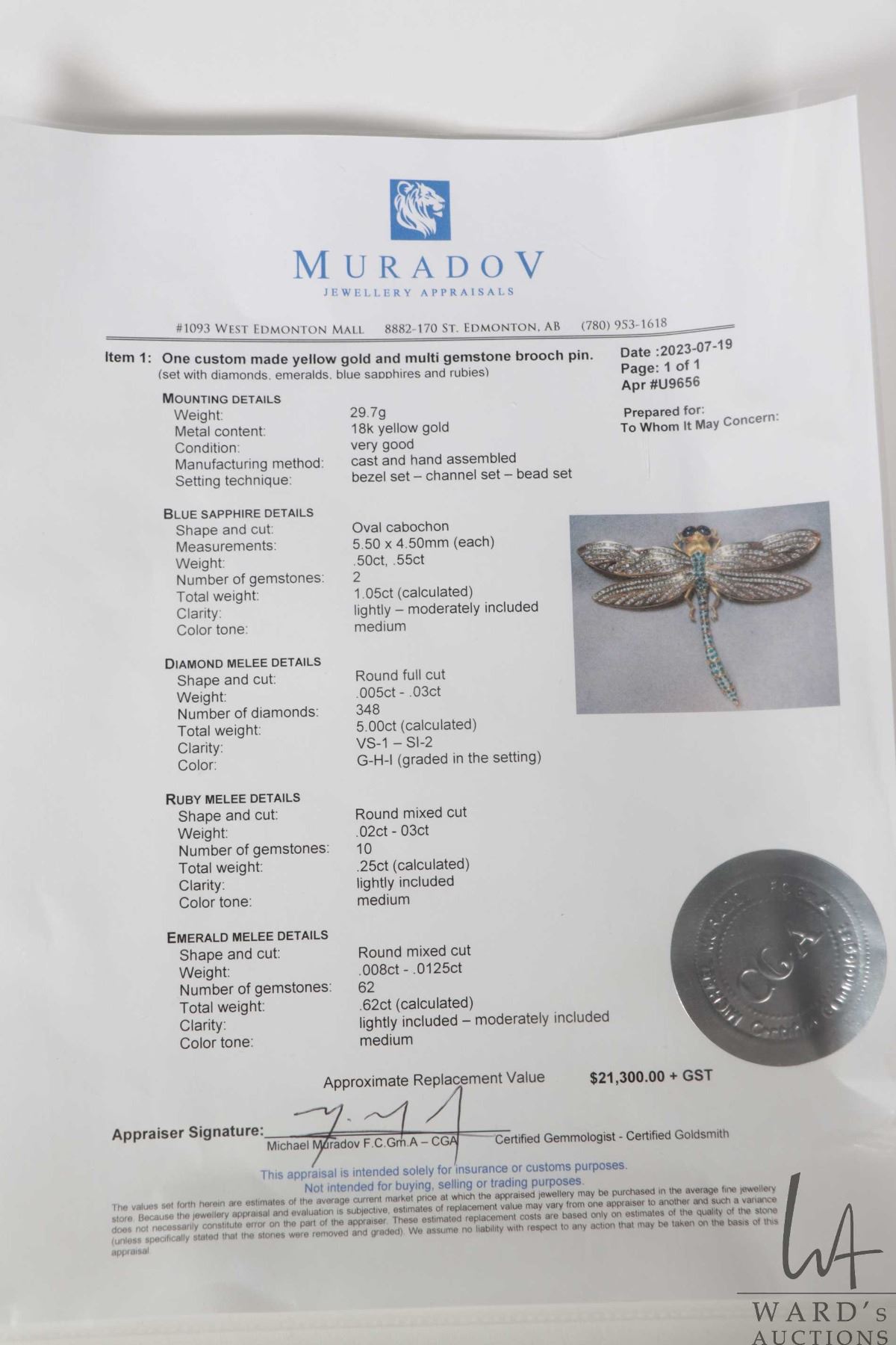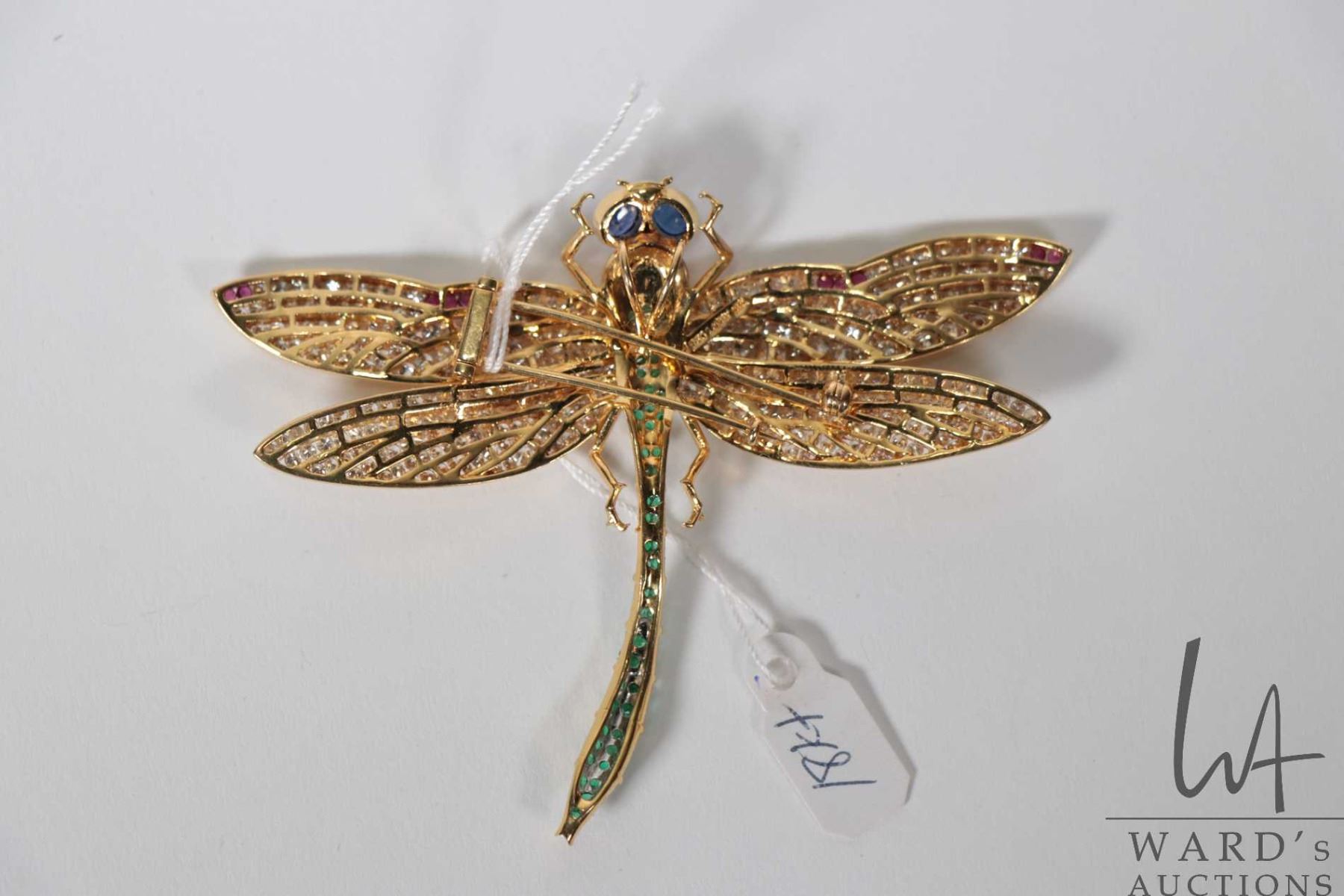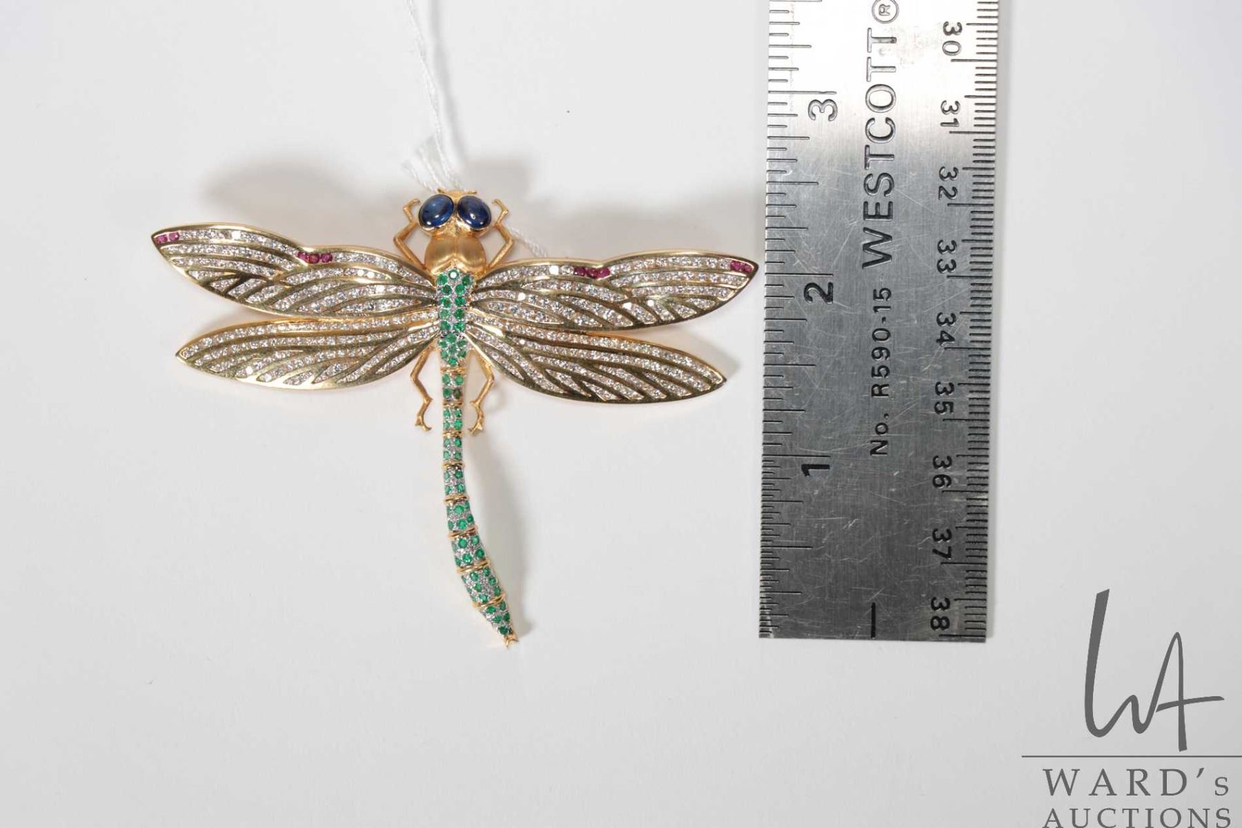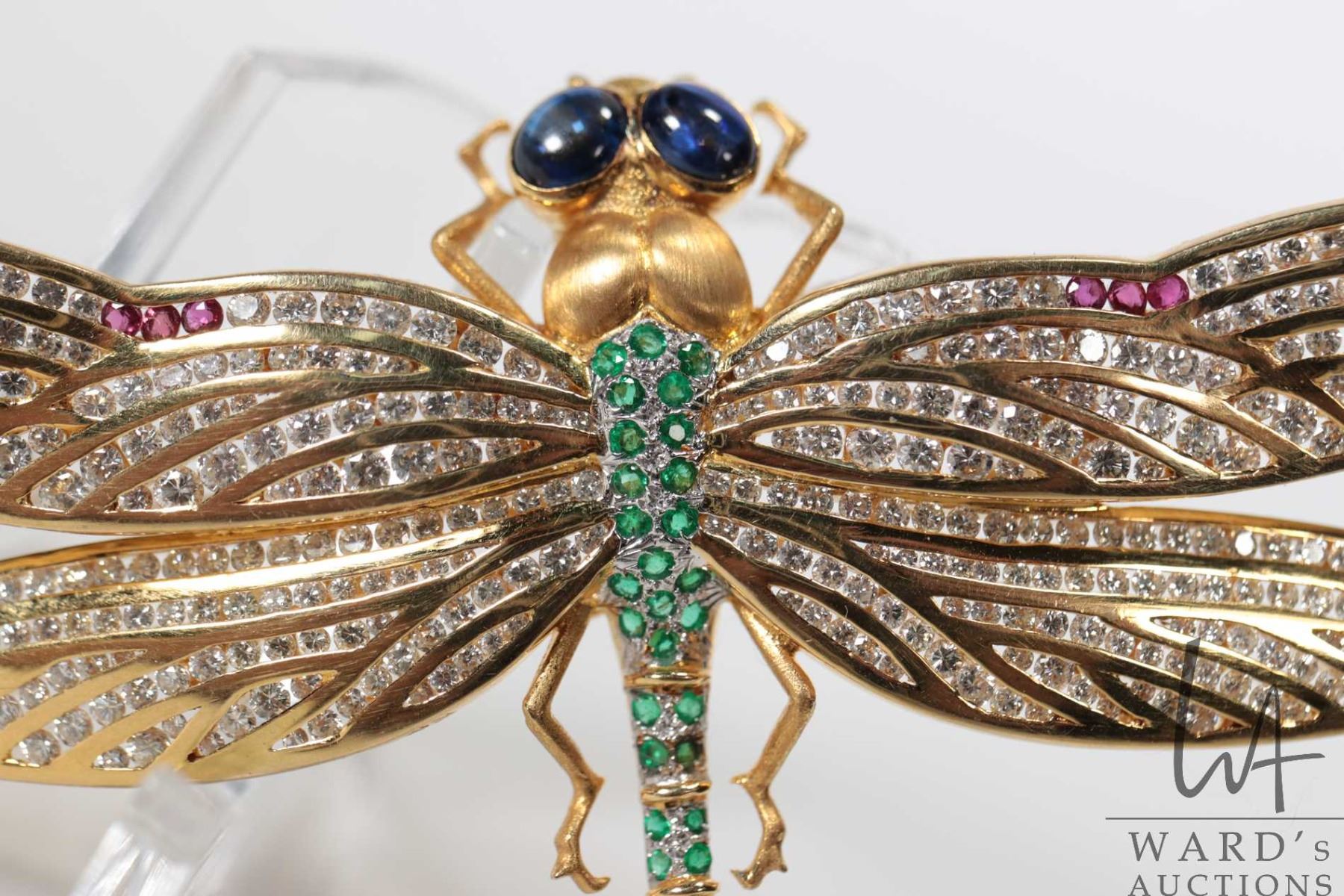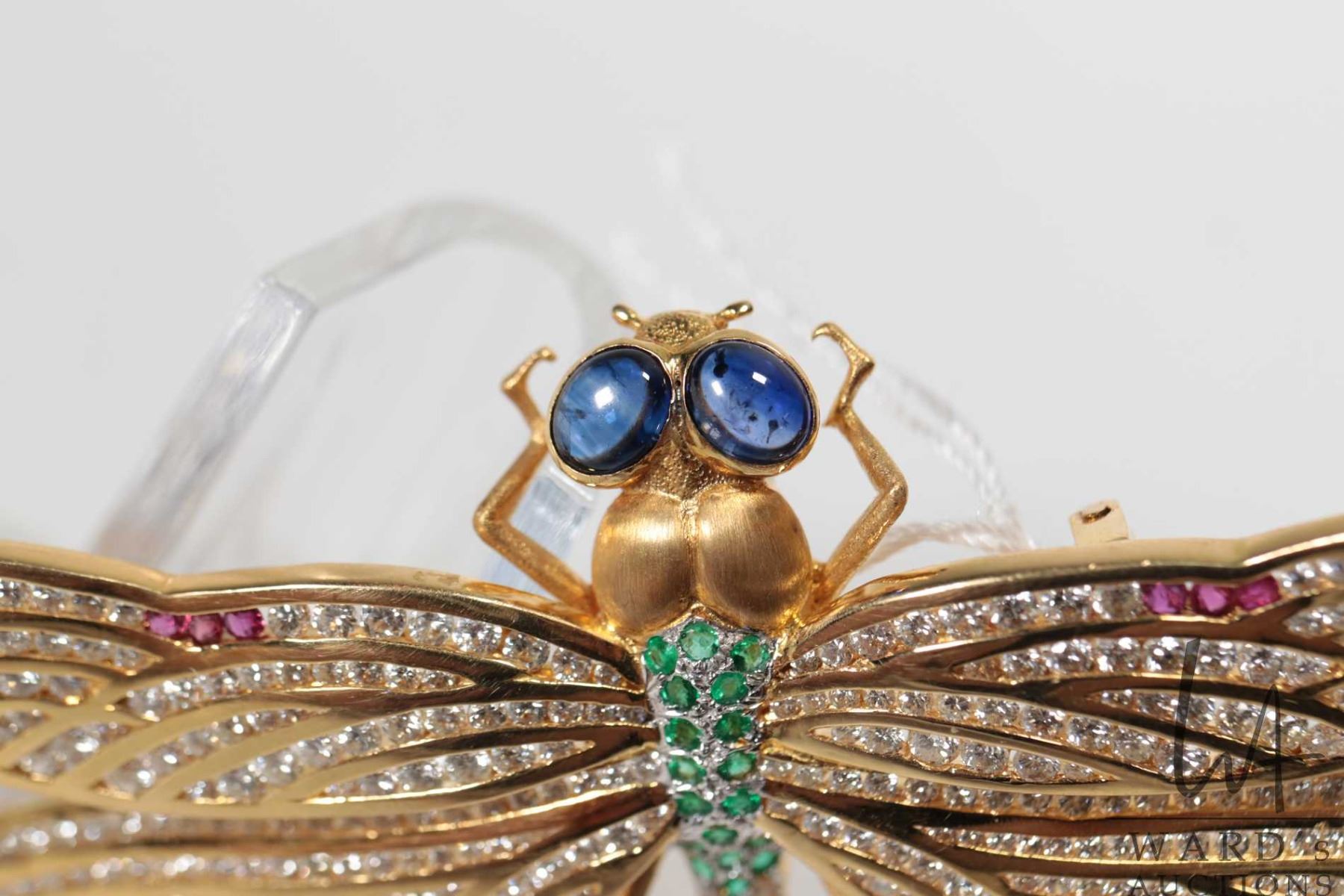 18kt yellow gold dragonfly brooch, set with 1.05ct oval cabochon sapphires, 5.00ct of round full cut white diamonds, .25cts of round mixed cut ruby gemstones and .62cts of round mixed cut emeralds, 2 1/2" in length and 3 1/4" wing span. Retail replacement value $21,300.00