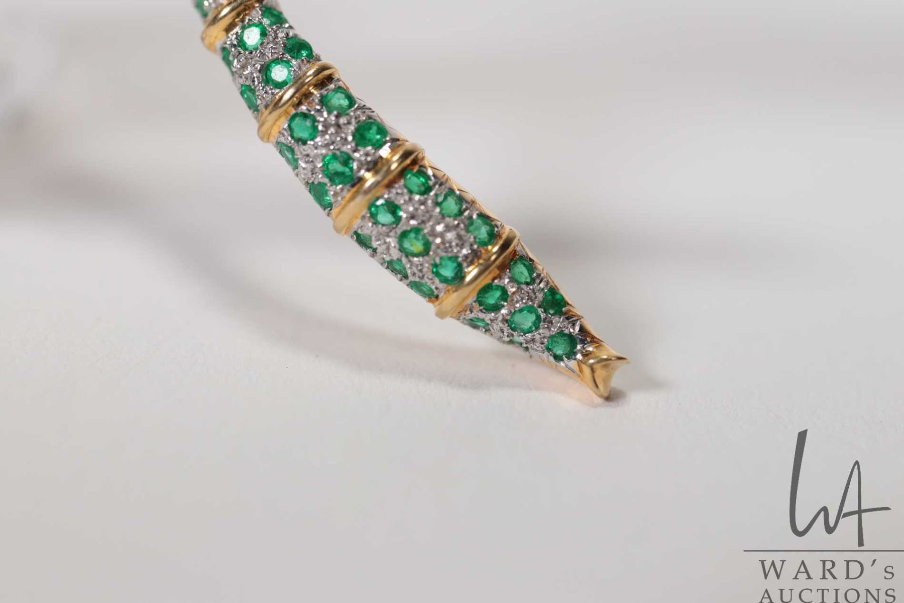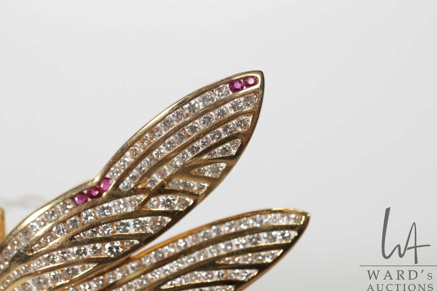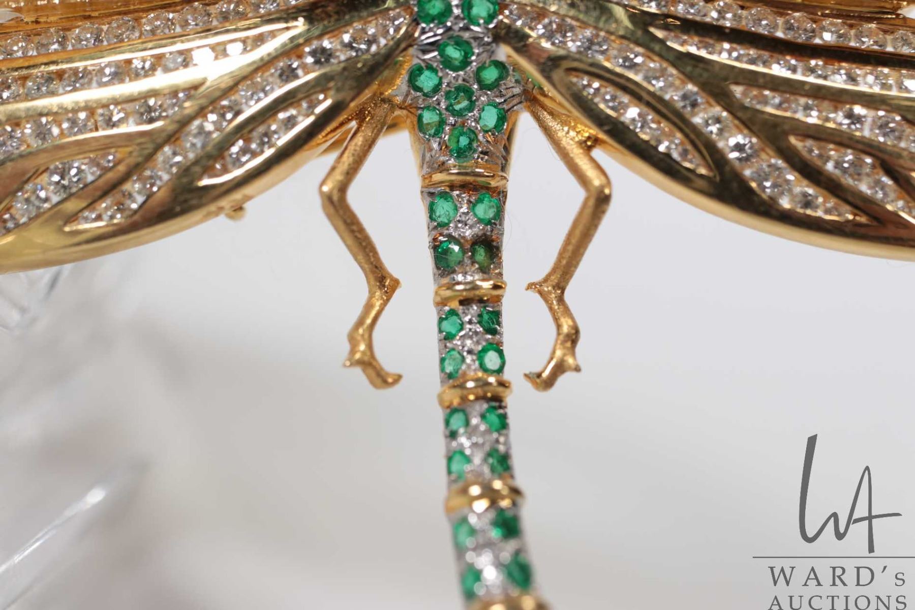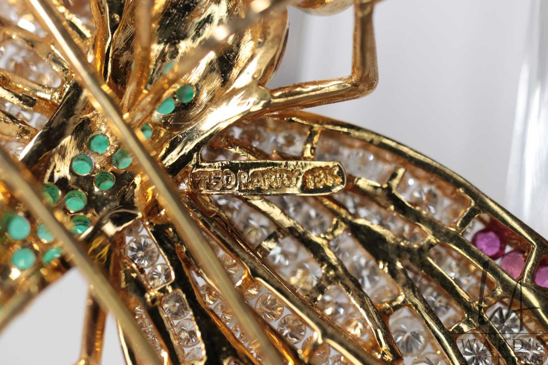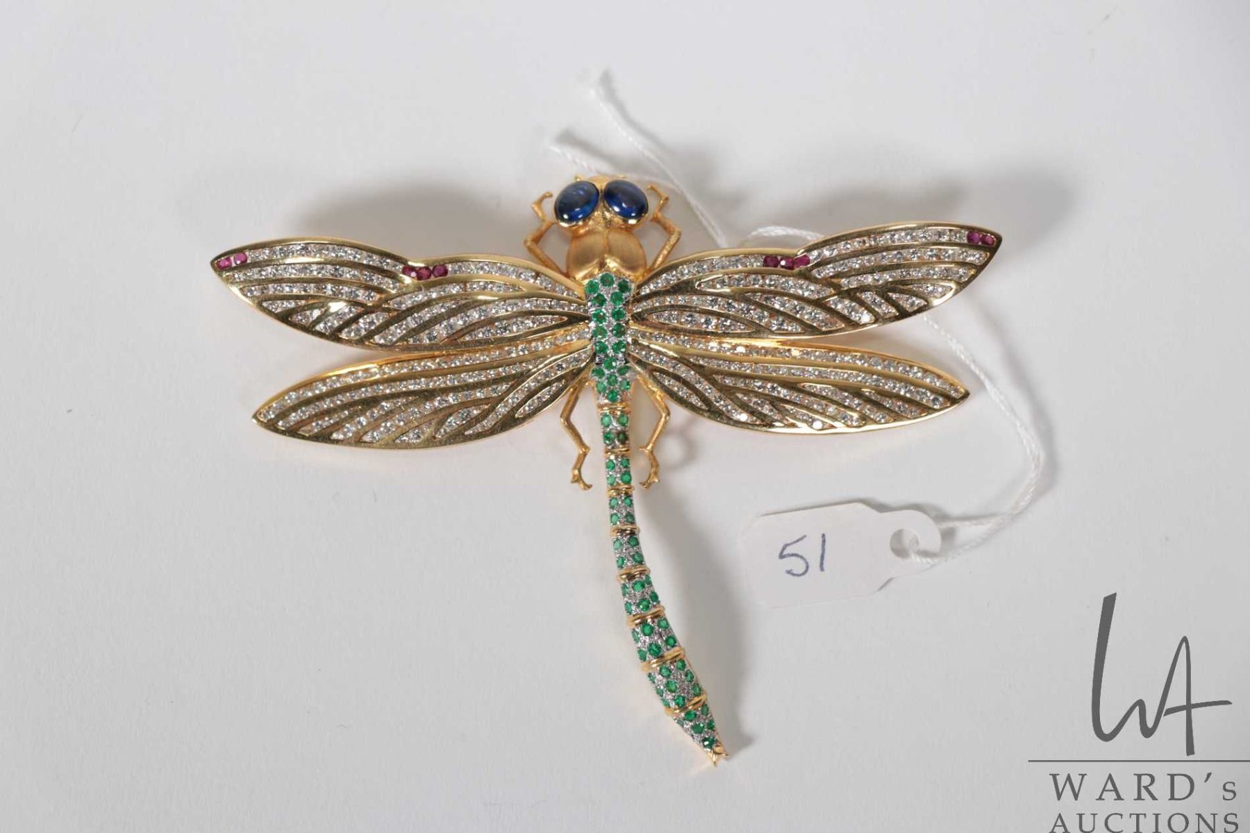 18kt yellow gold dragonfly brooch, set with 1.05ct oval cabochon sapphires, 5.00ct of round full cut white diamonds, .25cts of round mixed cut ruby gemstones and .62cts of round mixed cut emeralds, 2 1/2" in length and 3 1/4" wing span. Retail replacement value $21,300.00