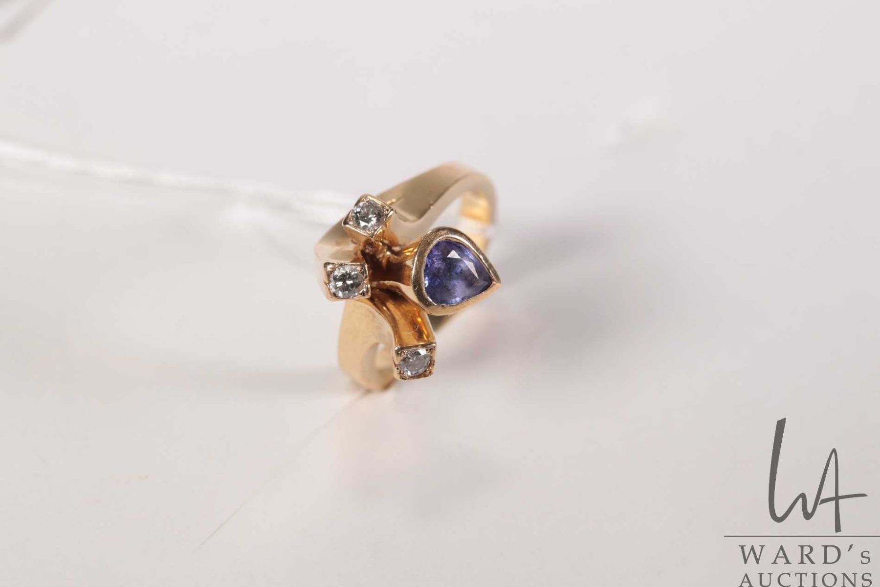 18kt yellow gold ring set with .60ct pear shaped tanzanite and .21cts of round full cut diamonds. Retail replacement value $2,100.00, size 6.5
