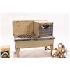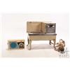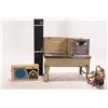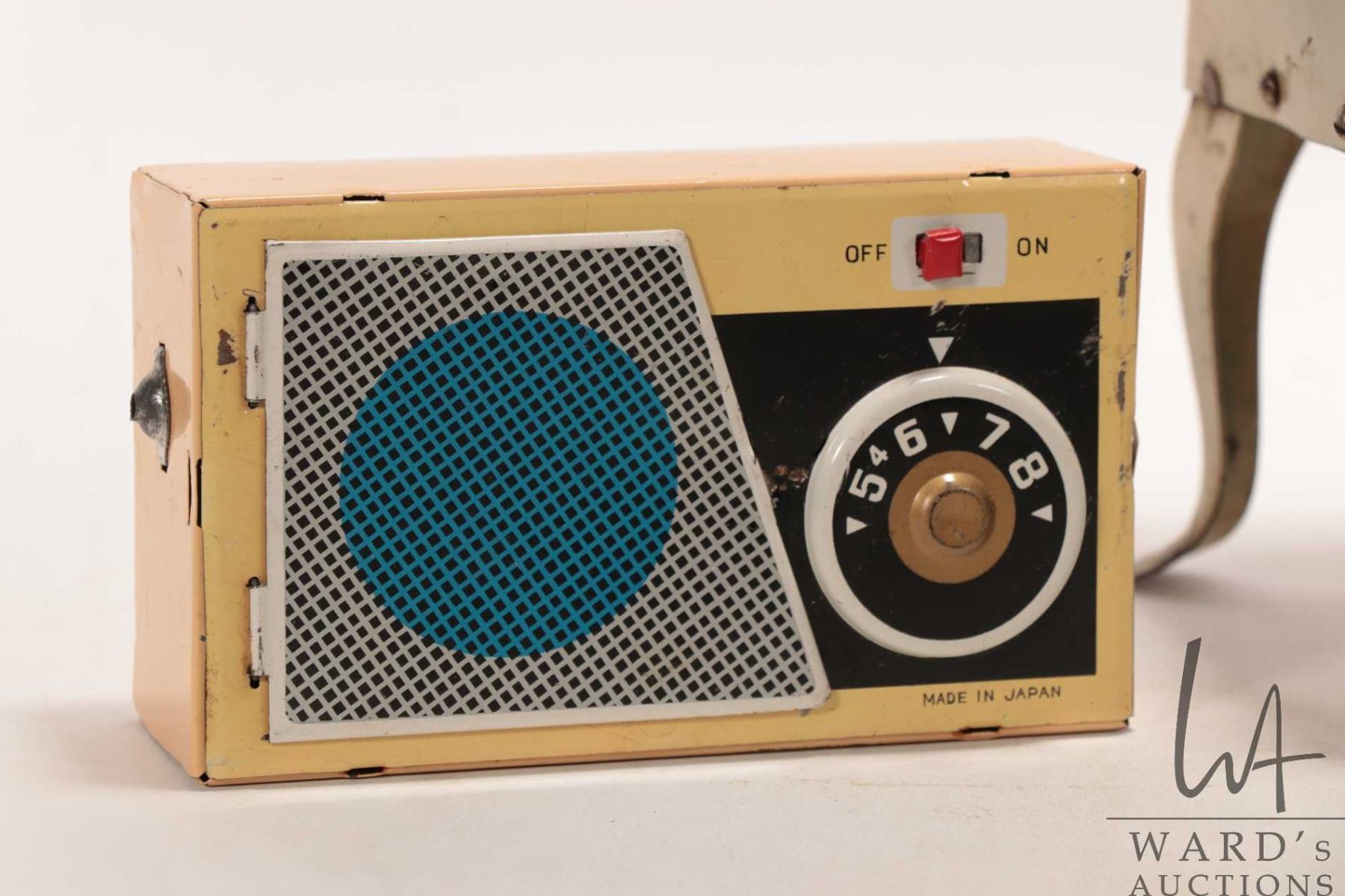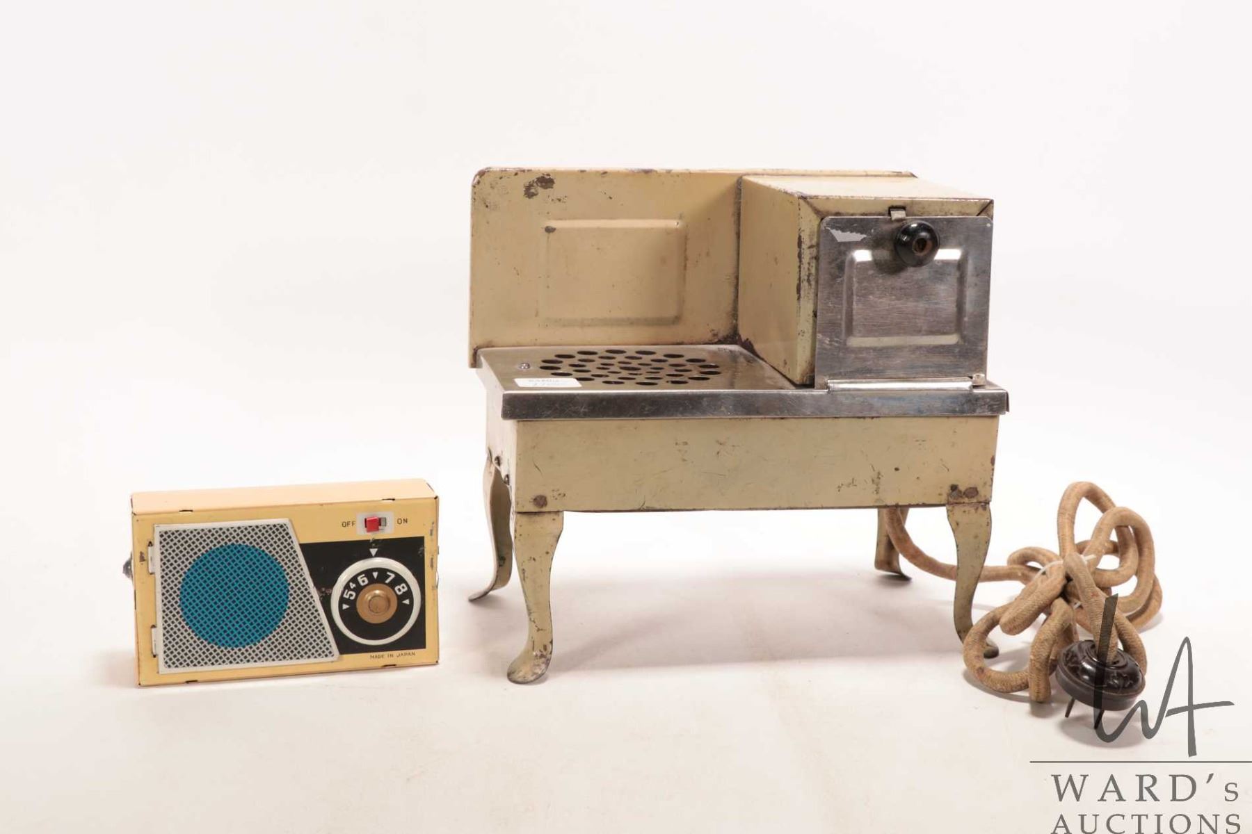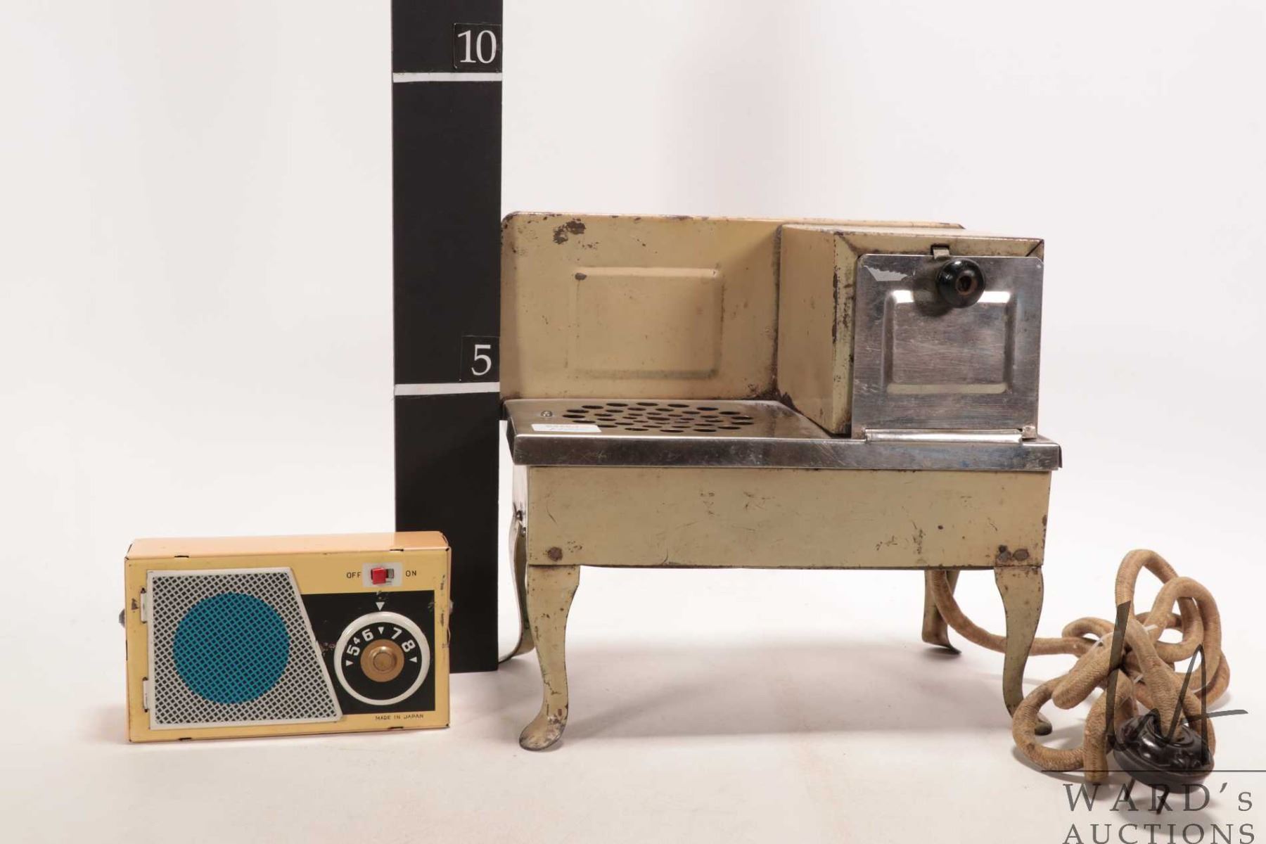 1930's metal ware electric stove 8" in height and a Japanese tin toy radio motif storage box