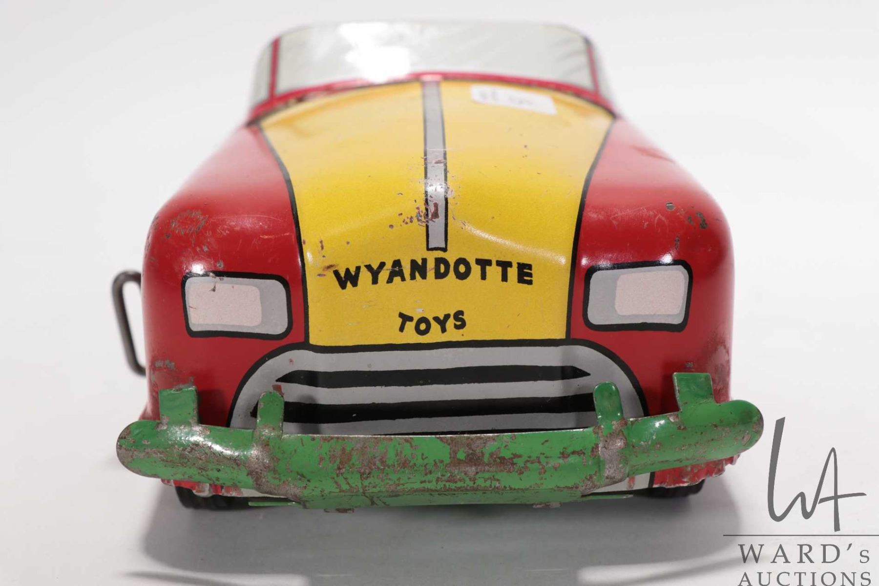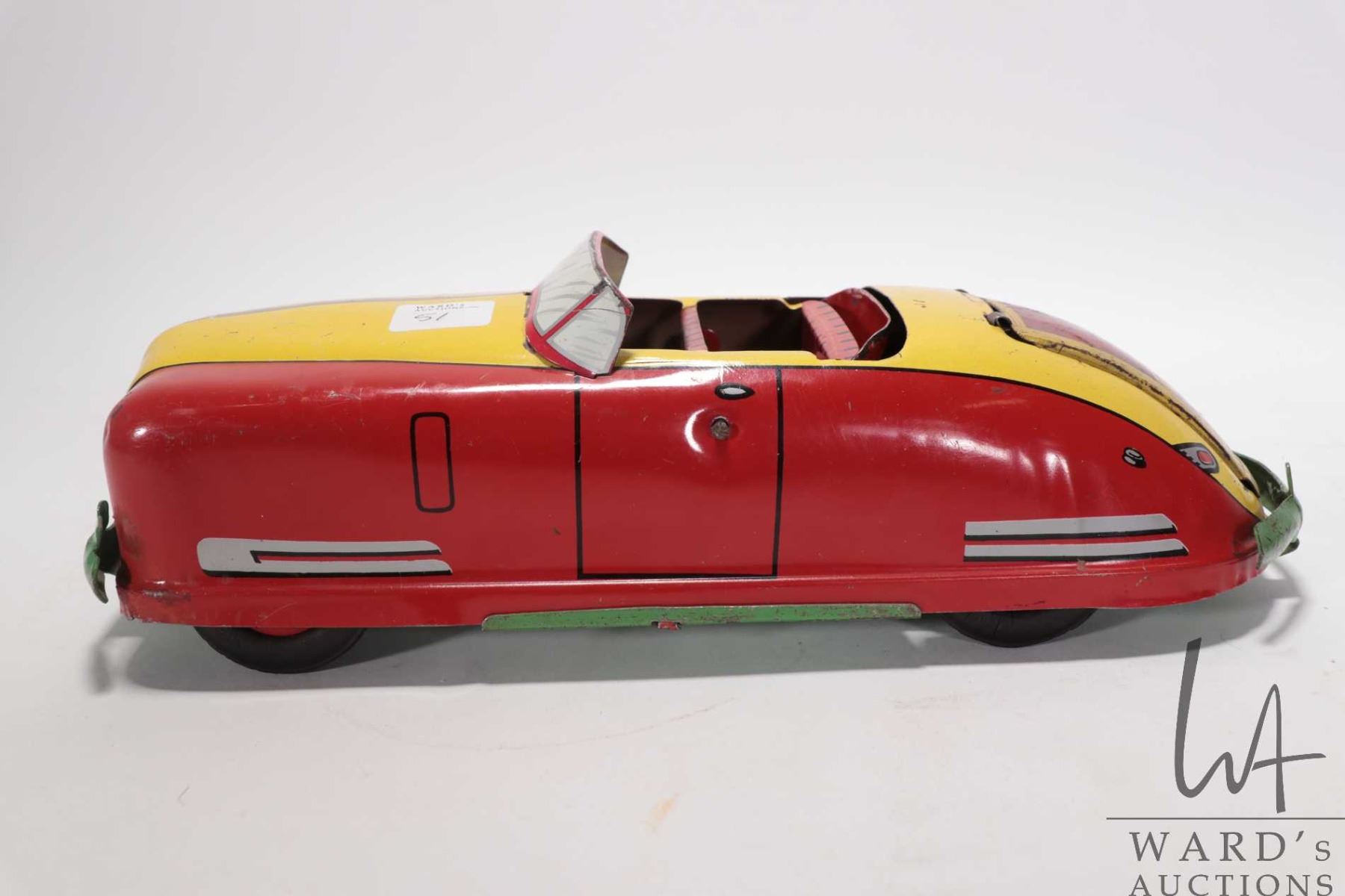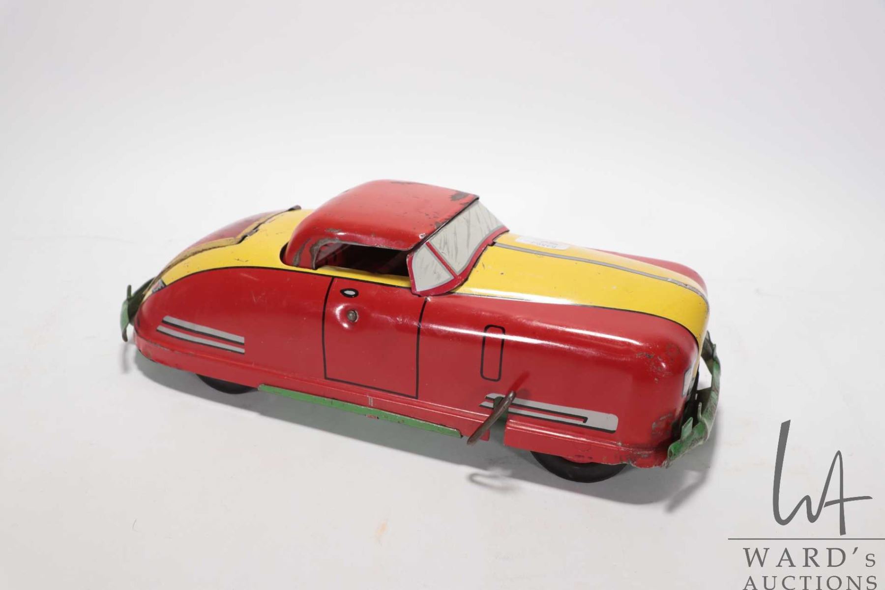 1940's tin toy by "Wyandotte" convertible car w/ windup action. Measures 13" long & 4" high. Windup action works and car moves forward when wound.