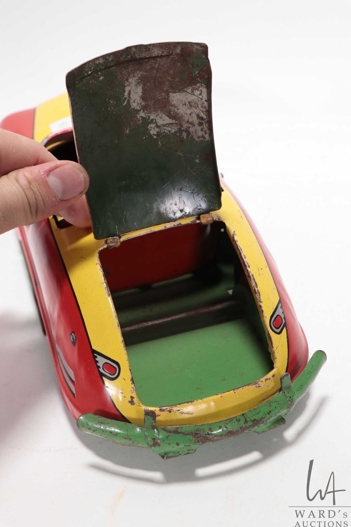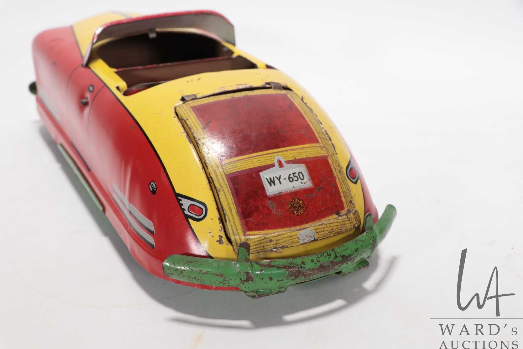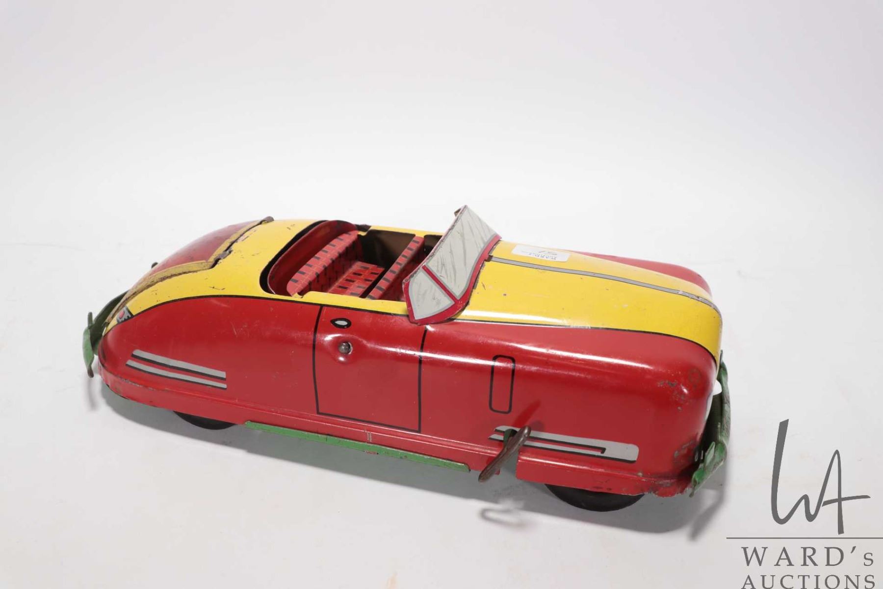 1940's tin toy by "Wyandotte" convertible car w/ windup action. Measures 13" long & 4" high. Windup action works and car moves forward when wound.