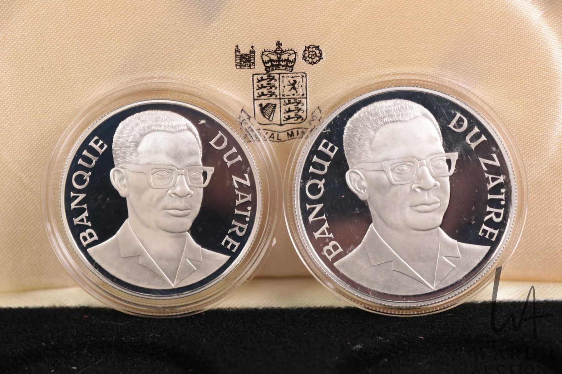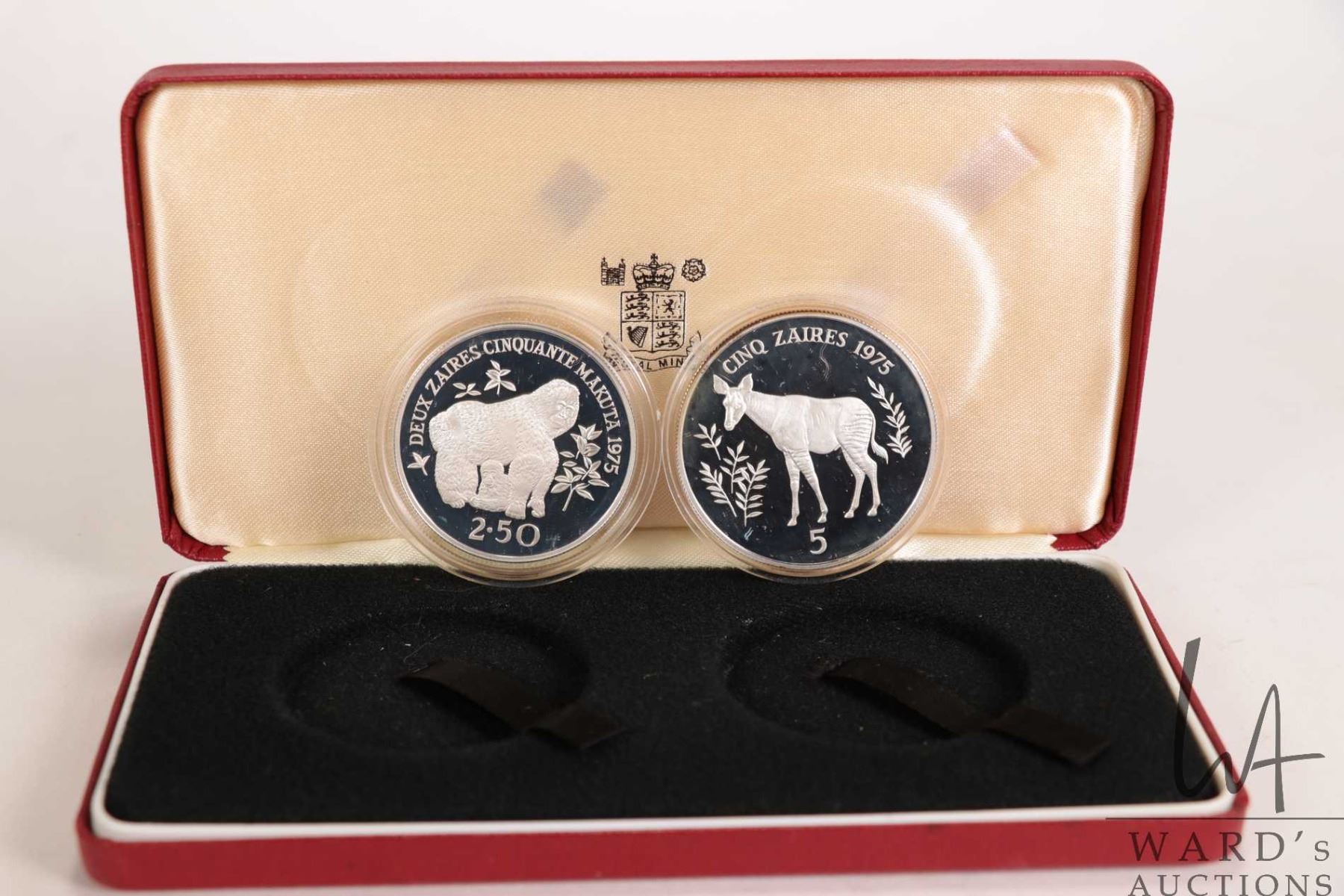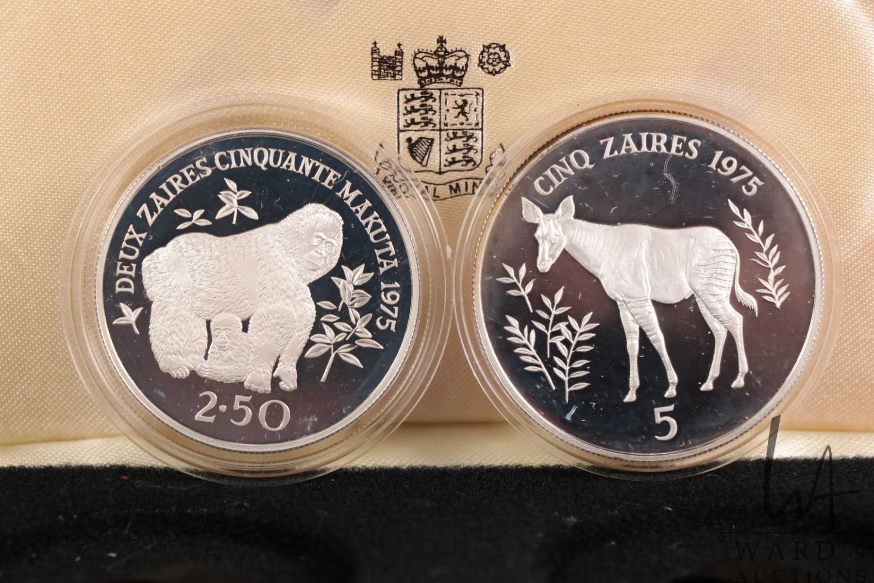 1975 Royal Mint two coin collector set including "Zaires" a $2.5 and $5 coins, each .925 sterling silver, includes presentation case