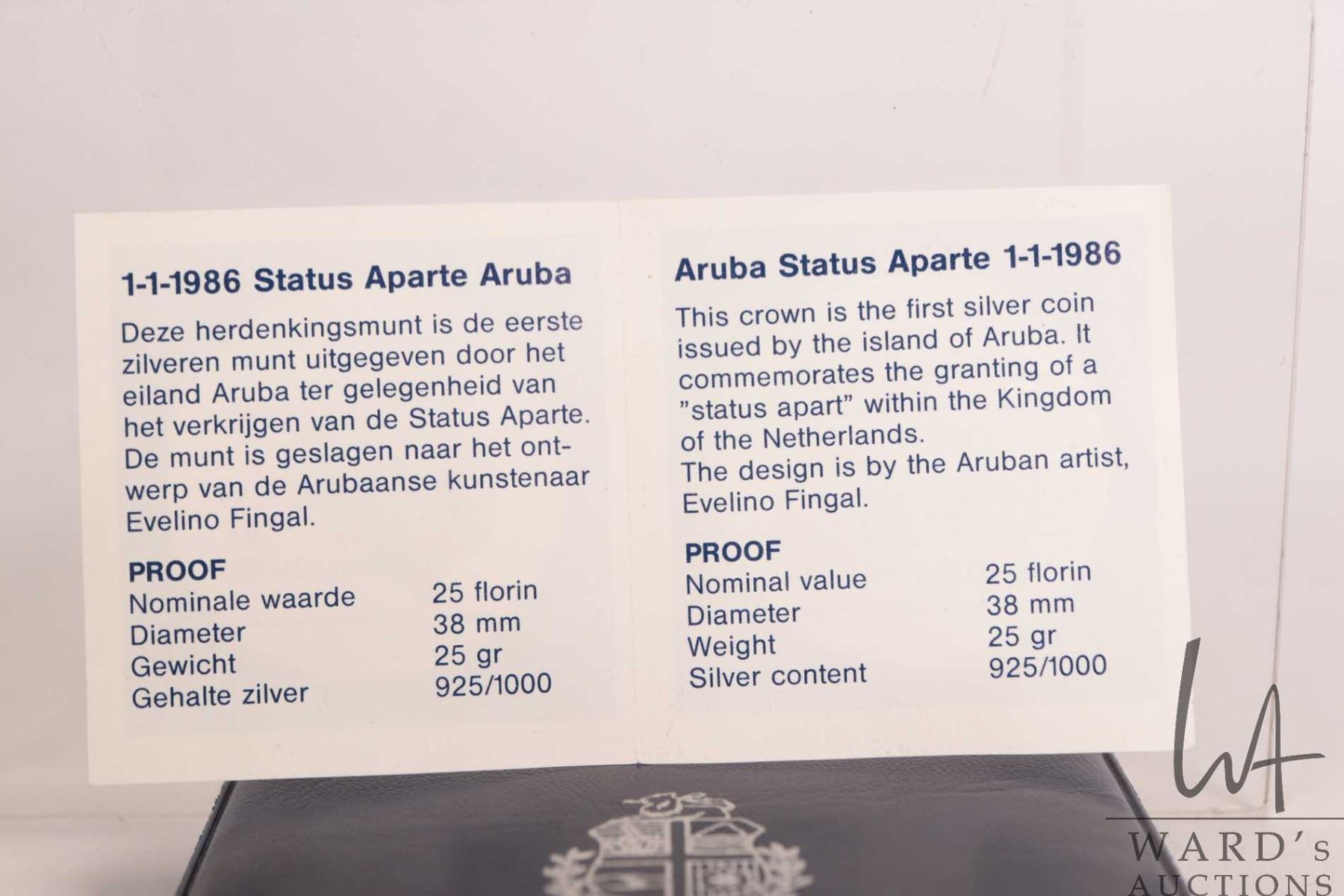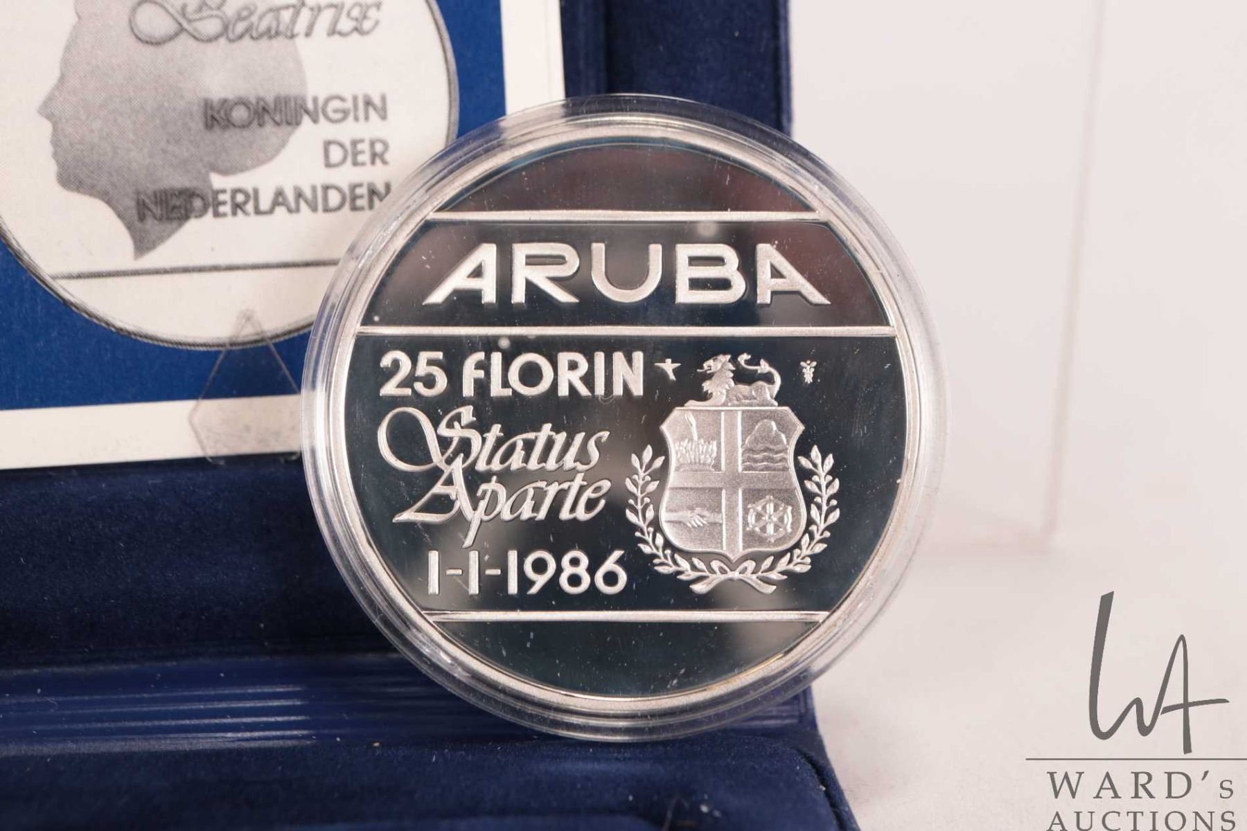 1986 "Aruba" 25 florin .925 silver coin in presentation case with certificate, issued in 1995 to com