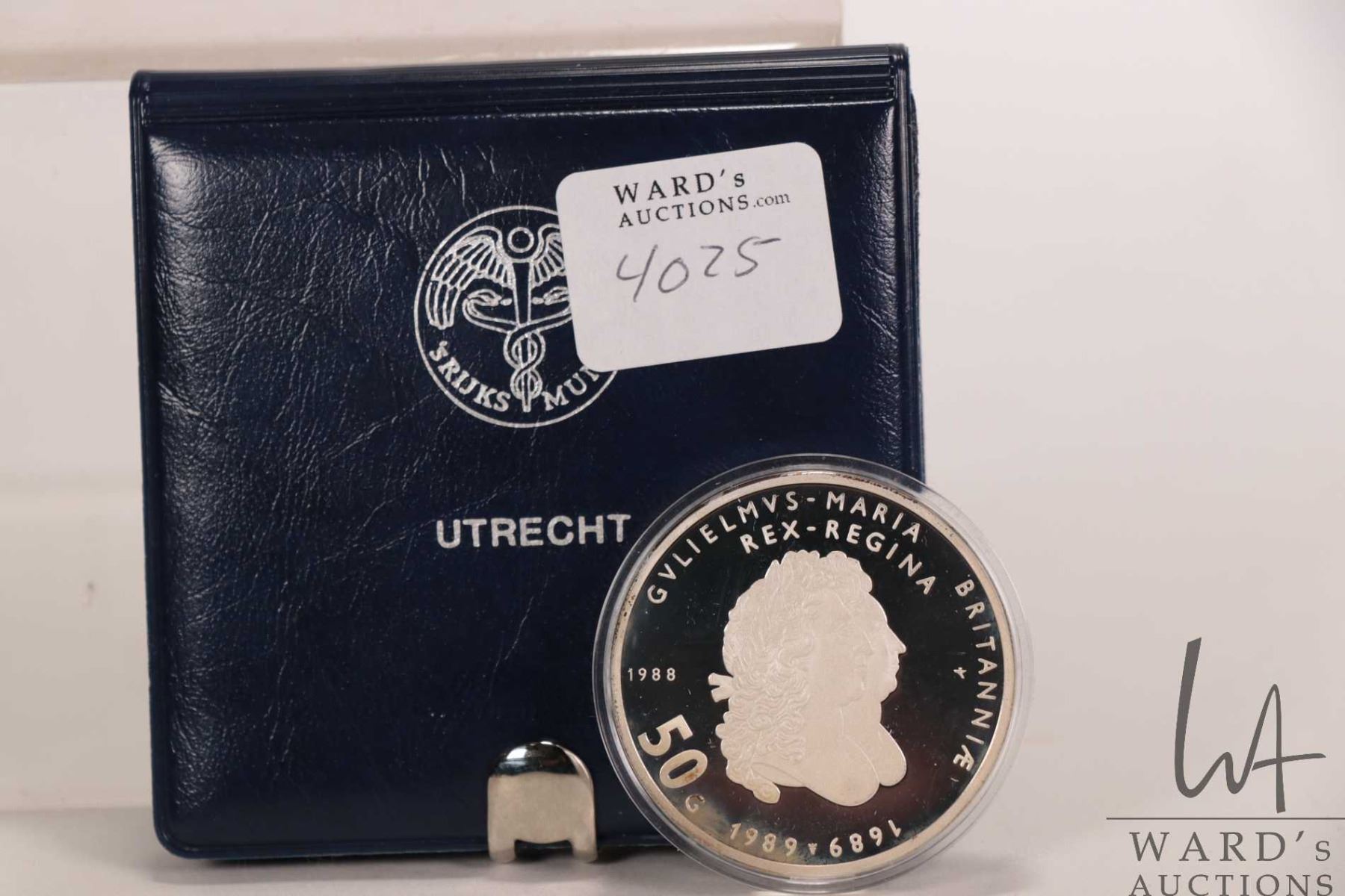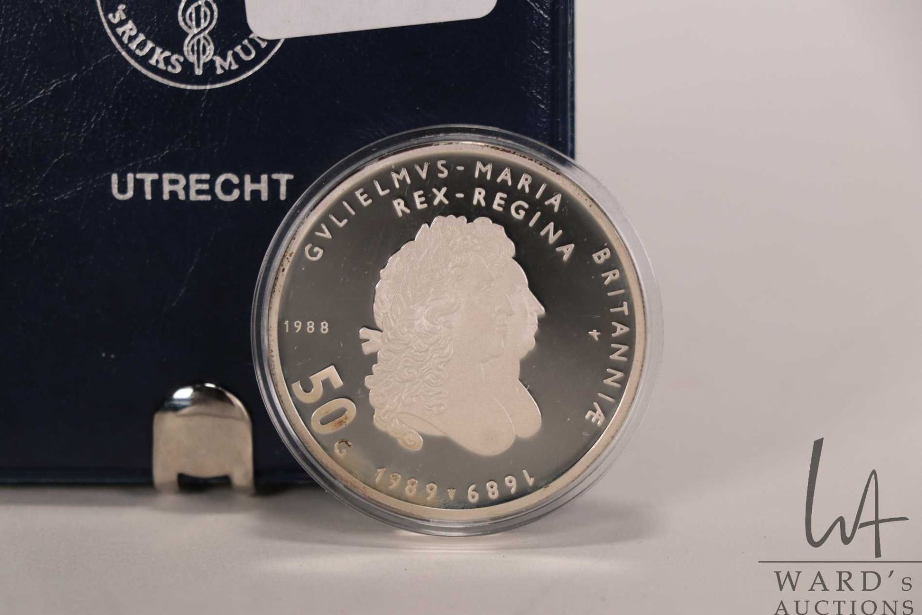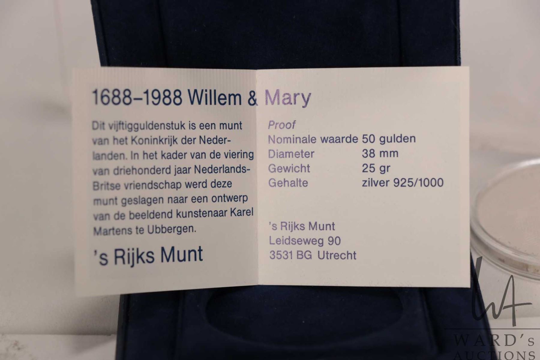 1988 Netherlands 50 gulden .925 silver coin to commemorate the 300th anniversary of the reign of King William III and Mary II, includes presentation and certificate