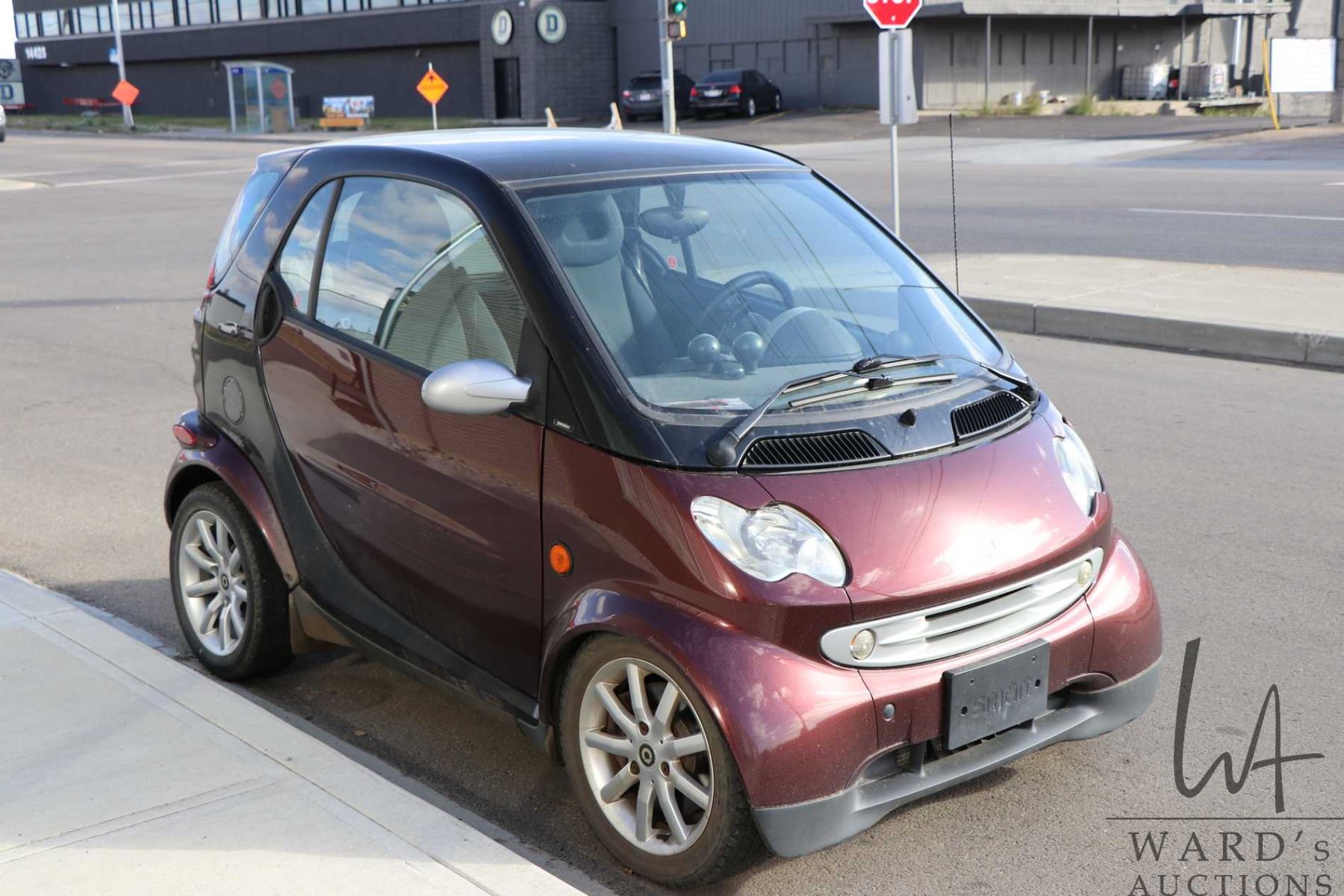 2006 Smart Car Fortwo, 6 speed automatic transmission, diesel engine, VIN: WMEAJ00F26J260264 appears to be factory ruby red pearlescent and black, 161,200 KMS, includes two sets of tires. Note: Front suspension is bottomed out, indicating broken springs.