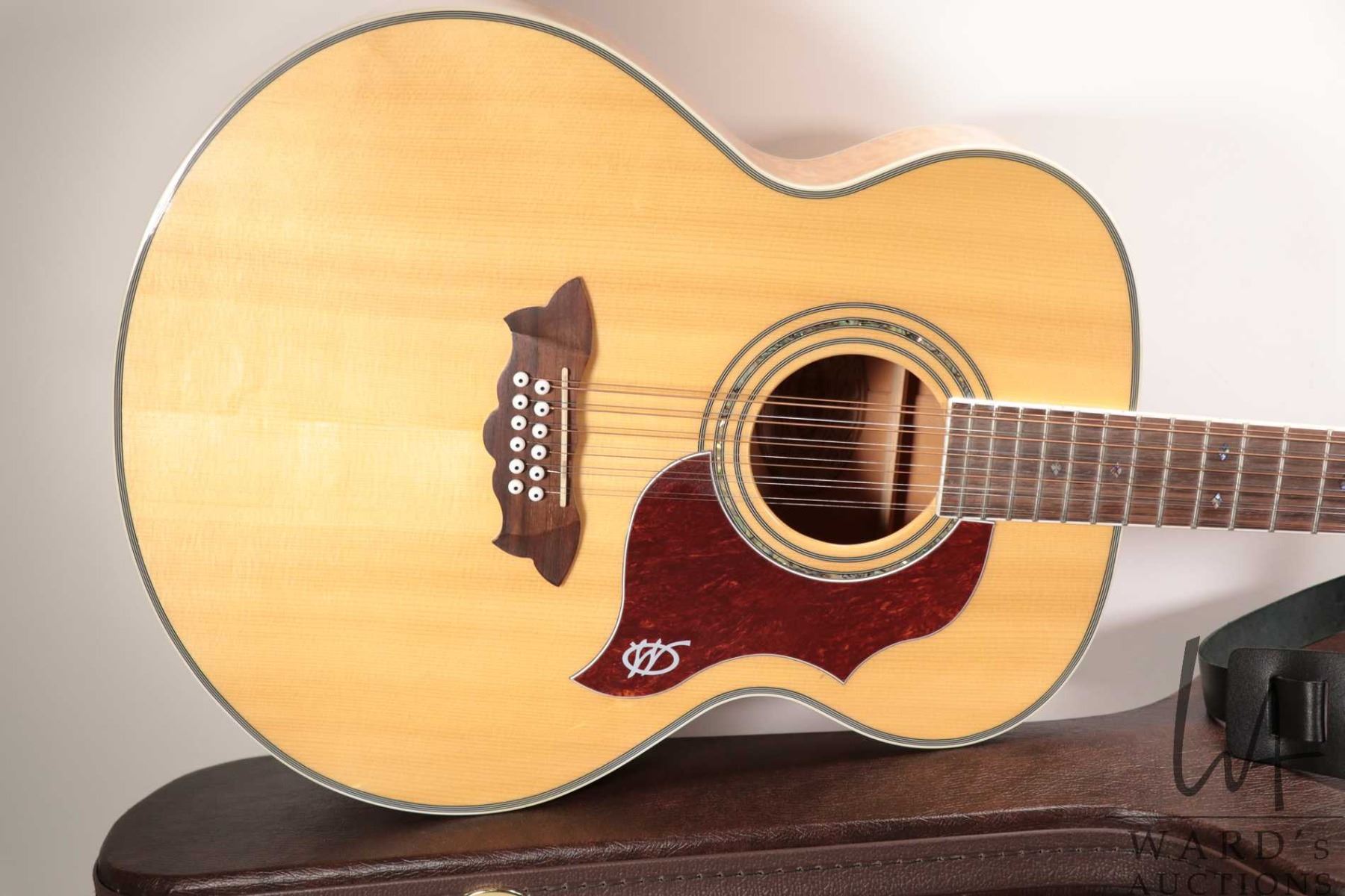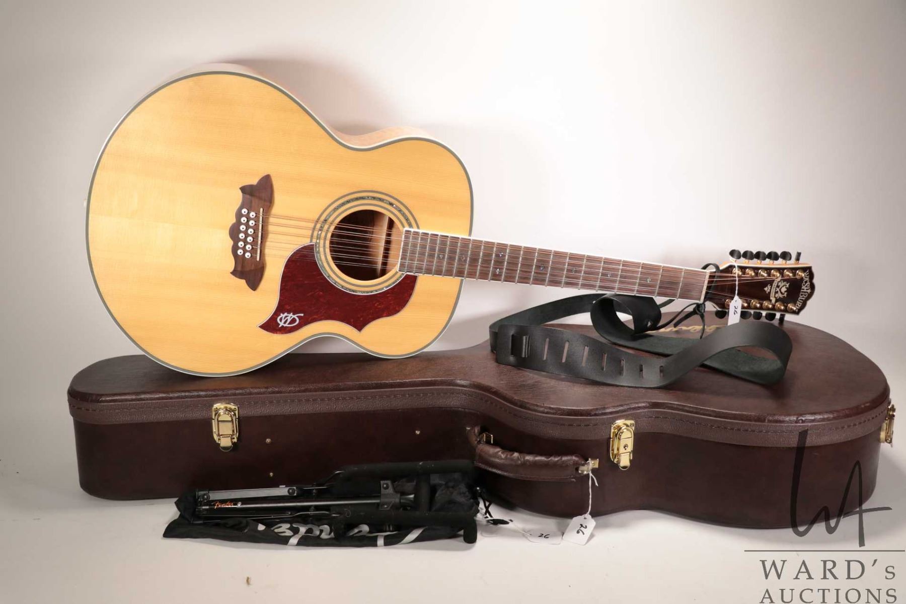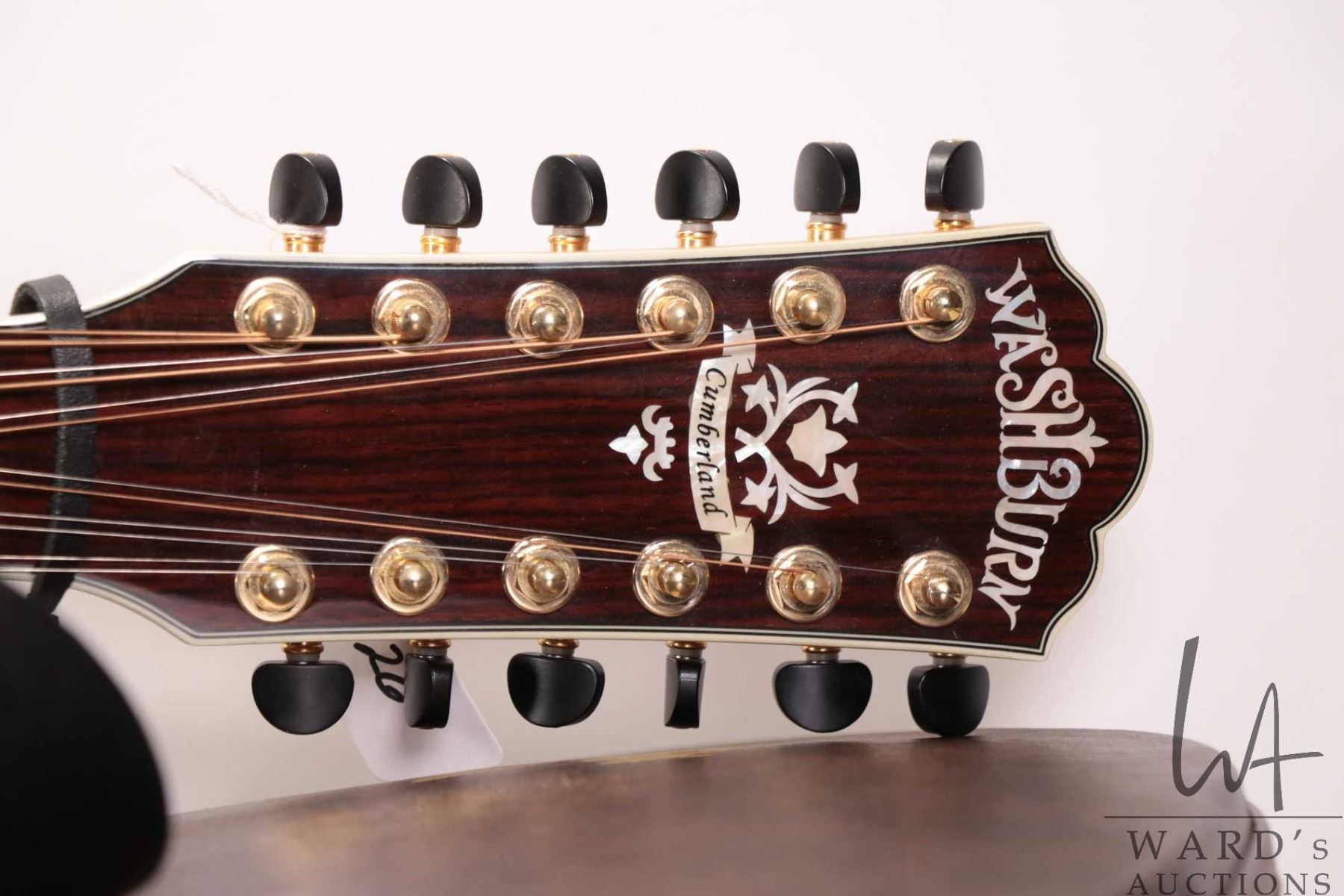 2009 Washburn J28S12DLK twelve string acoustic guitar with spruce top, quilted maple back and side, maple neck and Grover tuners. Serial no. CC090307762. Includes case, strap and guitar stand.