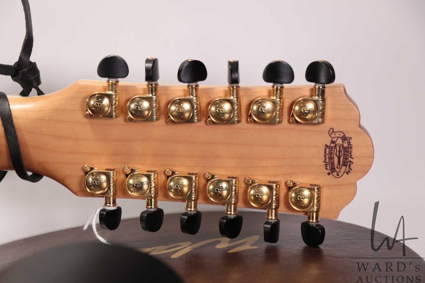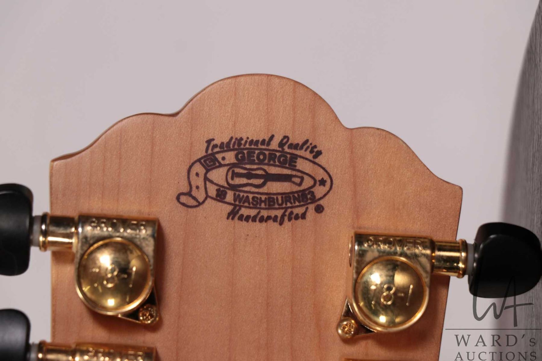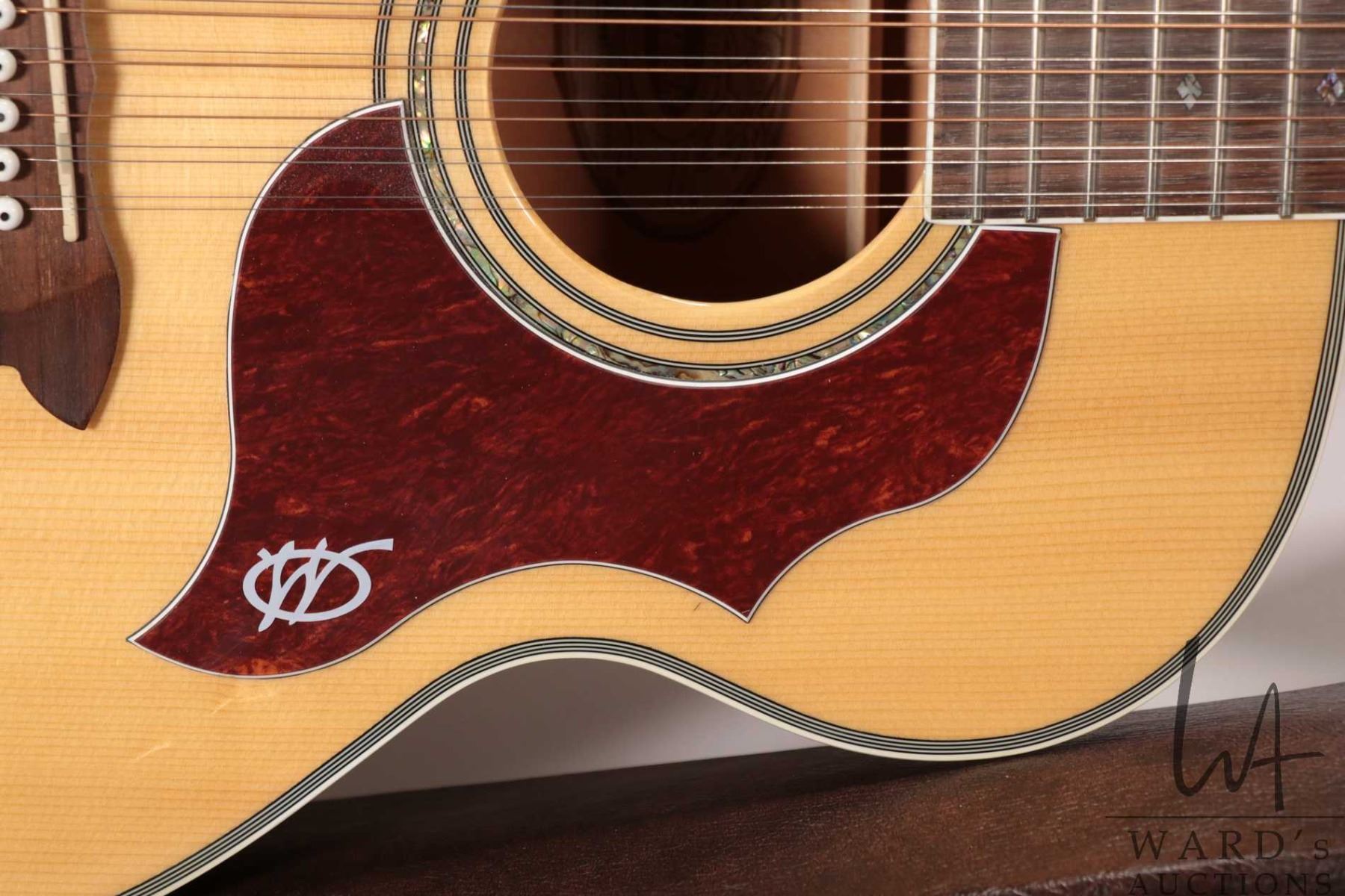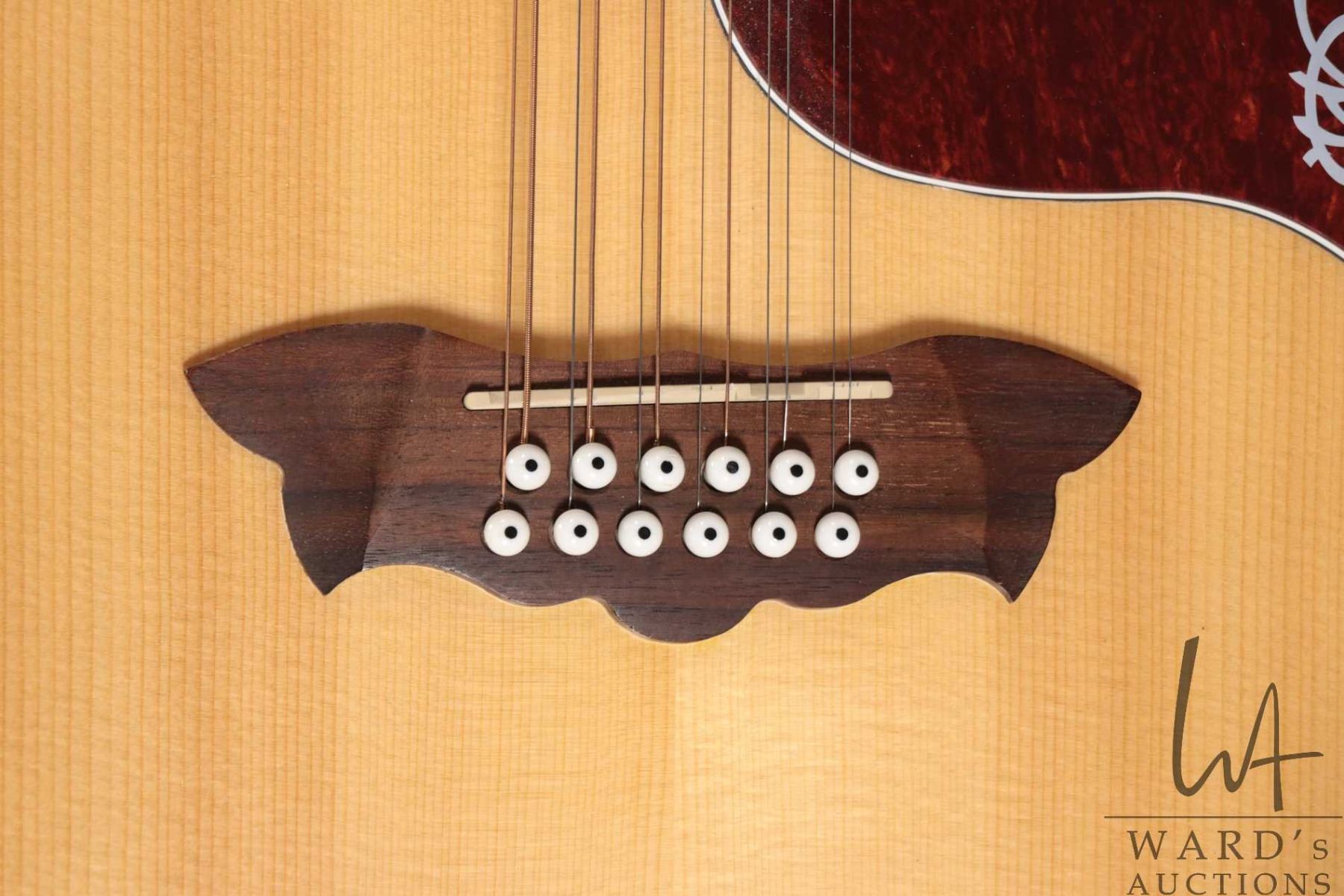 2009 Washburn J28S12DLK twelve string acoustic guitar with spruce top, quilted maple back and side, maple neck and Grover tuners. Serial no. CC090307762. Includes case, strap and guitar stand.