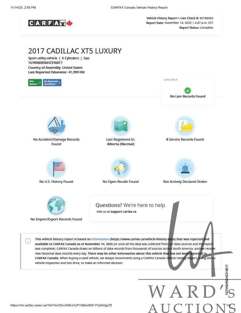 2017 Cadiallace XT5 Luxury AWD 310 HP with 8-Speed shiftable automatic transmission, All wheel drive, V6, automatic trunk, white body colour with chrome trim, an and black interior with chrome accents, Odometer reads 44272KM, VIN 1GYKNDRS6HZ316817