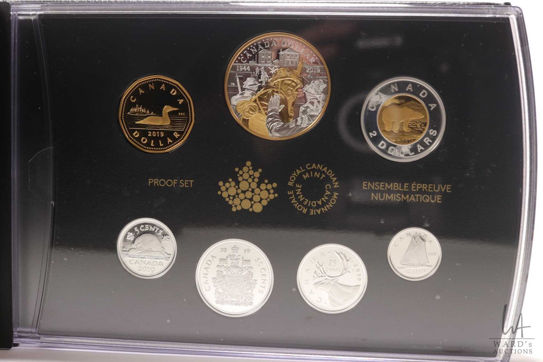2019 Royal Canadian Mint fine silver proof set "75th Anniversary of D-Day" including 99.99% pure silver dollar coin, Polar bear fine silver coin with gold plated inner core, pure silver and gold plated loonie cin, plus pure silver 50 cent, 10 cent and 5 cent coins, all in a presenation case with original box