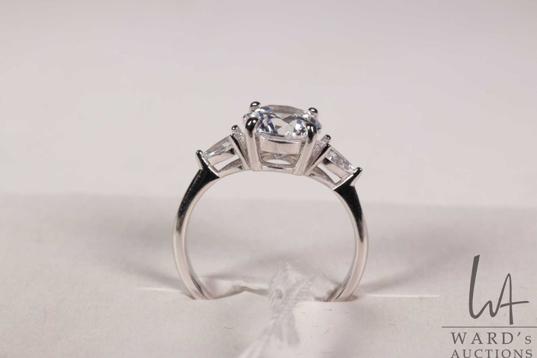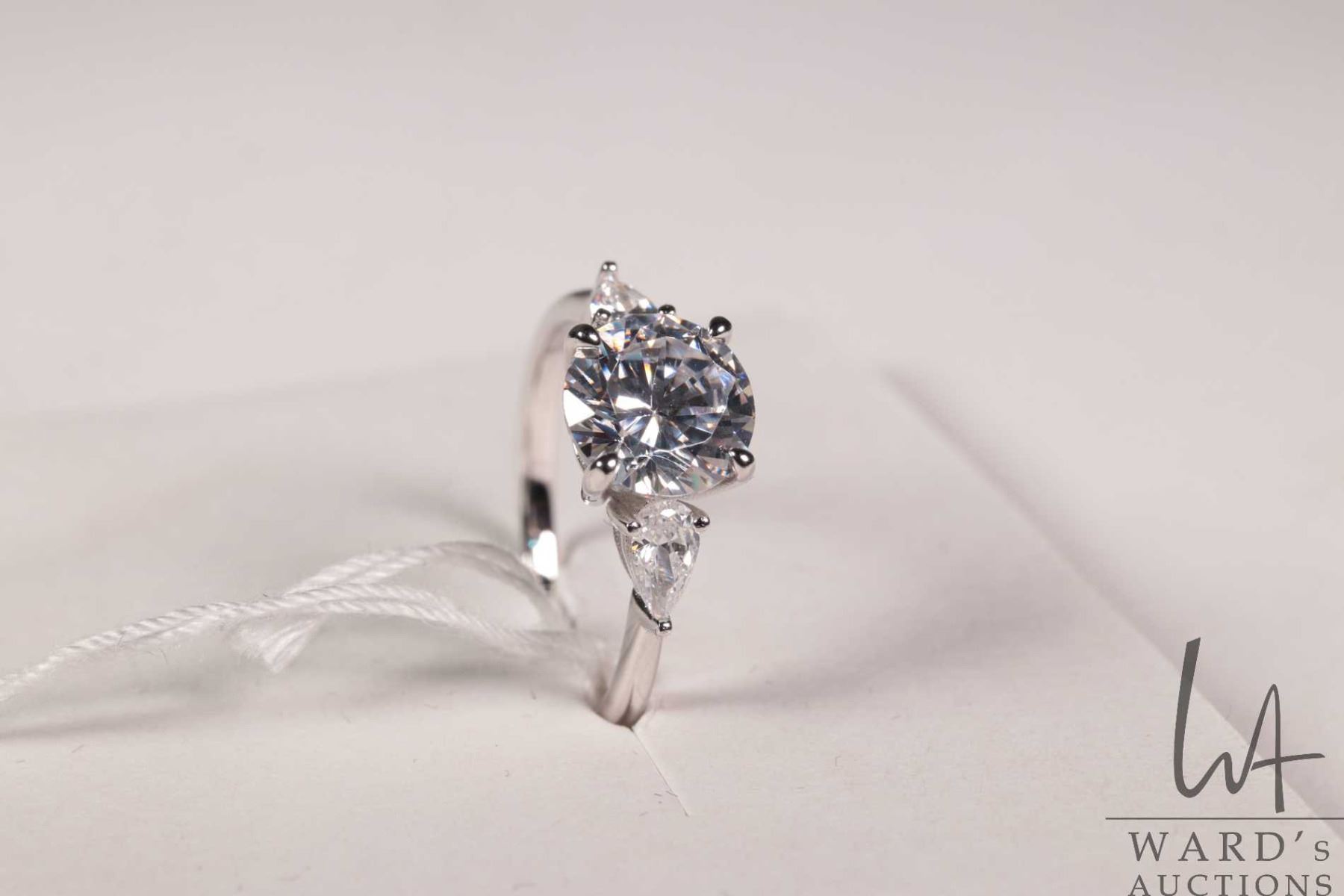 2ct lab created sapphire trinity ring white pear side stones, mounted in sterling silver with white