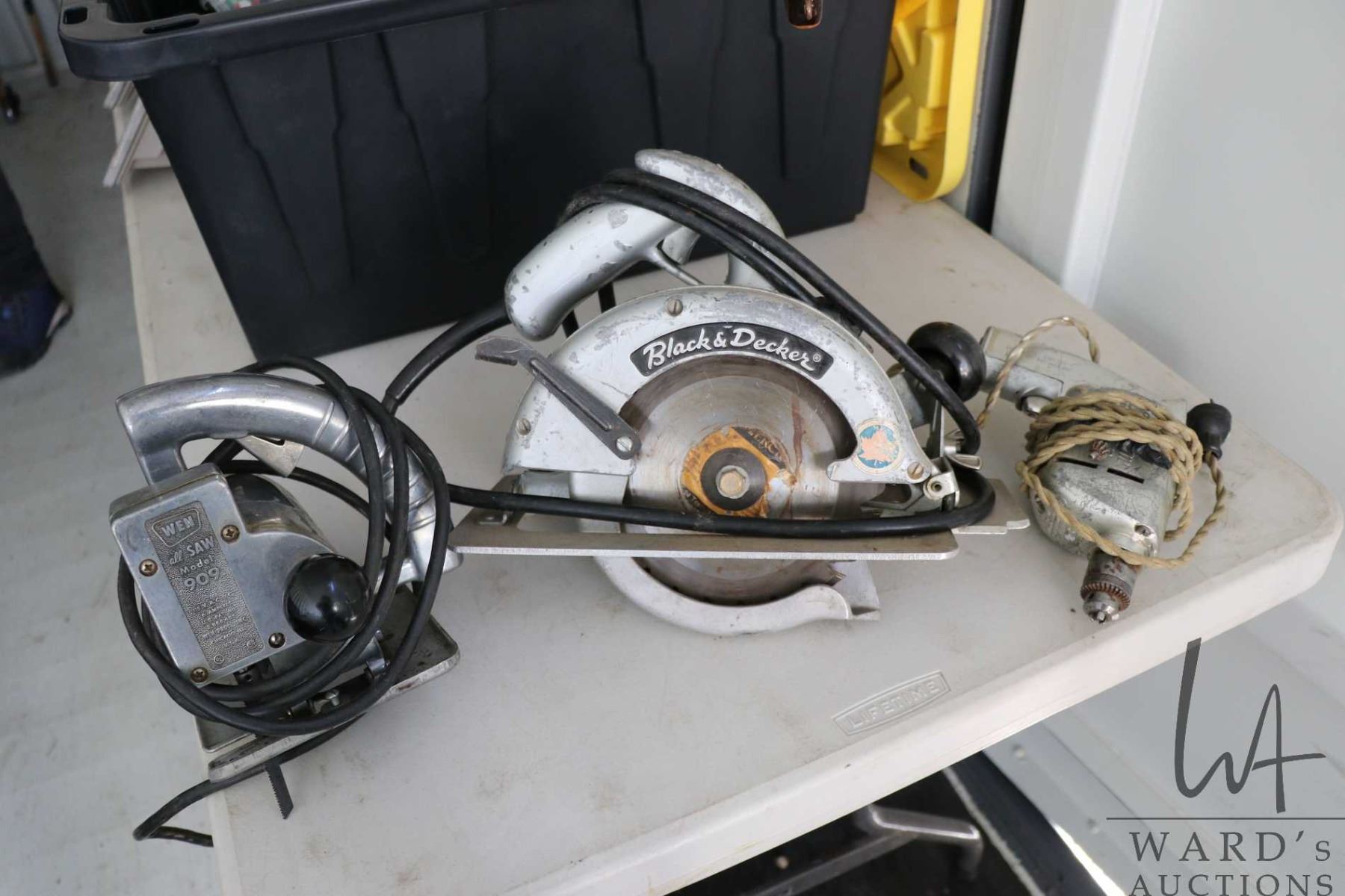 3 vintage silver power tools including a Black and Decker circular saw, a WEN Model 909 All Saw, and a small corded power drill with braided cable