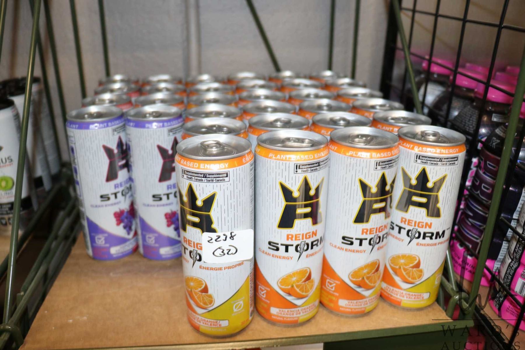32 355ml cans of Reign Storm energy drink including 2 harvest grape, 3 peach nectarine and 27 Valenc