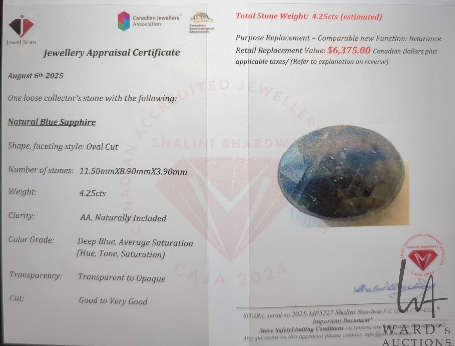 4.25 ct certified Blue Sapphire gemstone, Certificate provided by consignor
