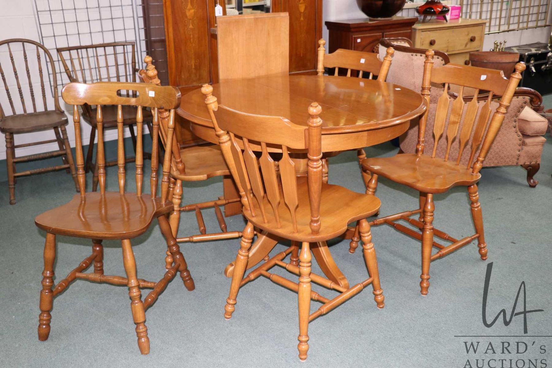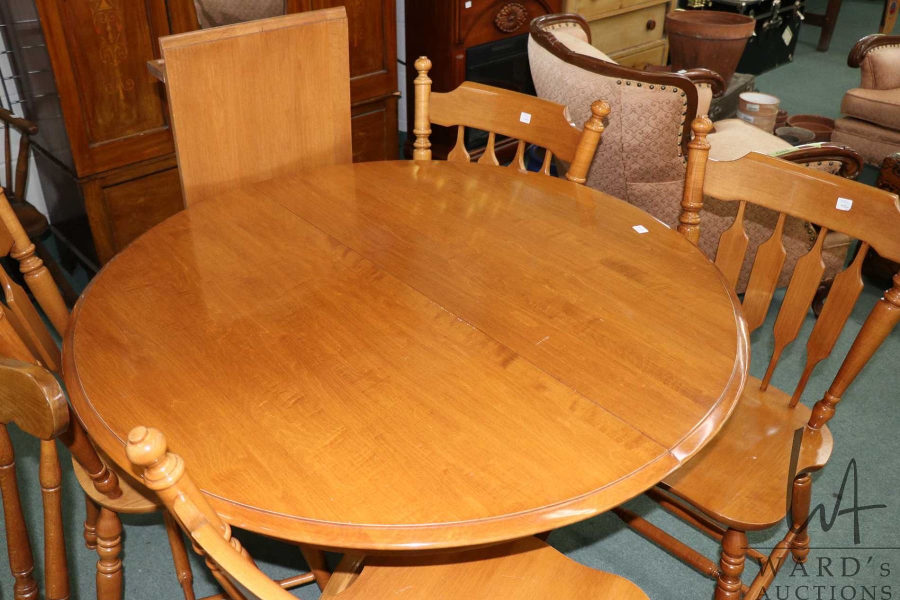 40" diameter center pedestal maple dinette table with one 15" skirted leaf and four arrow back chairs, all made by Roxton plus an addition non-matching maple dining chair