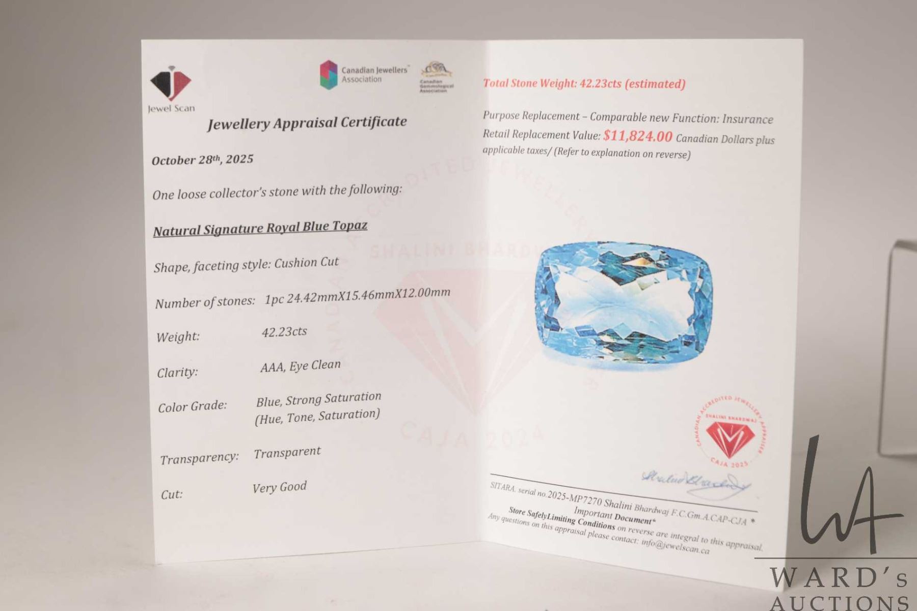 42.23 ct. Royal blue Topaz cushion cut gemstone with certificate provided by consignor