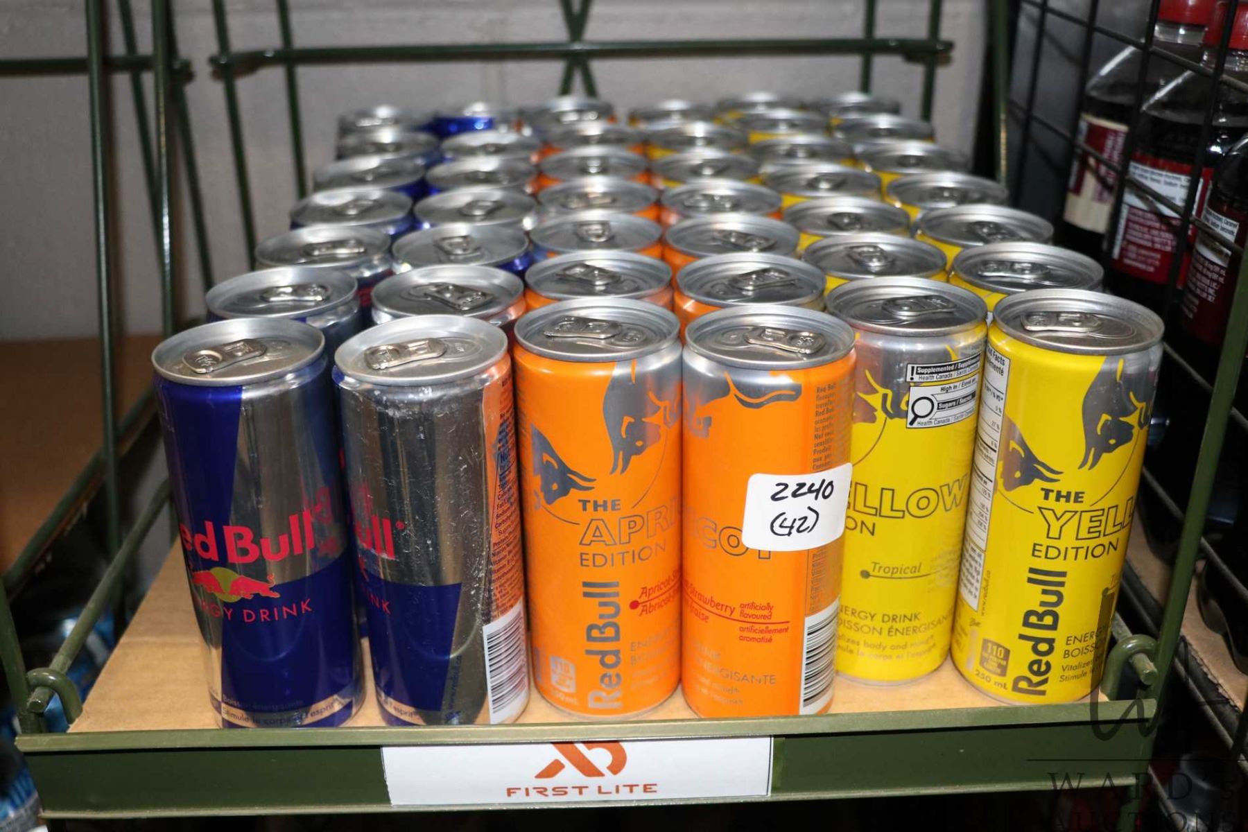 42 250ml cans of Red Bull energy drink including 14 regular, 11 apricot strawberry and 17 tropical yellow edition
