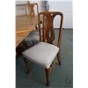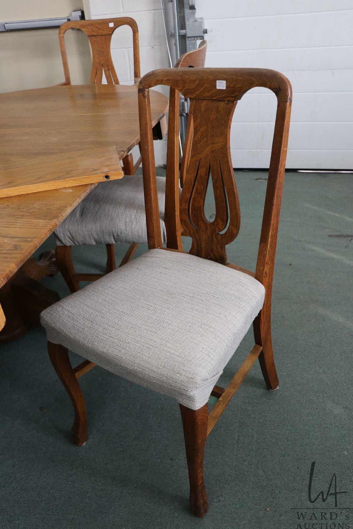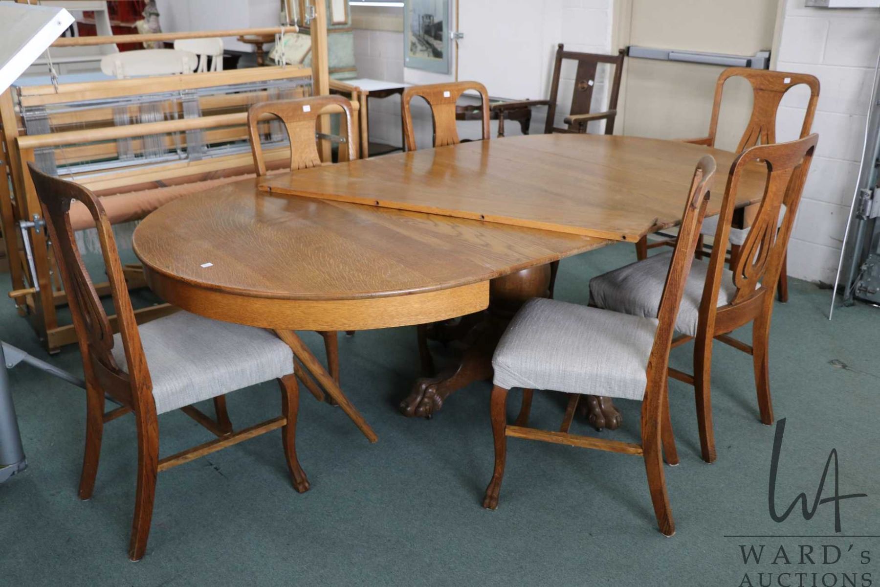 48" diameter center pedestal Canadiana dining table with seven 8" insert leaves, carved paw feet, drop down support legs for when extended and six upholstered seat dining chairs including one carver