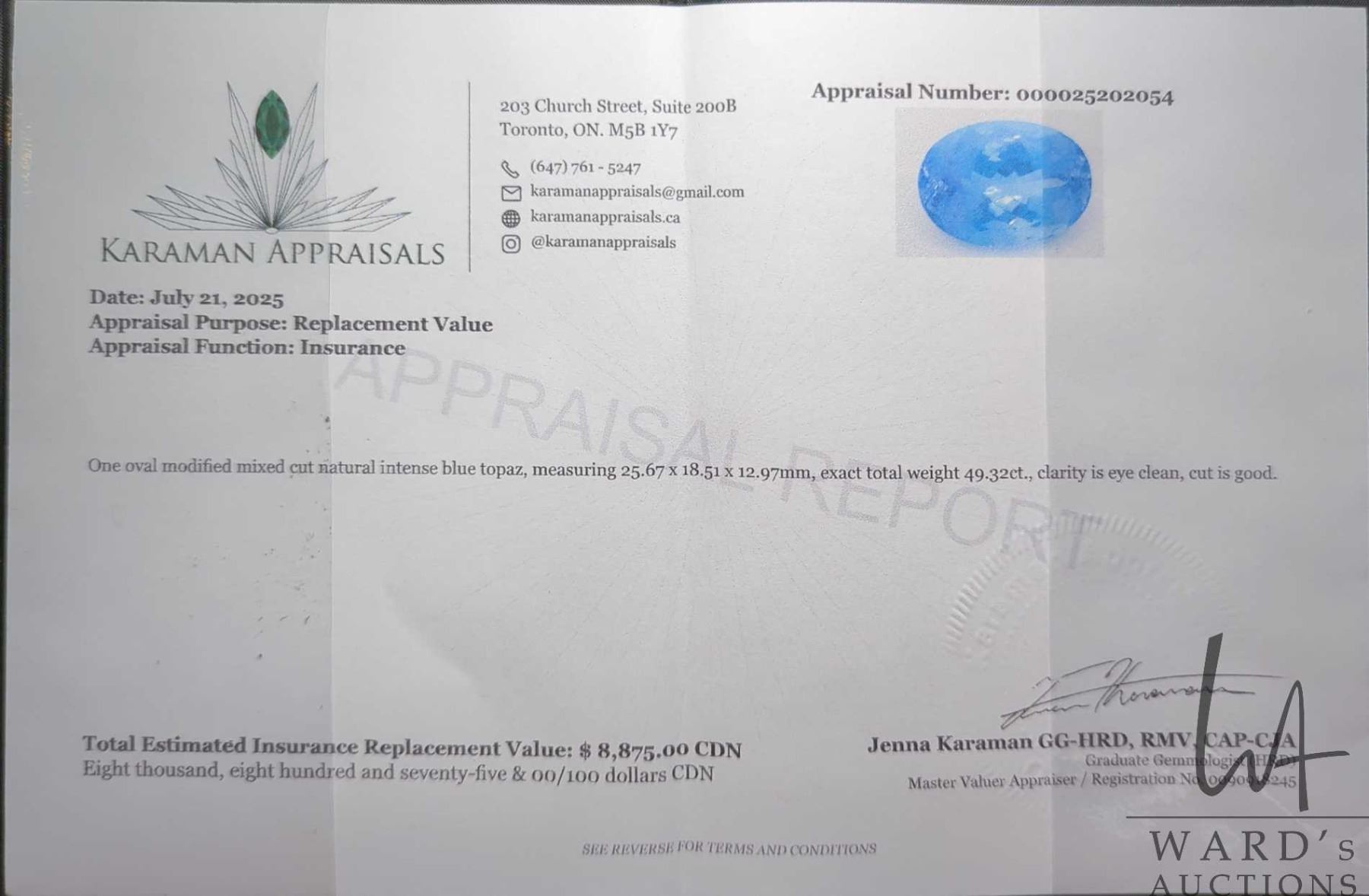 49.32 ct Certified Royal Blue Topaz gemstone , Certificate provided by consignor