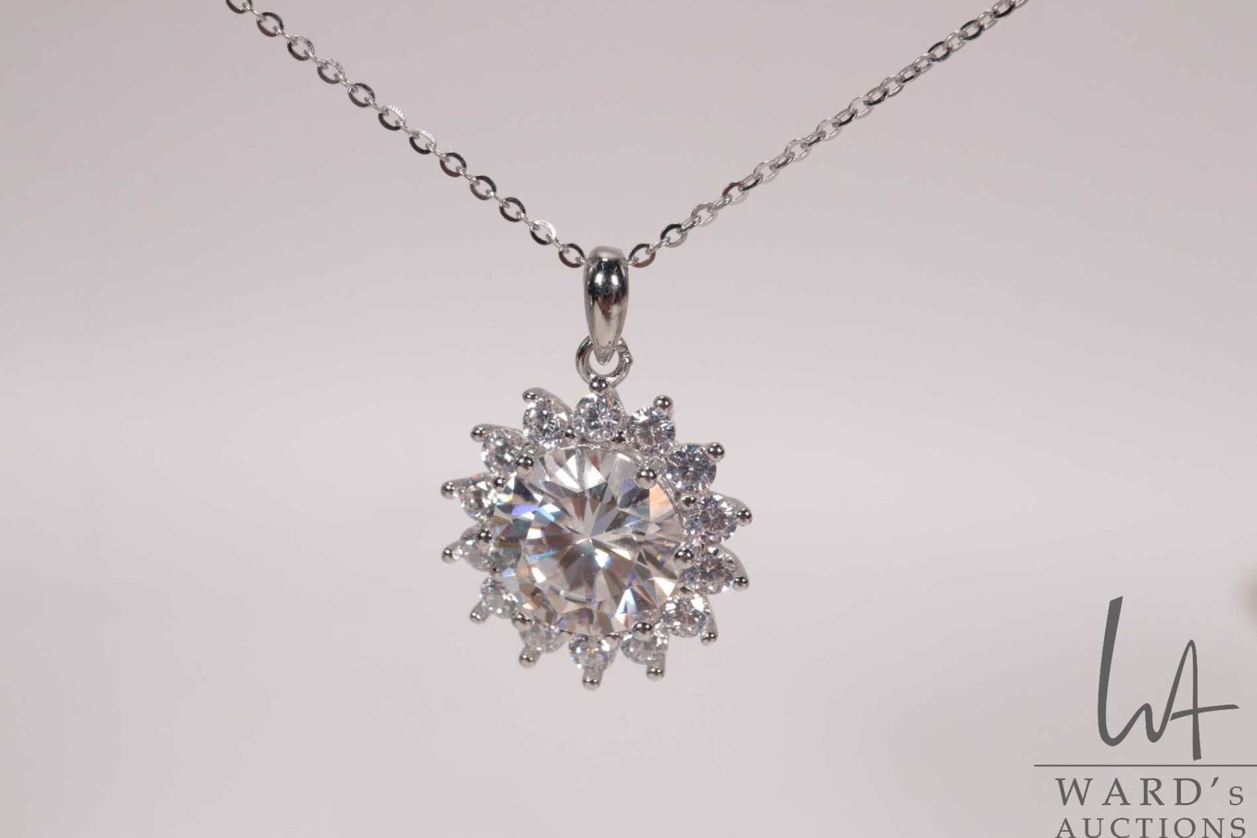 5.0ct Moissanite necklace set in sterling silver mount with white gold overlay, includes GRA cert
