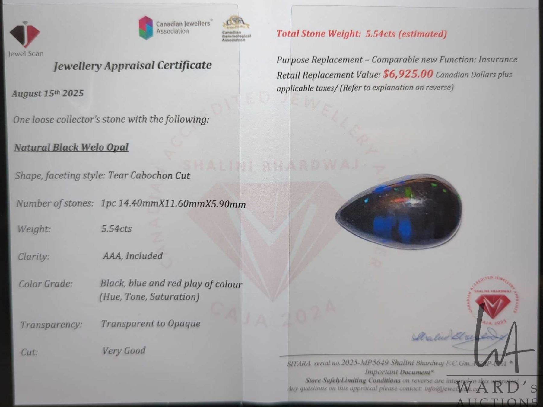 5.54 ct certified Black Opal gemstone, Certificate provided by consignor