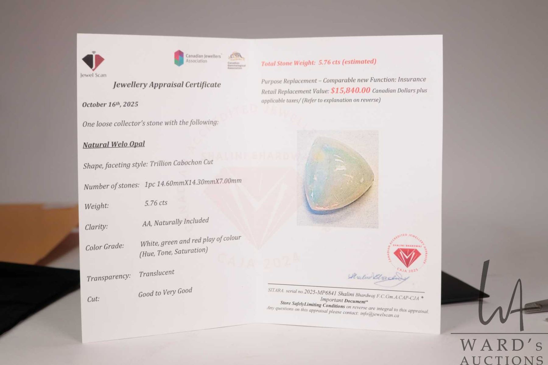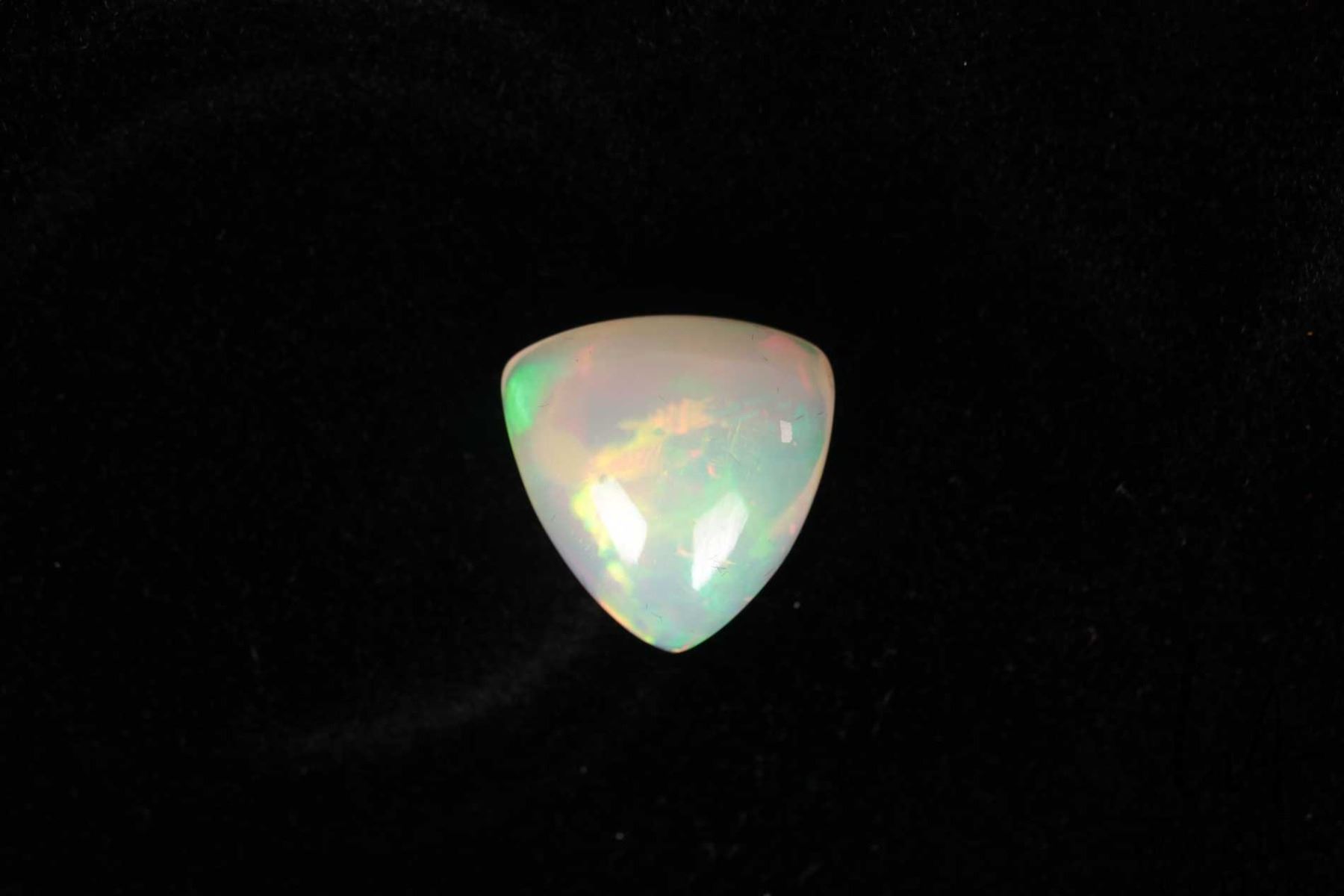 5.76 ct. natural Welo opal trillion cabochon cut gemstone with certificate provided by consignor